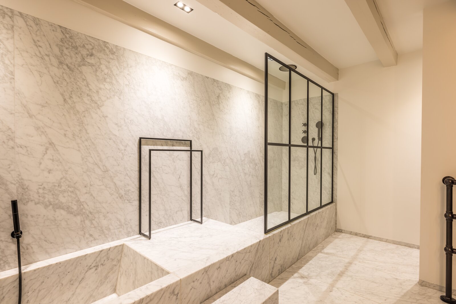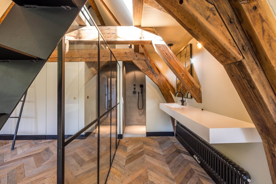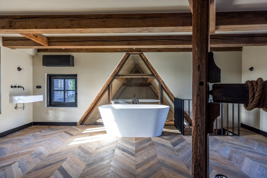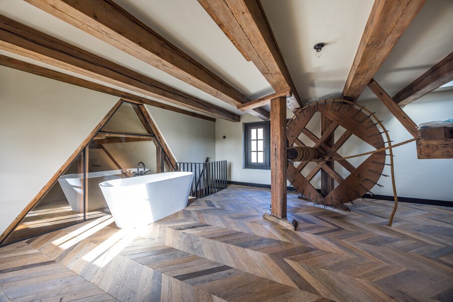 De derde verdieping is voorzien van een spectaculair slaapvertrek met ligbad en wastafel.