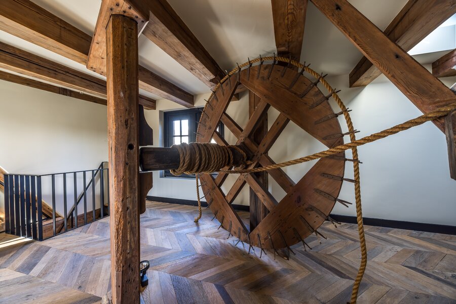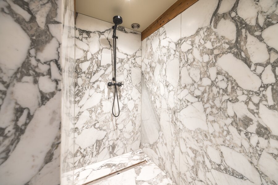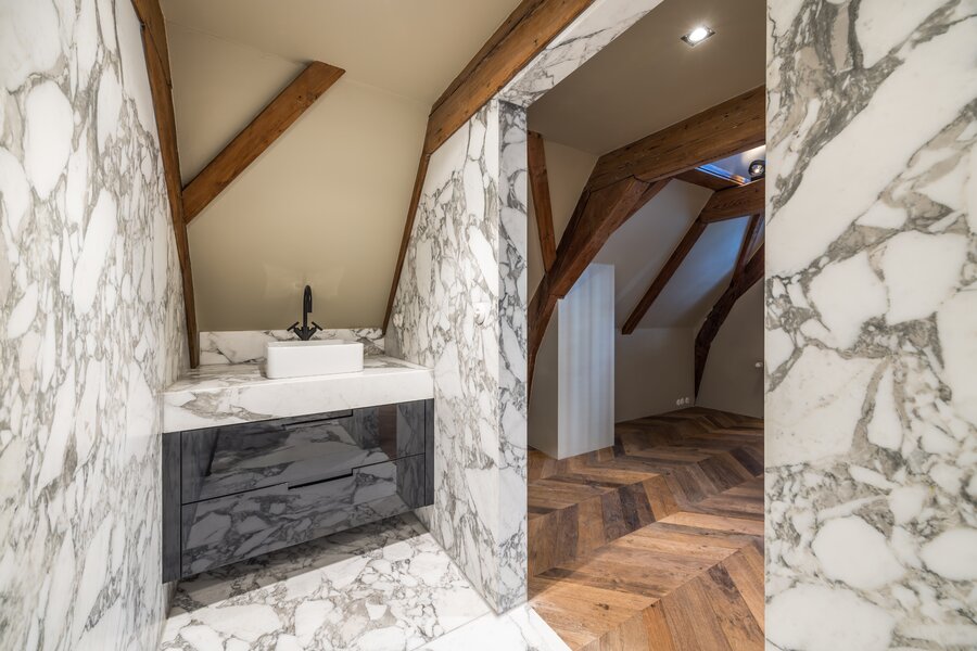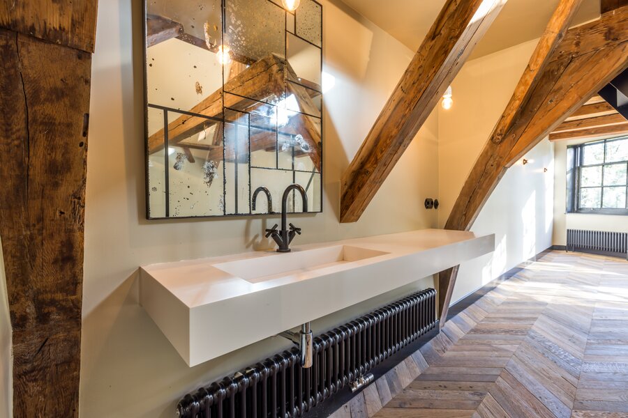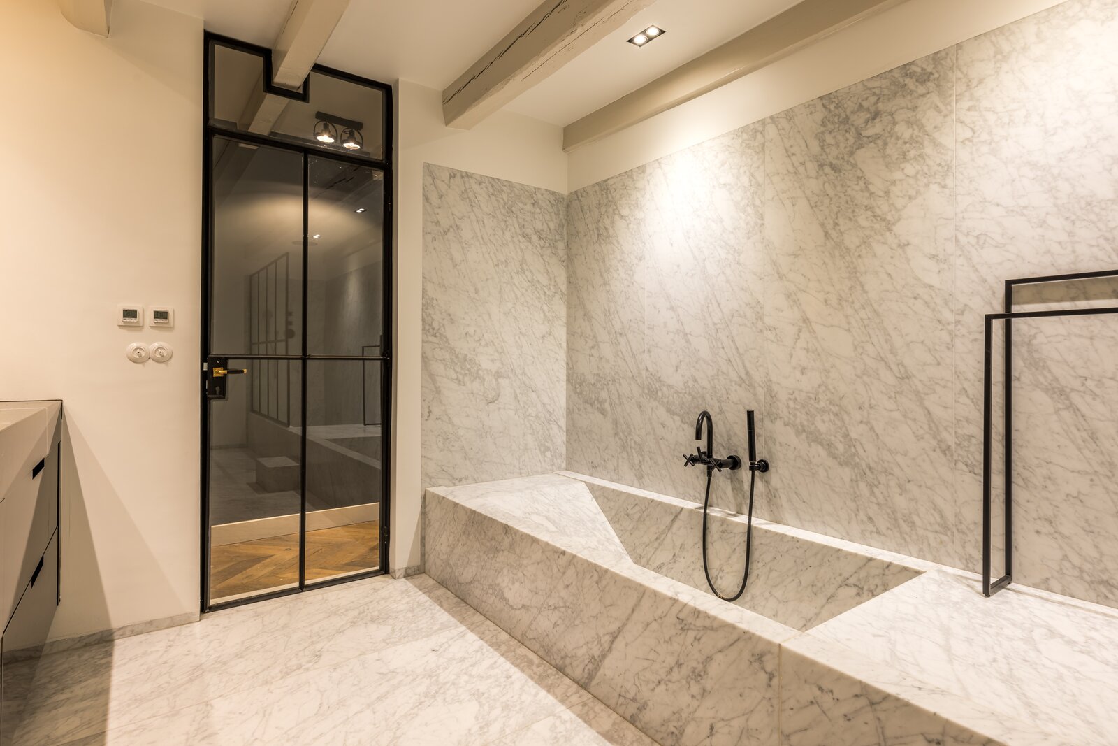 De derde verdieping is voorzien van een spectaculair slaapvertrek met ligbad en wastafel.