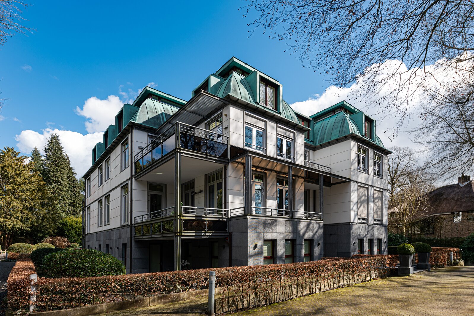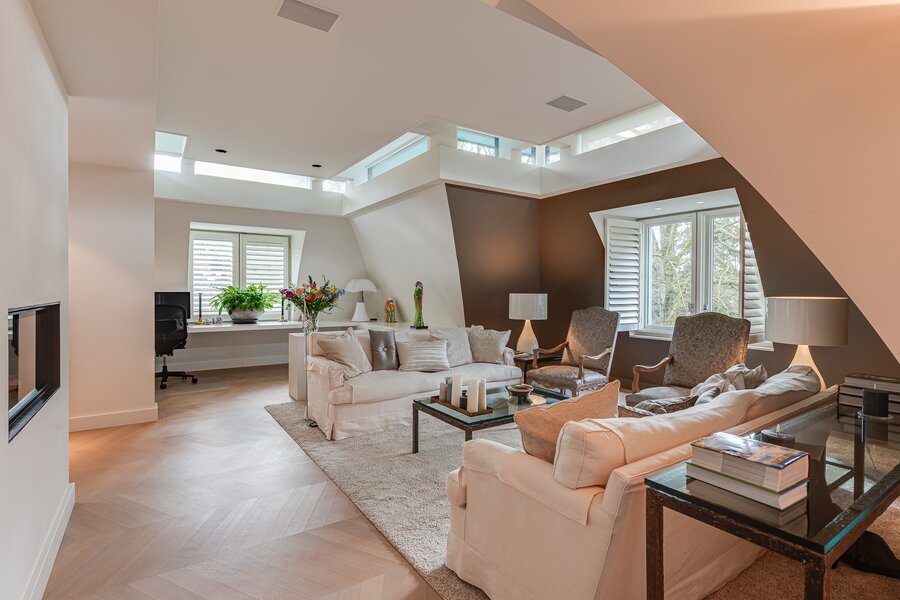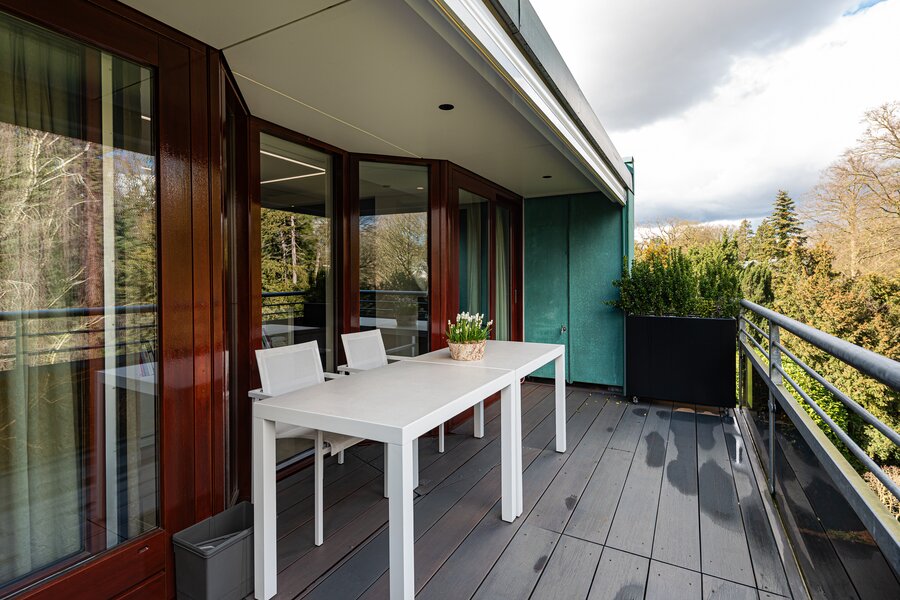 The small-scale apartment building *Residentie Beatrijs* is equipped with an elevator and houses just seven villa-style apartments. Designed by architect Jan Griffioen, the building combines contemporary architecture with the charm of classic Baarn villas. It is surrounded by a professionally landscaped park garden featuring mature trees, flower beds, walking paths, rolling lawns, and even a tea house. The penthouse occupies the entire top floor.