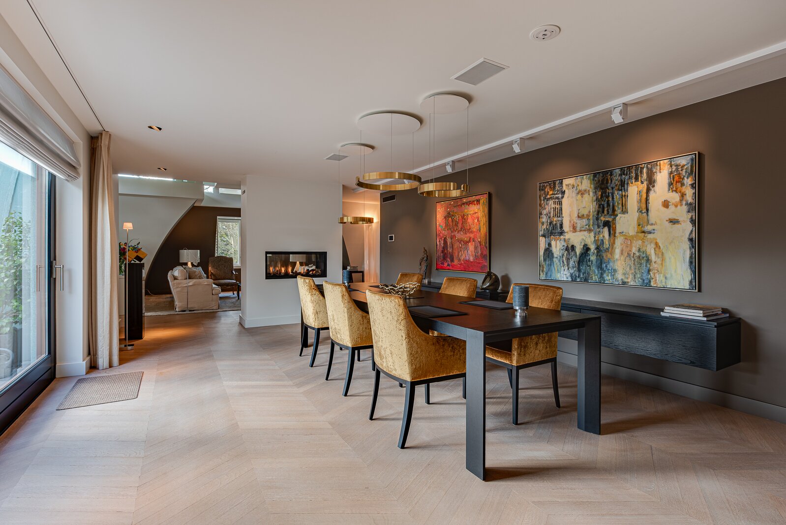 Private, secure elevator access opens into a spacious reception hall with a cloakroom and a hallway featuring a built-in library wall. Double doors lead to the generous living area, visually divided into a lounge, dining room, and breakfast room — all seamlessly connected with an open and transparent flow. A two-sided gas fireplace separates the lounge and dining areas, while a room divider defines the breakfast space. From the dining room, a hardwood sliding door provides access to the covered terrace (afternoon sun). A second two-sided gas fireplace connects the kitchen and breakfast room. The breakfast room opens to the spacious open-plan kitchen/dining area, which also has access to a second large terrace (morning sun) via another hardwood sliding door. Adjacent to the living area are two separate home offices, each fitted with custom-built desks and storage drawers.