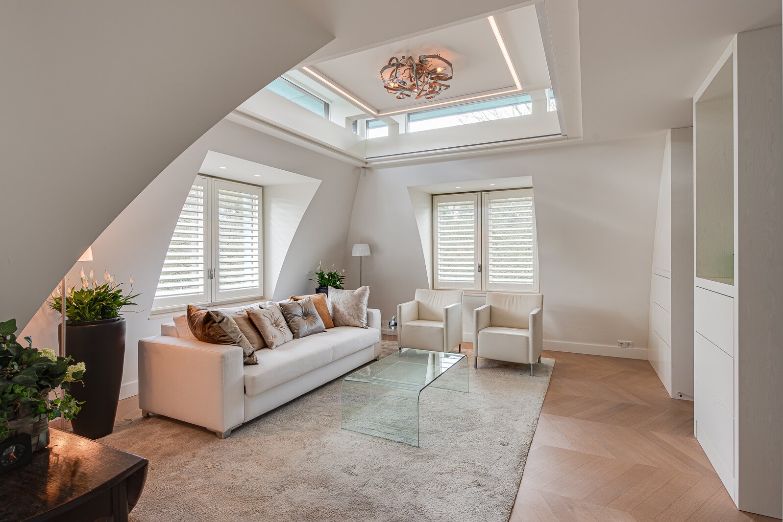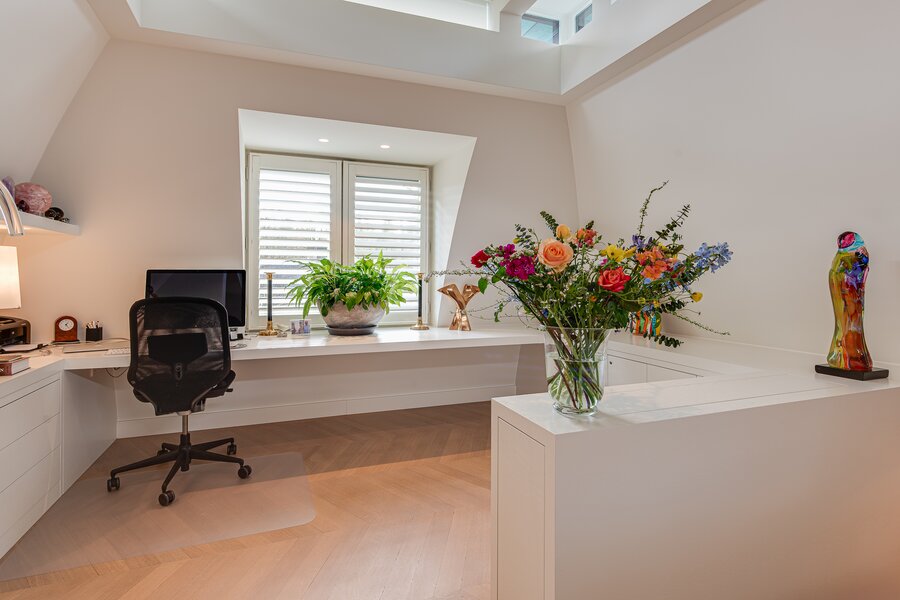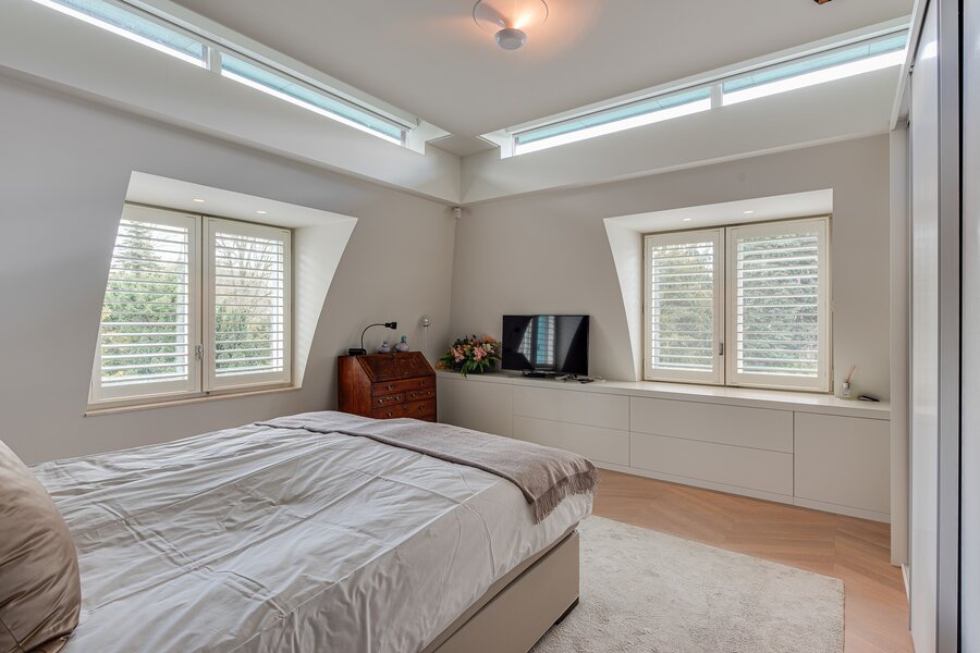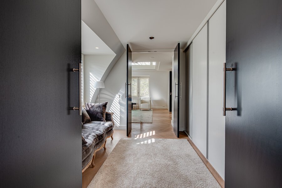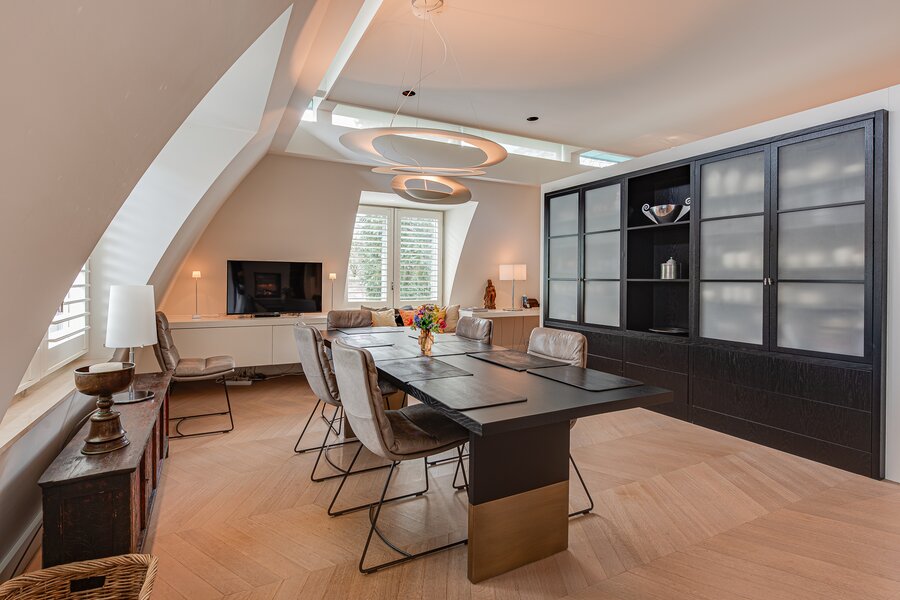 Upon entry, one is immediately struck by the continuous band of windows just below ceiling level, which floods the space with natural light and creates a unique, open atmosphere. The abundant daylight and the high-quality finishes — including oak and marble floors with underfloor heating — lend the penthouse a distinguished allure. Further luxuries include an advanced home automation system, air conditioning, a comprehensive security installation, and excellent sound insulation through double cavity walls and floating floors.