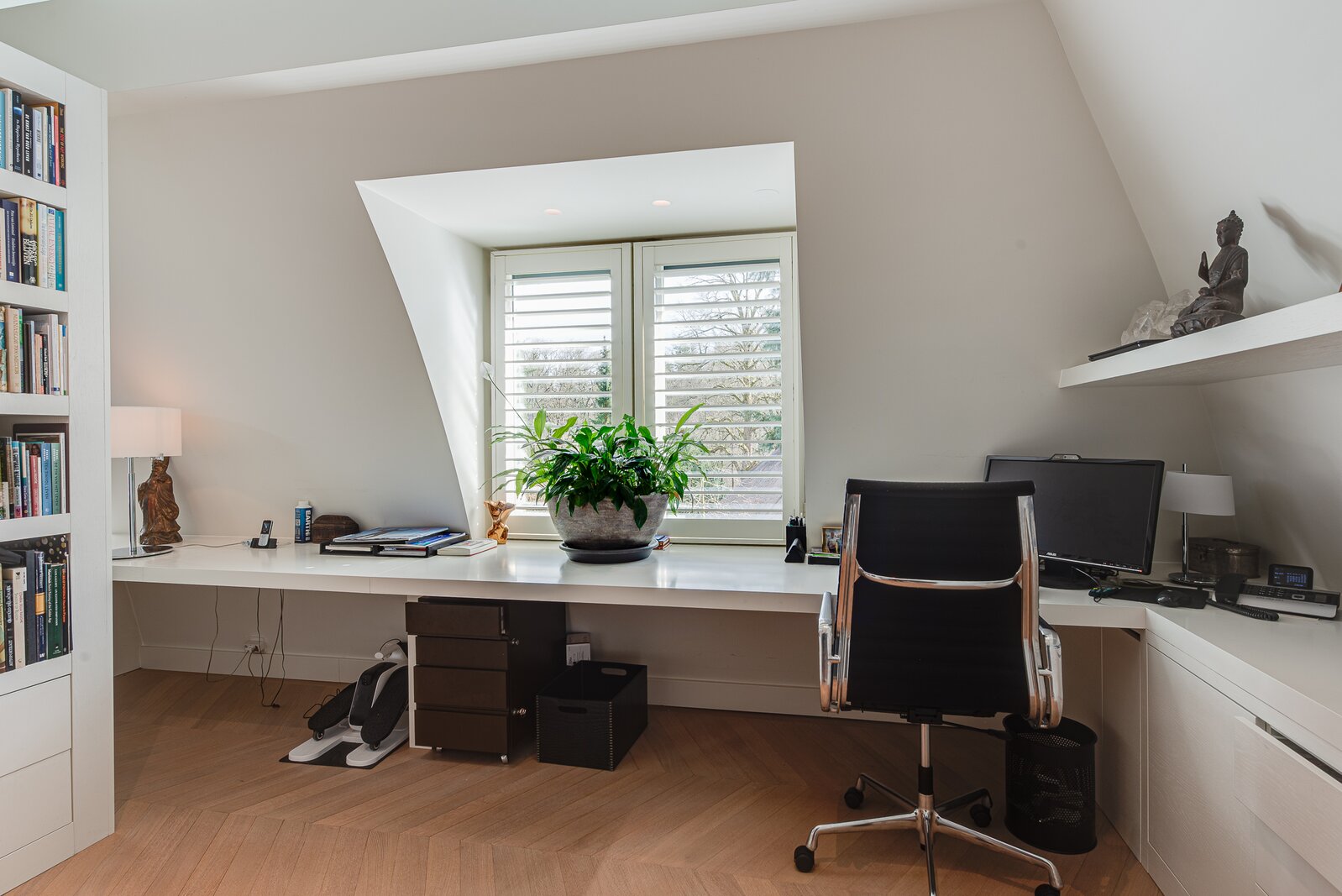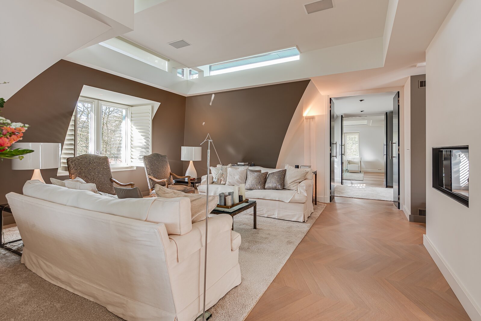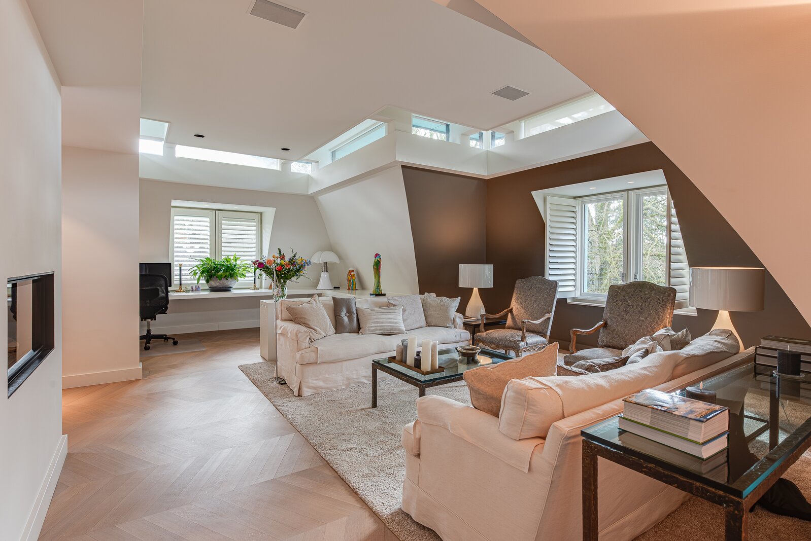 Upon entry, one is immediately struck by the continuous band of windows just below ceiling level, which floods the space with natural light and creates a unique, open atmosphere. The abundant daylight and the high-quality finishes — including oak and marble floors with underfloor heating — lend the penthouse a distinguished allure. Further luxuries include an advanced home automation system, air conditioning, a comprehensive security installation, and excellent sound insulation through double cavity walls and floating floors.