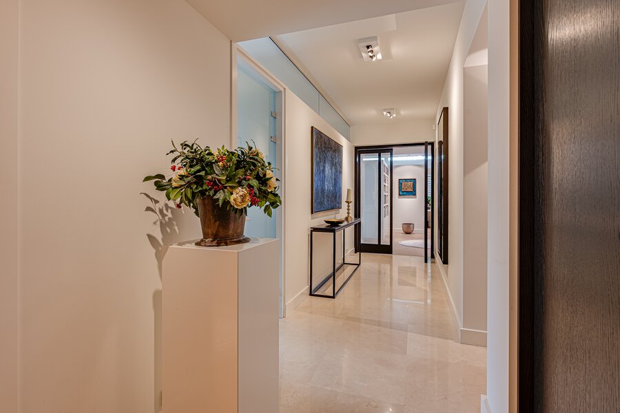 Bij binnenkomst valt direct de rondom doorlopende raamstrook op, net onder plafondniveau, die zorgt voor een prachtige lichtinval en een bijzondere sfeer. De royale daglichttoetreding versterkt het gevoel van ruimte. De afwerking is van uitzonderlijk hoog niveau, met fraaie eiken- en marmeren vloeren, voorzien van vloerverwarming. Verder beschikt het penthouse over een uitgebreid domoticasysteem, airconditioning, een geavanceerde beveiligingsinstallatie en uitstekende geluidsisolatie dankzij ankerloze spouwmuren en zwevende dekvloeren.
