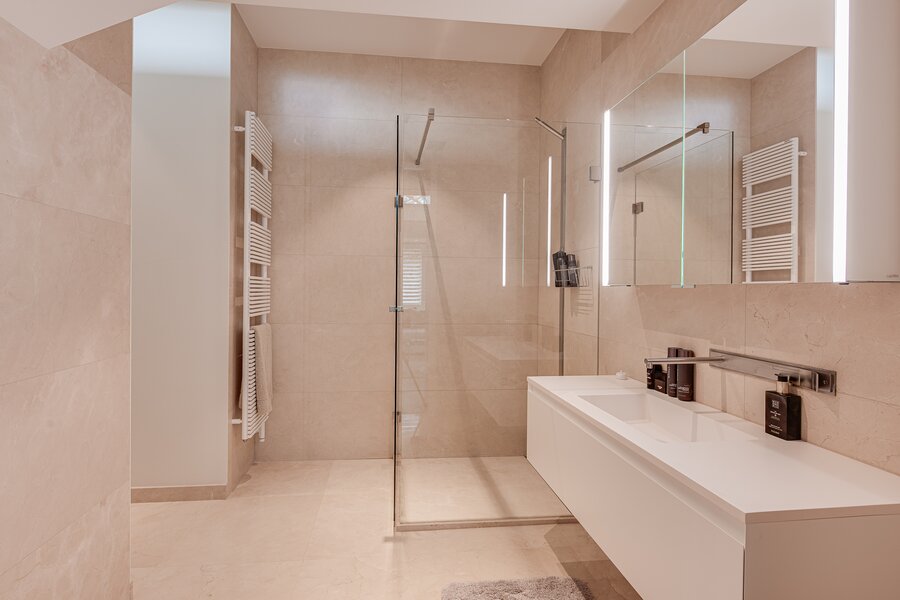 The modern, fully equipped Miele kitchen includes a built-in cabinetry wall, an island, integrated appliances, and a hidden television built into the glass backsplash behind the counter. From the hallway, you access the guest toilet with wall-mounted WC and washbasin. The spacious primary bedroom features a walk-in closet and a large en-suite bathroom finished in light marble, with a walk-in shower, designer bathtub, double sink vanity, and wall-mounted toilet. The second spacious bedroom also has a private en-suite bathroom, similarly finished in light marble and equipped with a walk-in shower, sink vanity, and wall-mounted toilet. This bedroom flows into an additional room suitable for use as a study, hobby room, or guest room.