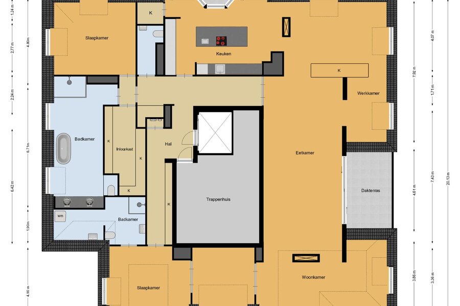 De moderne, uitgebreide Miele-keuken beschikt over een vaste kastenwand, een spoeleiland, complete inbouwapparatuur en een verrassend weggewerkte televisie, geïntegreerd in de glazen achterwand van het aanrecht. Vanuit de hal is het toilet bereikbaar, voorzien van wandcloset en fontein. De royale hoofdslaapkamer heeft een aangrenzende kastenkamer en een ruime, in licht marmer uitgevoerde badkamer met inloopdouche, design-ligbad, dubbel wastafelmeubel en wandcloset. De tweede ruime slaapkamer grenst aan een eigen, eveneens in licht marmer uitgevoerde badkamer met inloopdouche, wastafelmeubel en wandcloset. Deze slaapkamer loopt door in een extra ruimte die gebruikt kan worden als werk-, hobby- of logeerkamer.
