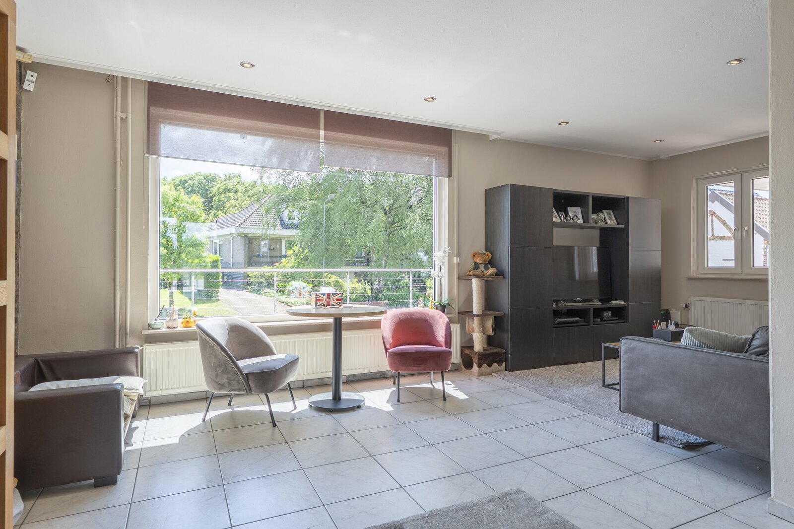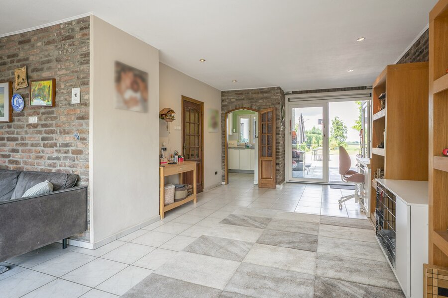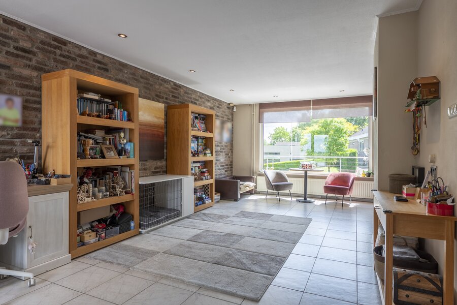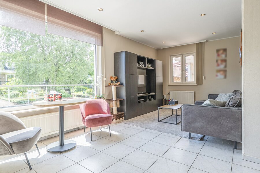 De woonkamer is daglicht-rijk te noemen en staat door de openslaande tuindeuren in direct contact met de achtertuin. Door het L-vormige karakter is het zitgedeelte aan de voorzijde van de woning gesitueerd.
