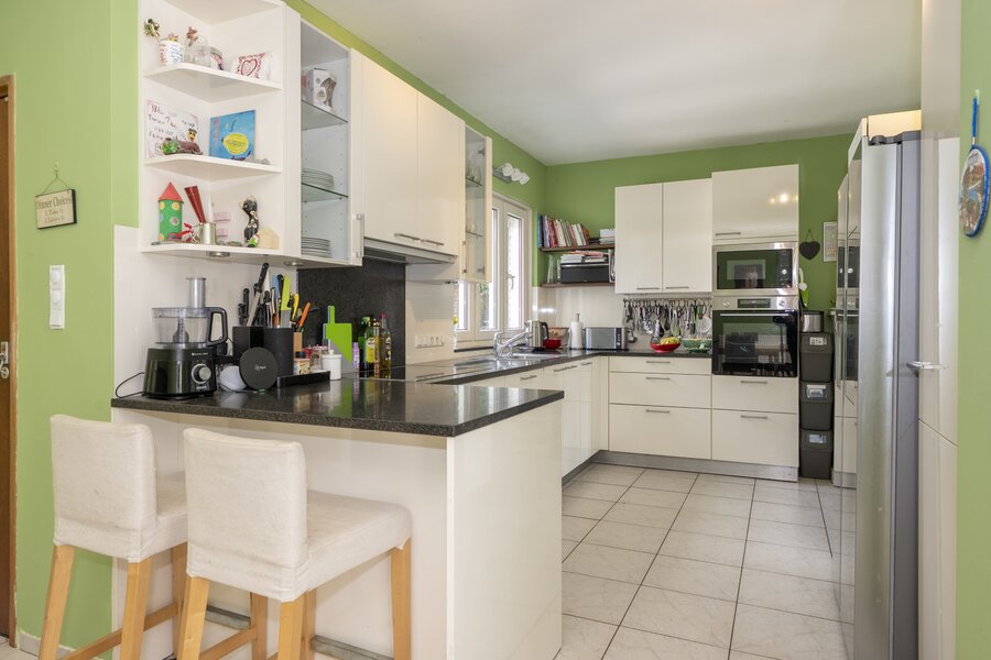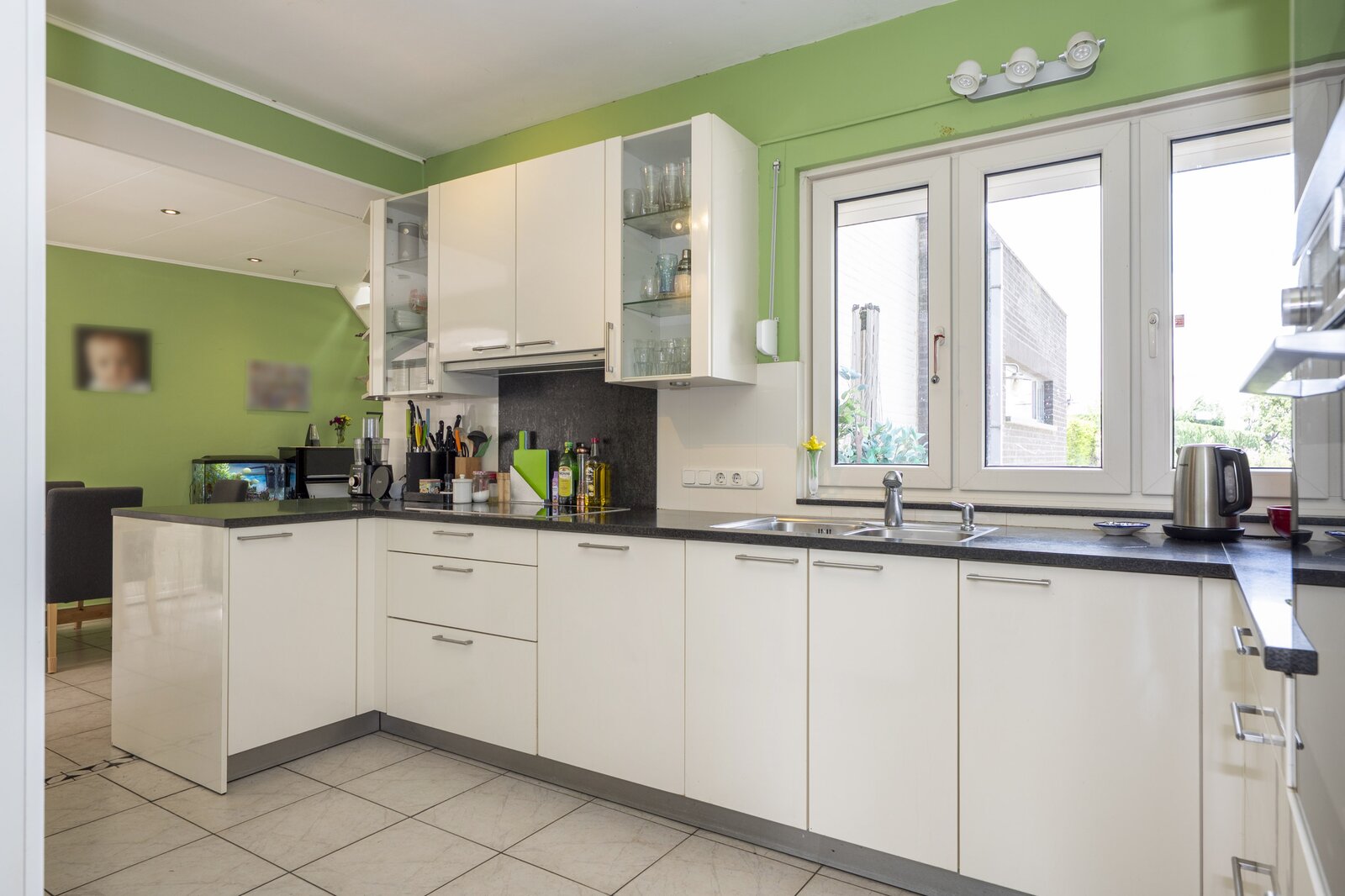De keuken is achter de woonkamer gelegen en ingedeeld met een keukeninstallatie welke in een hoek is opgesteld. De aanwezige inbouwapparatuur zijn een afzuiging, een inductie kookplaat, een oven, een magnetron en een vaatwasser.