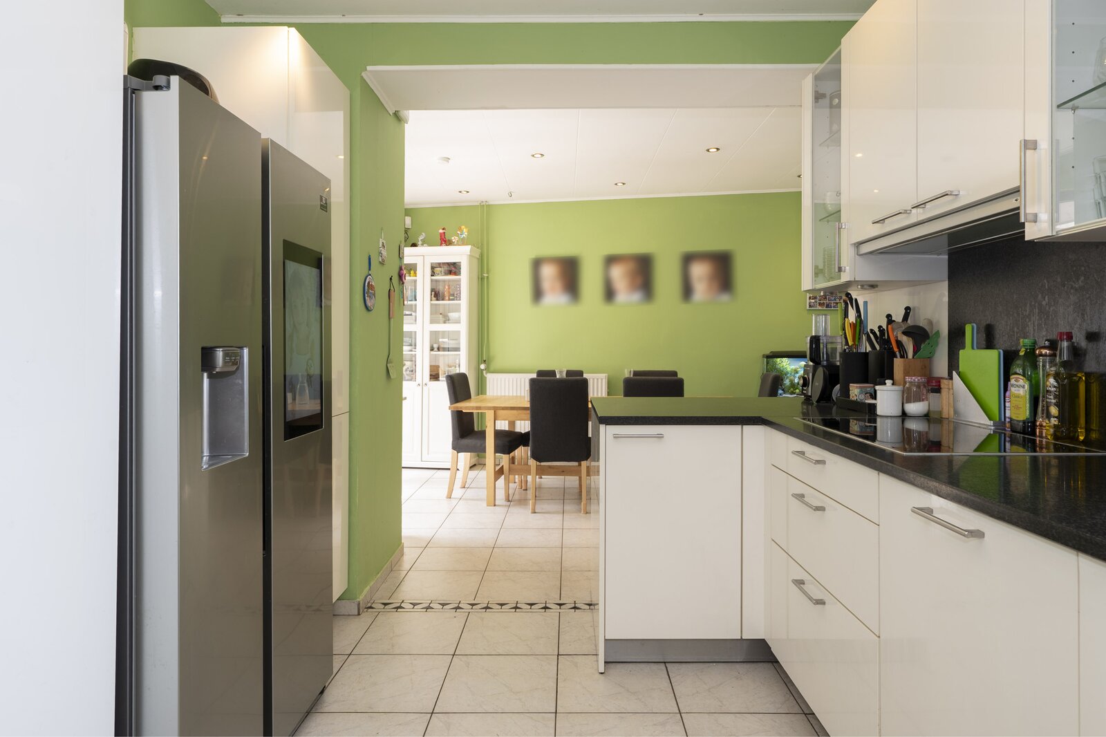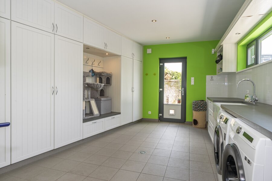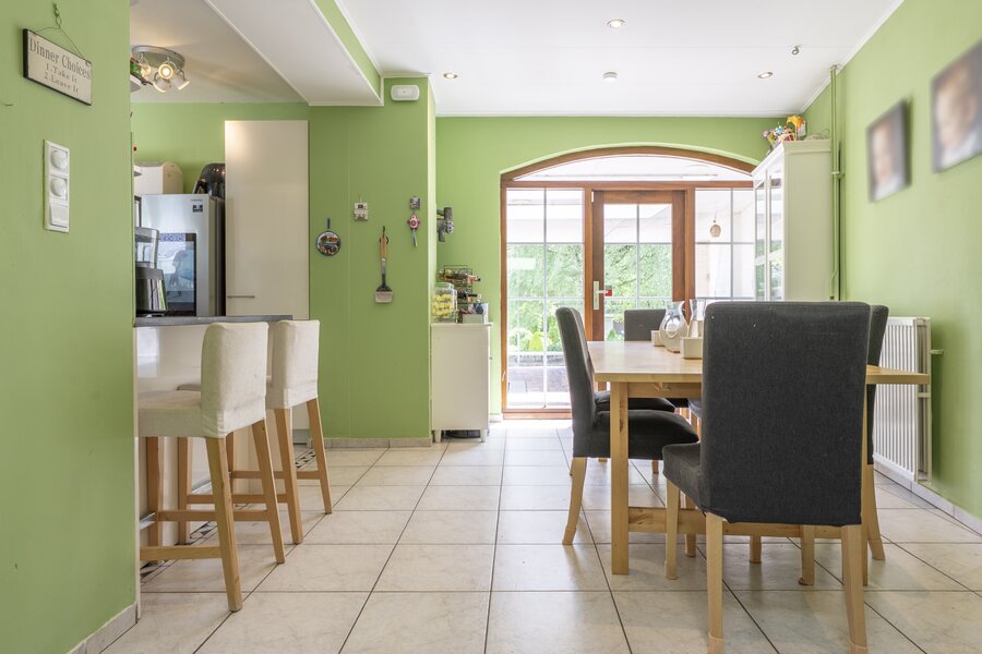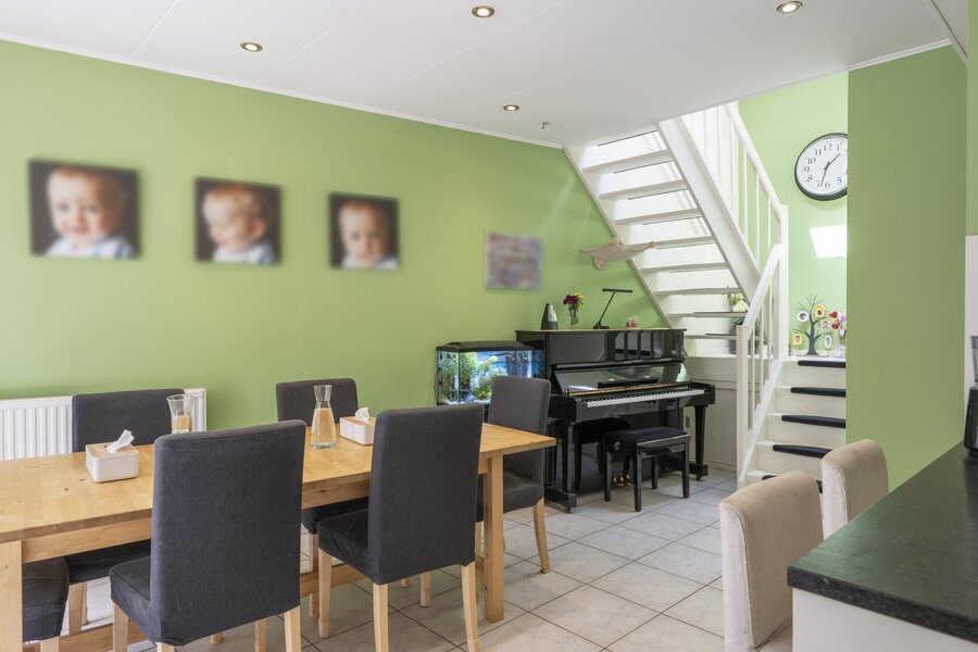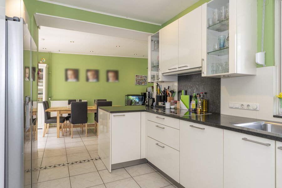 De keuken is uitgebreid door de voormalige garage bij de ruimte te trekken. Door deze extra ruimte is het mogelijk om een grotere eettafel in de keuken te plaatsen. Vanuit deze ruimte is de bovengelegen zolder bereikbaar welke prima kan fungeren als opslag, hobbykamer of kantoor. Ook de bijkeuken is middels de eetkamer bereikbaar. Deze ruimte is naast de aansluitpunten voor het witgoed uitgerust met vaste kastenwanden en een keukenblok. Kortom een ideale ruimte om alles op orde te krijgen voor grotere gezinnen. Tevens is de achtertuin direct bereikbaar door de aanwezige buitendeur.