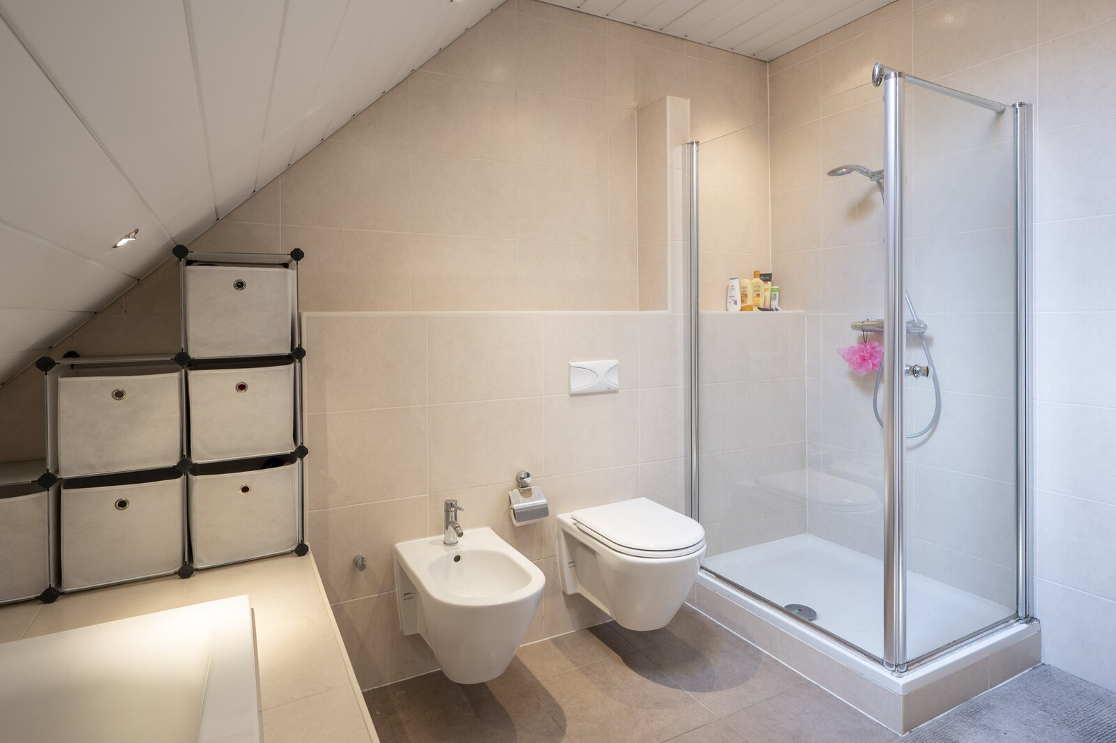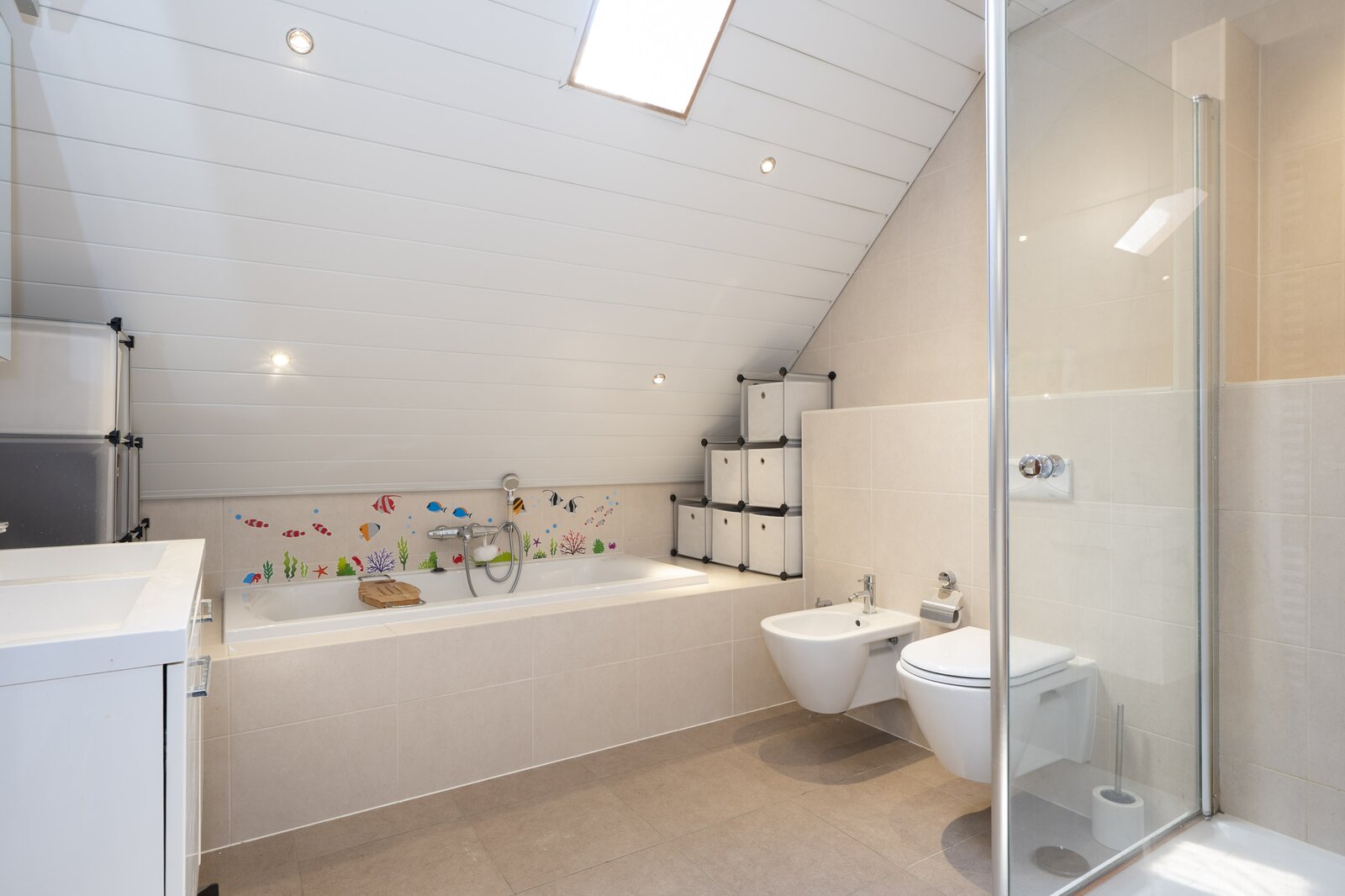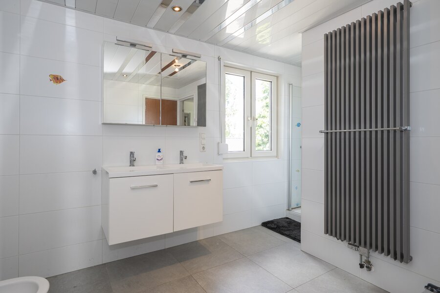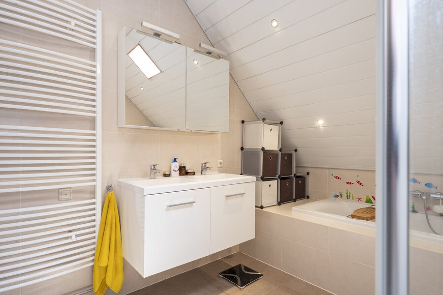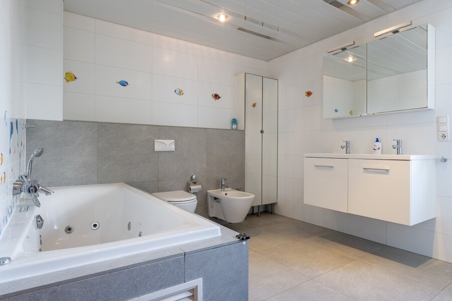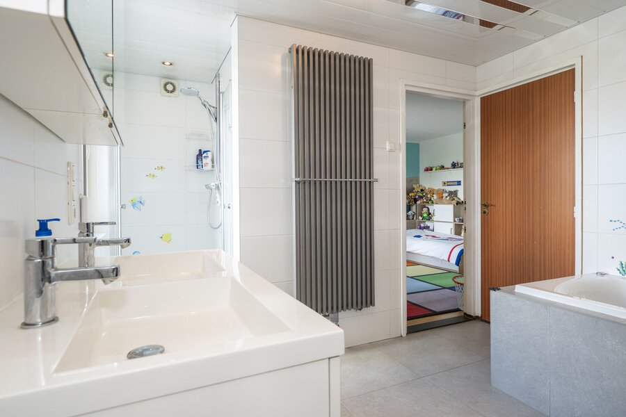- geheel betegeld badkamer welke is ingedeeld met een ligbad, een douchecabine, een dubbele wastafel verwerkt in een meubel, een spiegelkast en een toilet