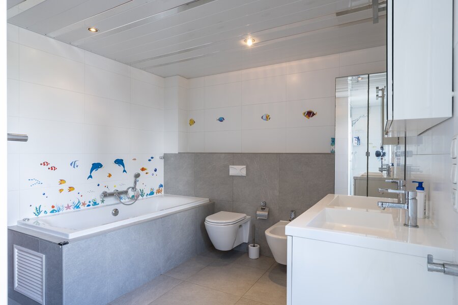 - geheel betegelde badkamer welke is ingedeeld met een ligbad, een douchecabine, een dubbele wastafel verwerkt in een meubel, een spiegelkast, een design radiator, een toilet en een bidet