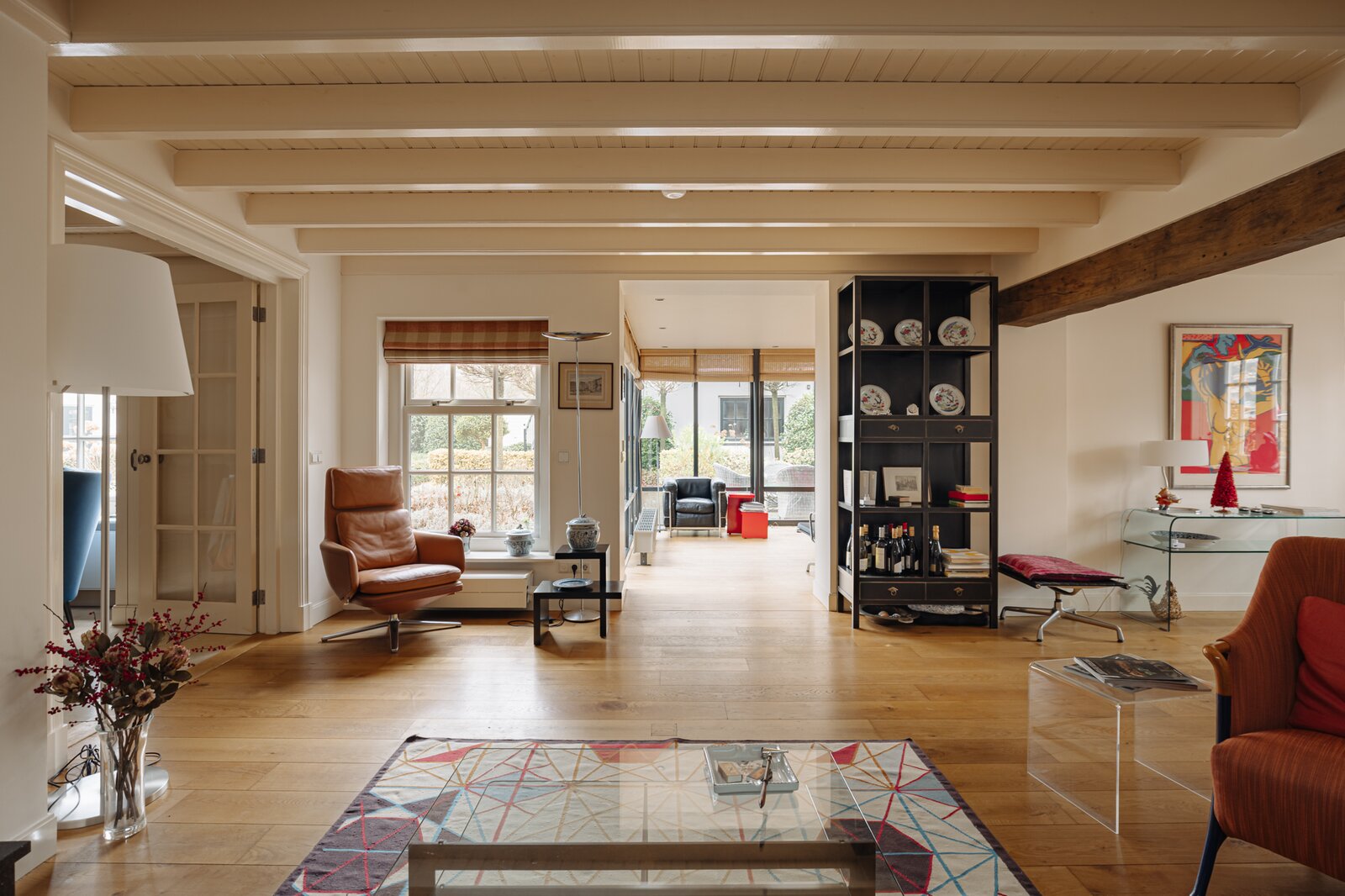 De woonkamer bestaat uit twee delen: het woongedeelte en de aangrenzende, verrassend lichte serre met prachtig uitzicht op de tuin. De eiken vloer, ramen met roedeverdeling, zichtbare balken en de lichtstraat maken deze ruimte comfortabel en zeer aangenaam.
