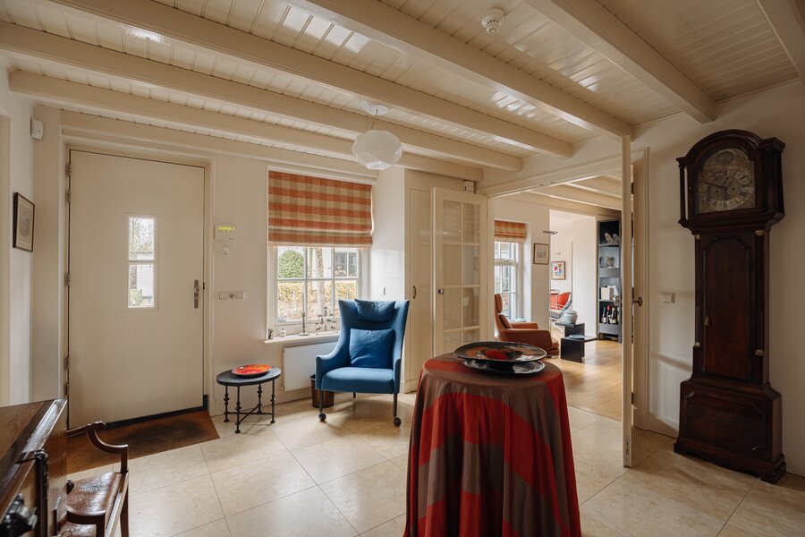 Entree, ruime ontvangsthal met travertin plavuizen, toilet, trapopgang en lift naar de eerste etage. Direct bij binnenkomst valt de hoogwaardige renovatie en afwerking op, waarbij de sfeer zorgvuldig is behouden. De zichtbare balkenconstructie draagt bij aan het karakter van de woning.