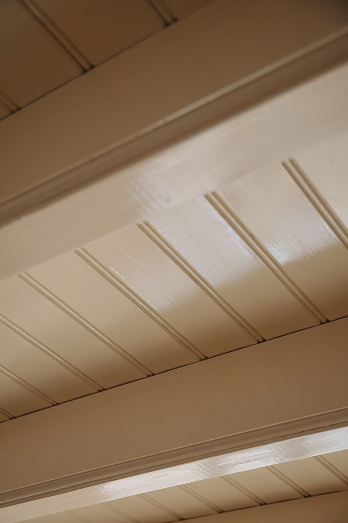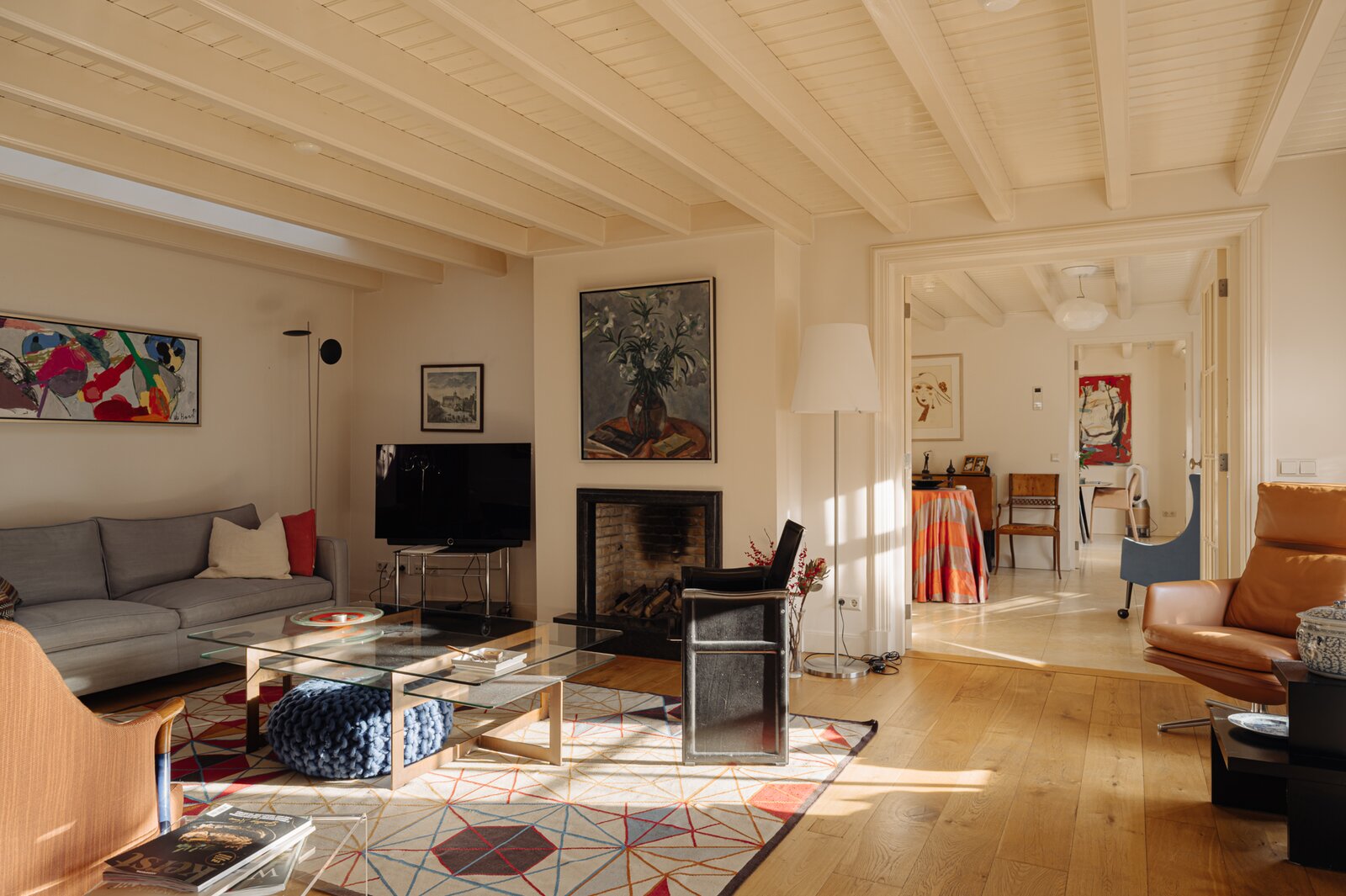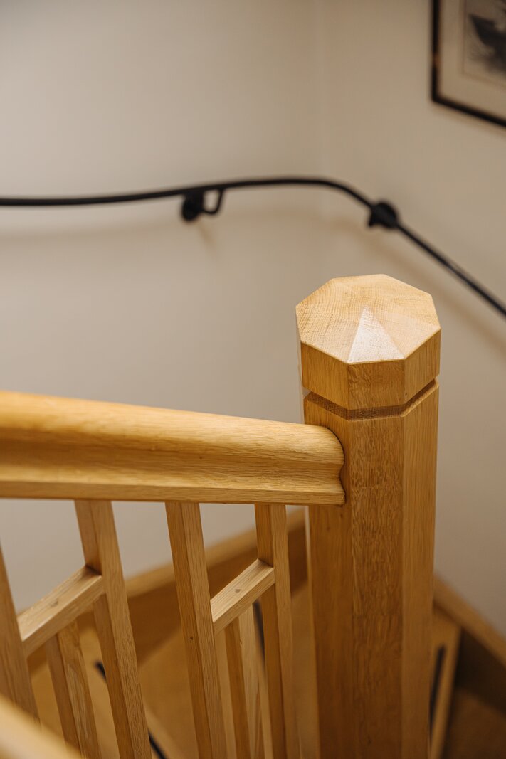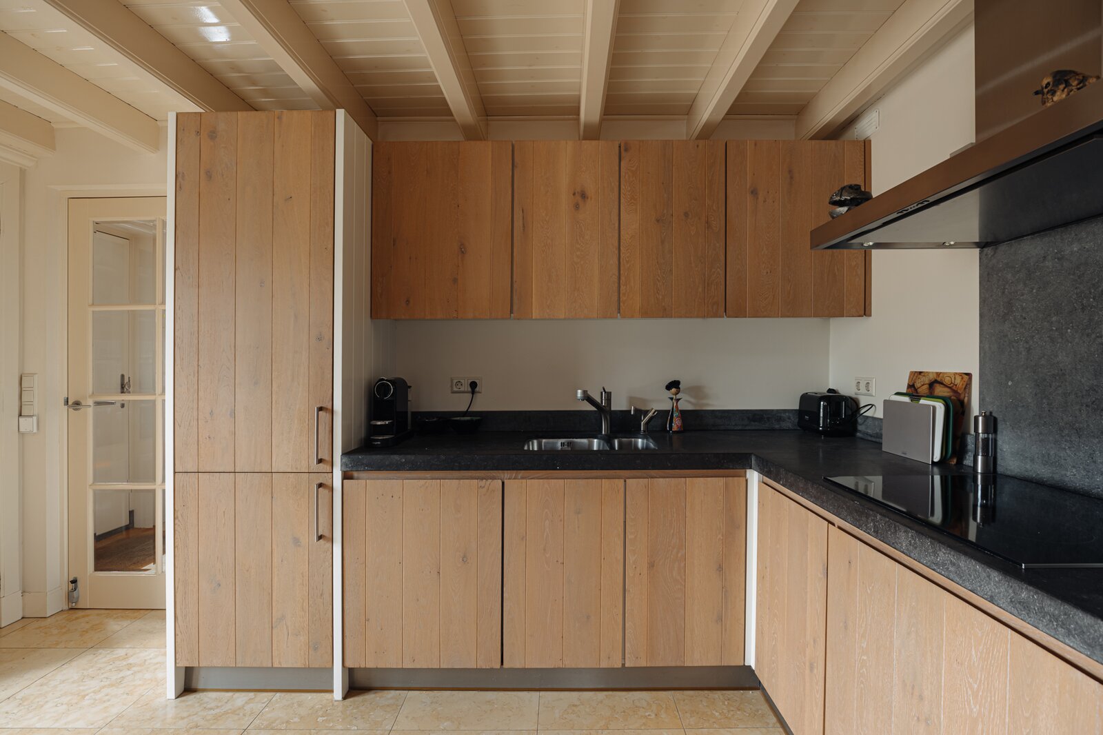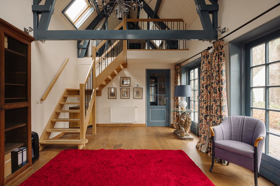 Entrance via the spacious reception hall with travertine tiled flooring, guest toilet, staircase and elevator to the first floor. Upon entering, the high-quality renovation and finishing are immediately noticeable, while the original atmosphere has been carefully preserved. The exposed wooden beam structure enhances the character of the property.