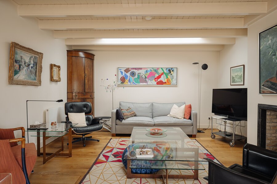 The living room is divided into two areas: the main sitting area and the adjoining, remarkably bright conservatory offering beautiful garden views. The wooden flooring, mullioned windows, exposed beams and skylight create a comfortable and highly pleasant living environment.
