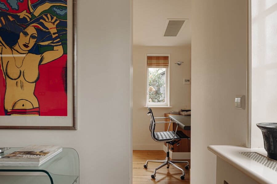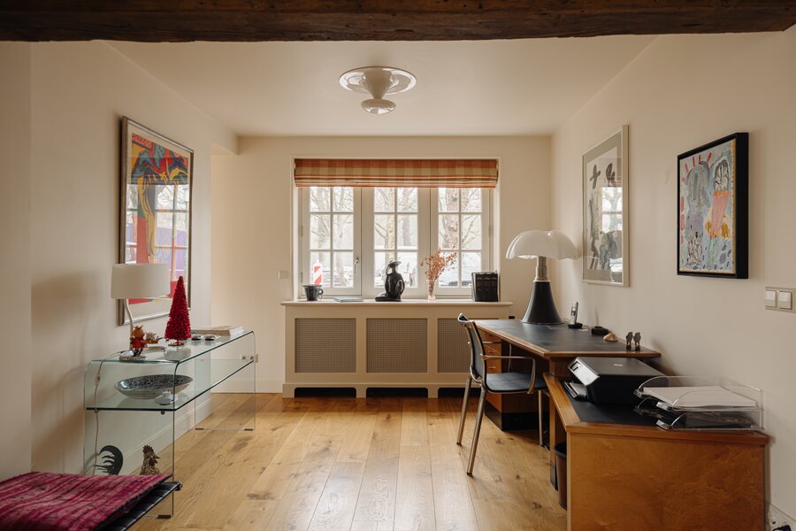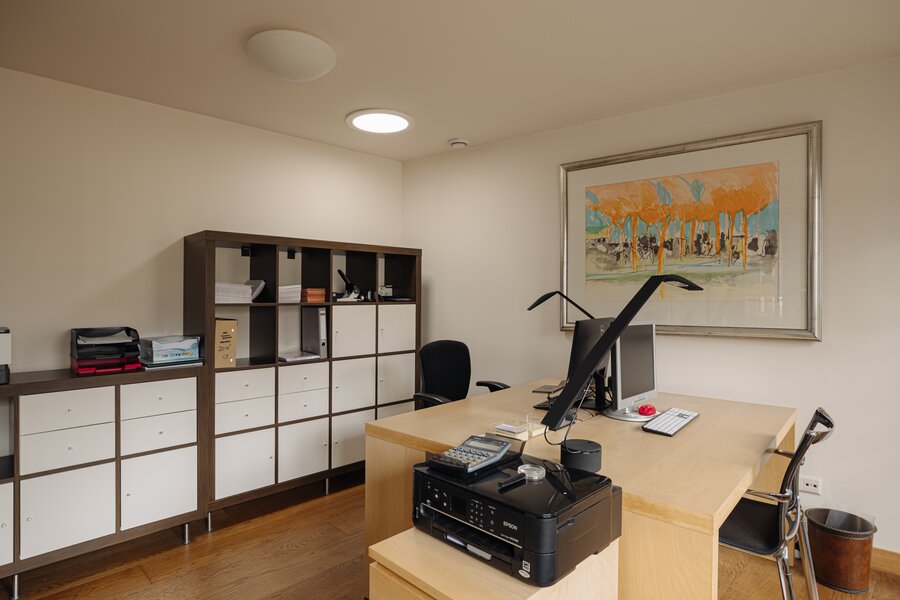 From the hallway, a separate toilet and cloakroom are accessible. A second room on the ground floor is currently used as office space. In addition, a separate kitchenette is available.