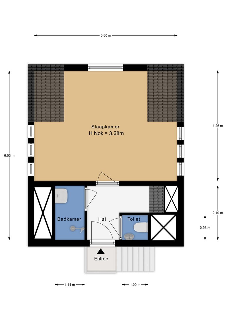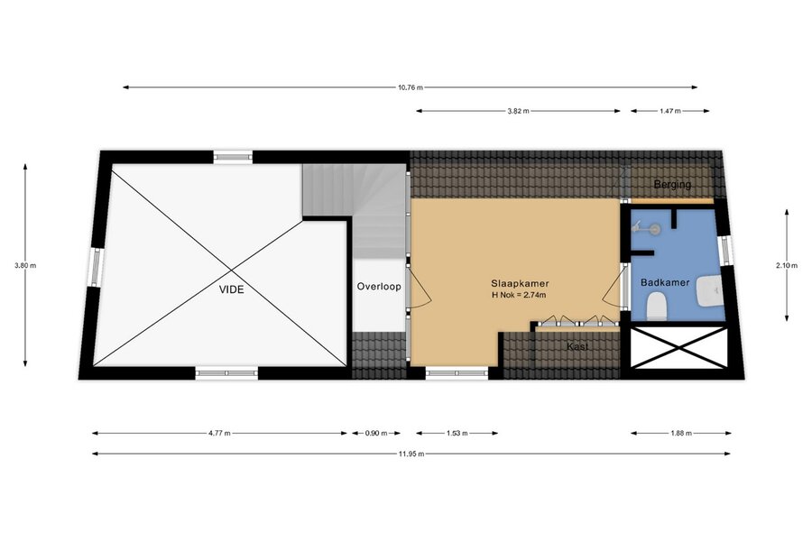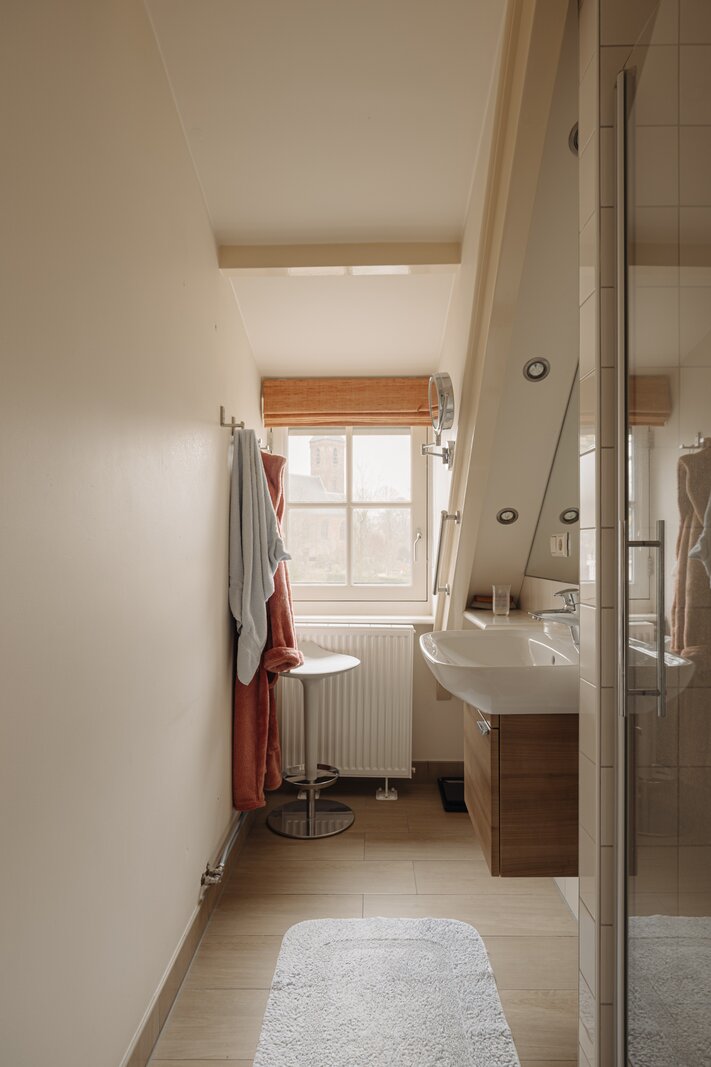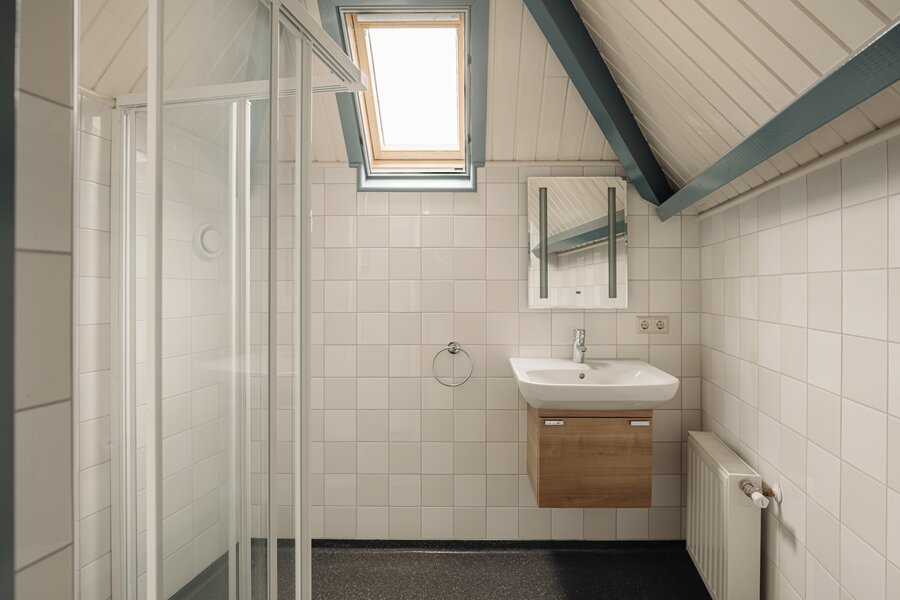 Via de trap en vide is de slaapruimte bereikbaar, met aangrenzend een complete badkamer voorzien van toilet, wastafel en inloopdouche.