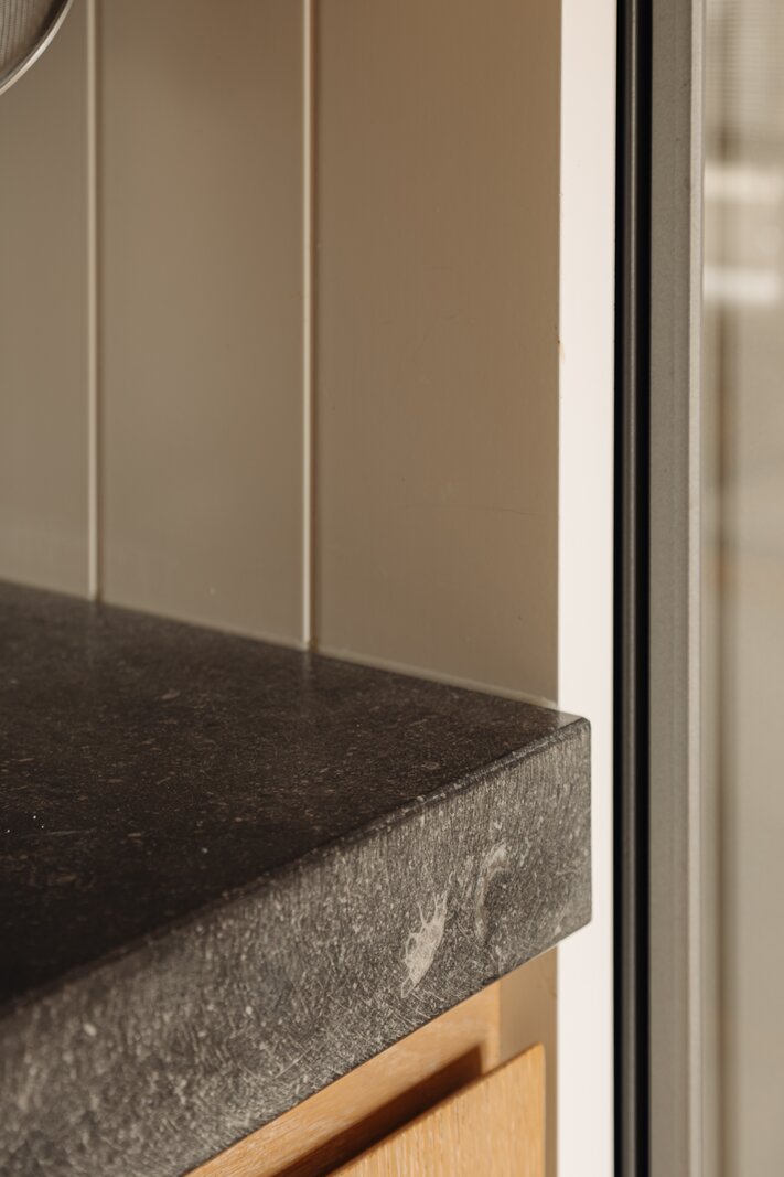 Aangrenzend bevinden zich de moderne keuken en bijkeuken, voorzien van alle denkbare gemakken en uitgevoerd met hoogwaardige materialen zoals een hardstenen aanrechtblad, eiken kasten en kwaliteits-inbouwapparatuur van onder andere Miele, Gaggenau en Quooker. In de bijkeuken bevinden zich een extra koelkast en een opstelling voor wasmachine en droger, met voldoende bergruimte dankzij ingebouwde kasten.