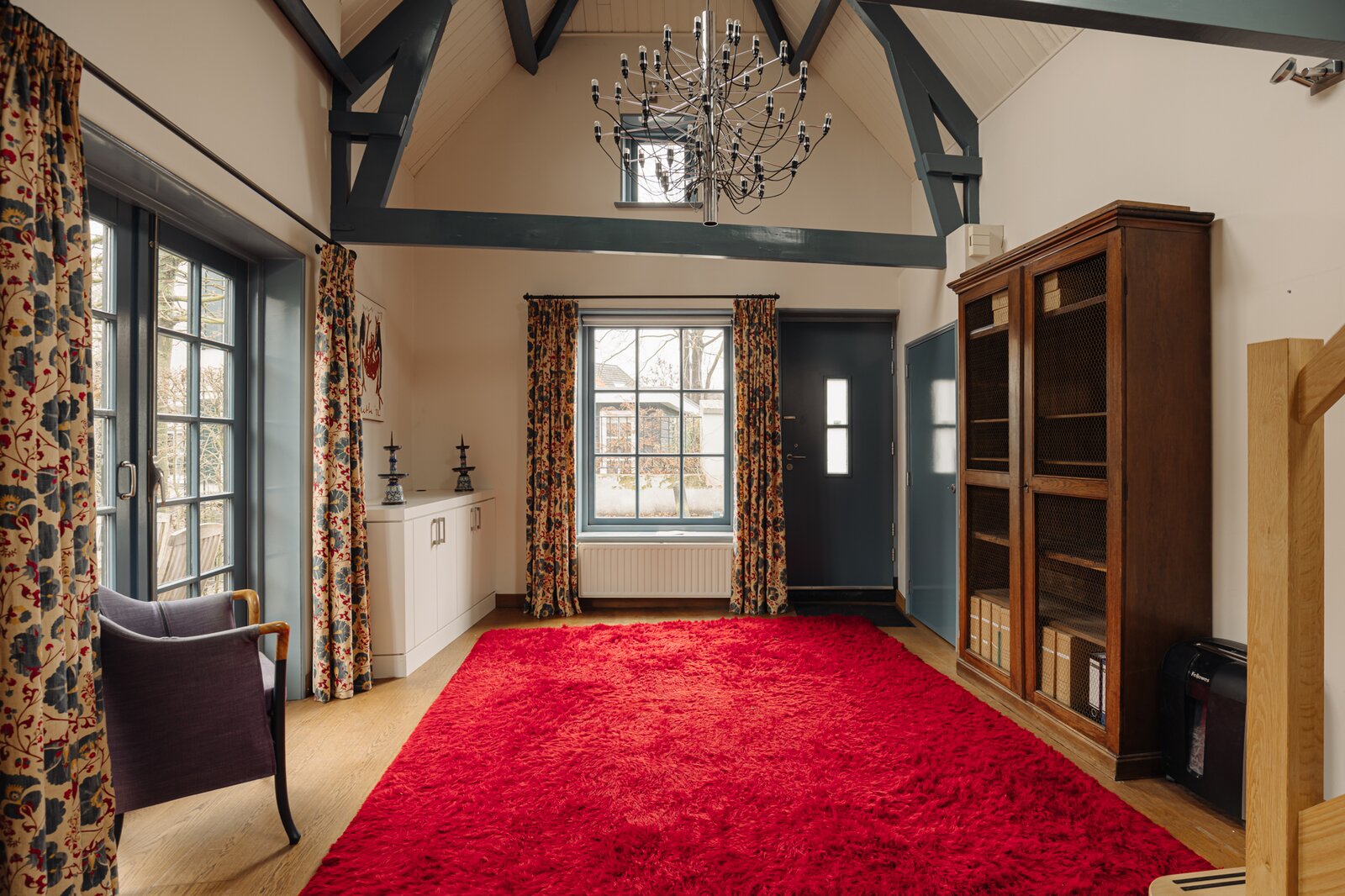 Entree aan de straatzijde. Het woongedeelte beschikt over een vide die een indrukwekkende hoogte tot aan de nok biedt en een bijzonder gevoel van ruimte creëert. De dubbele deuren richting de tuin zorgen voor een prettig uitzicht en veel lichtinval.