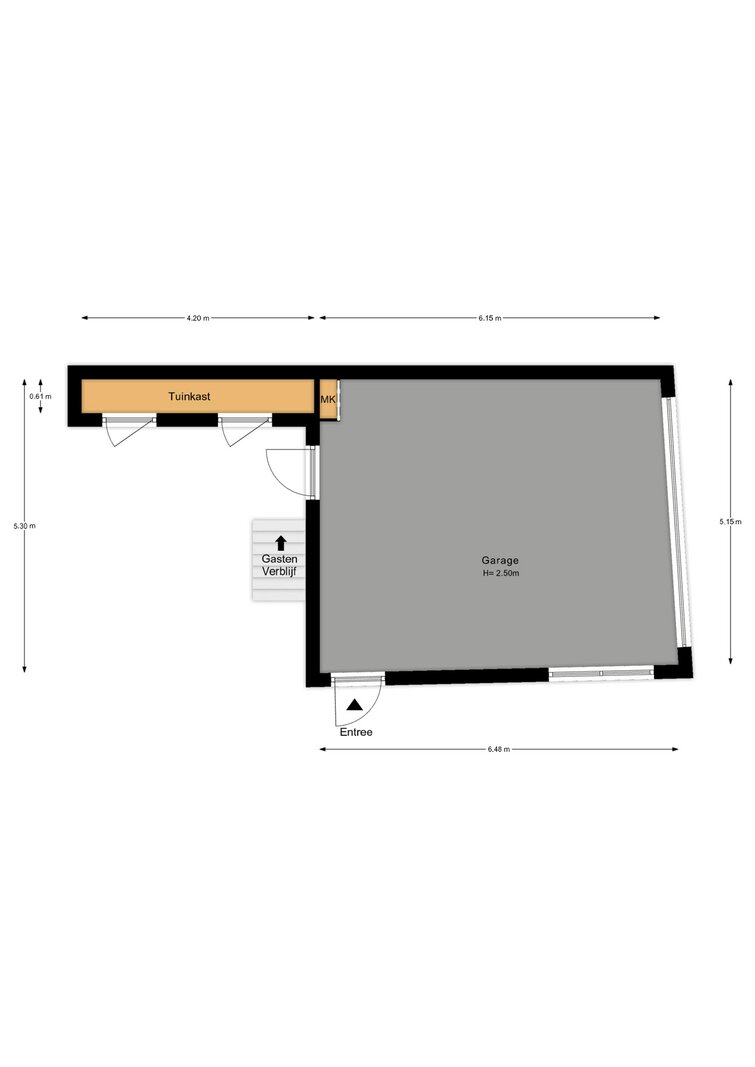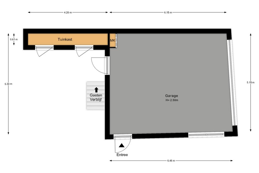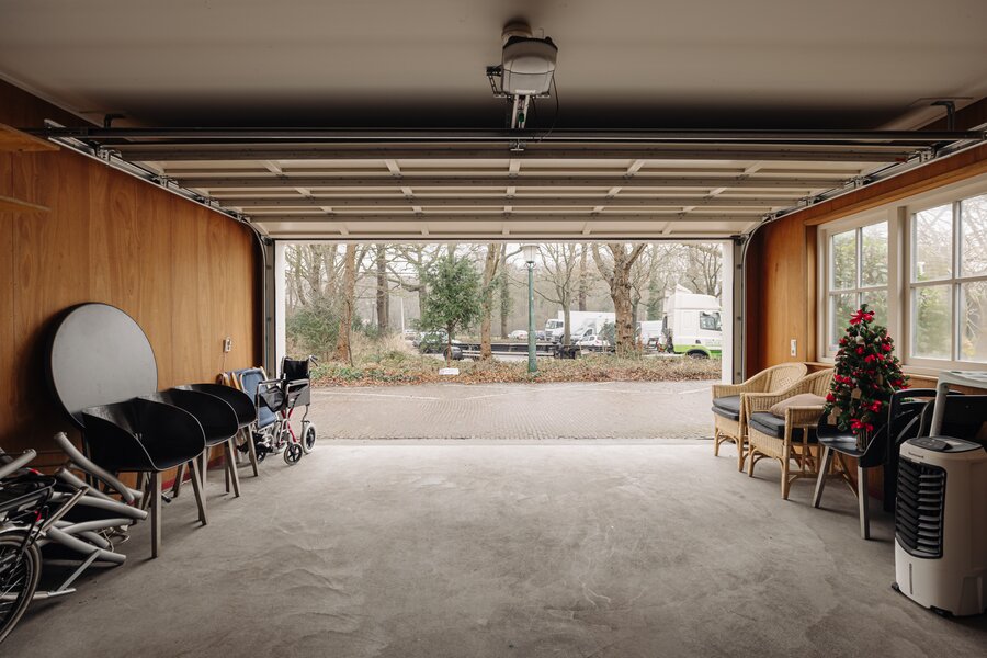 De vrijstaande garage is circa 5,30 meter breed en heeft een oppervlakte van ongeveer 35 m². Aan de achterzijde bevindt zich een trapopgang naar het gastenverblijf. Vanuit de hal zijn een separaat toilet, een doucheruimte met wastafel en een verblijfsruimte bereikbaar. In deze ruimte zijn aansluitingen aanwezig voor het realiseren van een kitchenette.