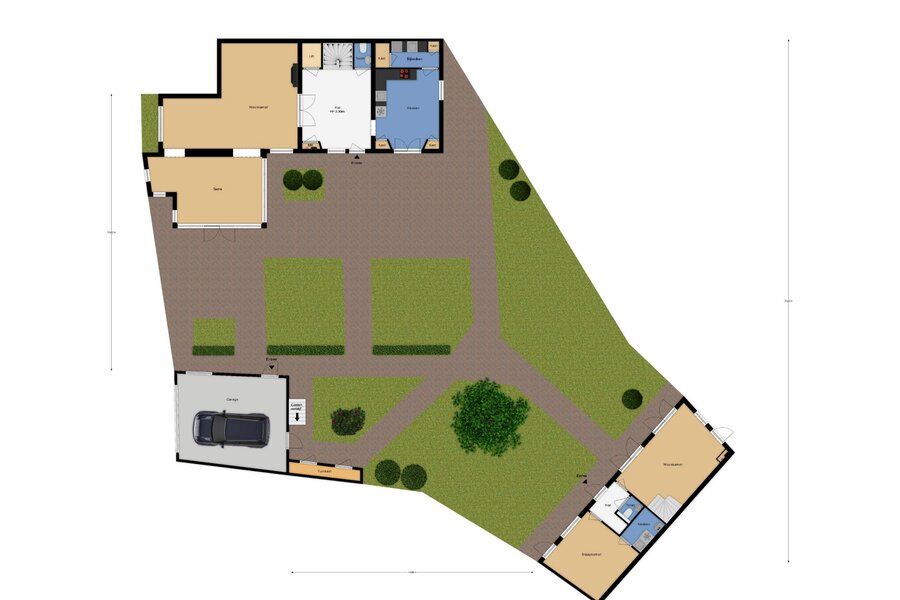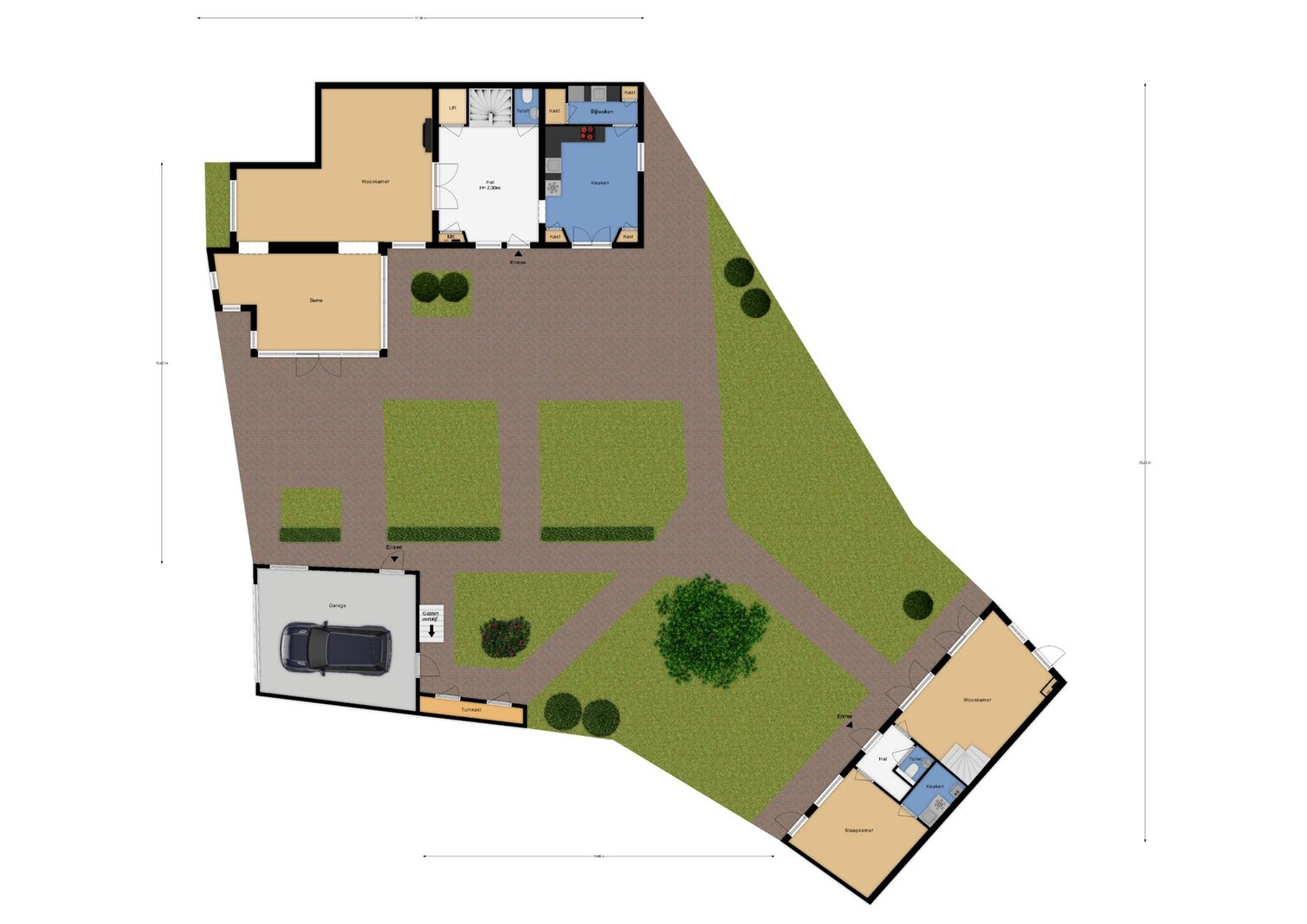 - Woonoppervlak van 251 m2 is als volgt opgebouwd: woning 166 m2, gastenverblijf 24 m2, woon/kantoor 62 m2.
