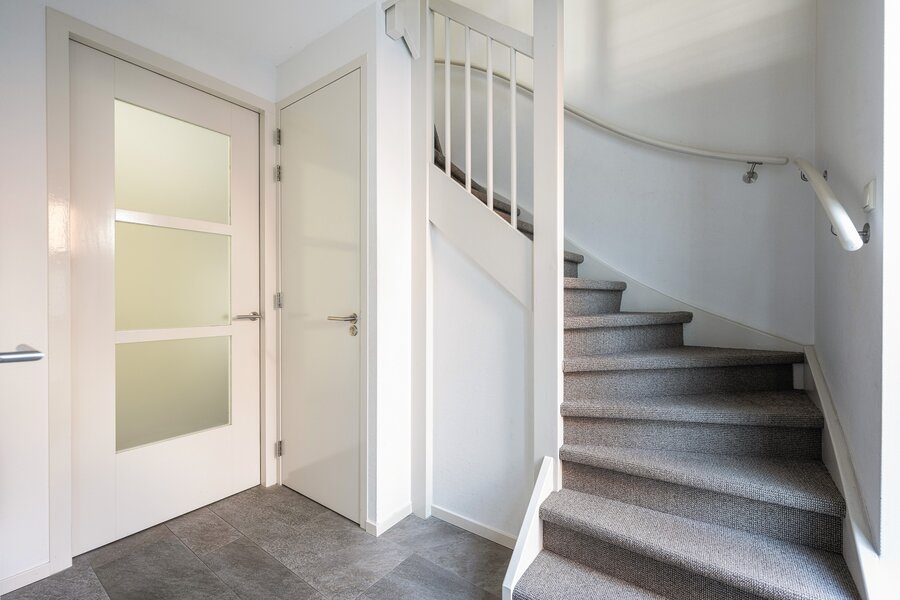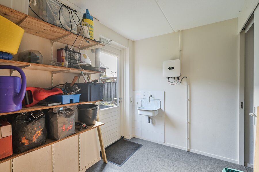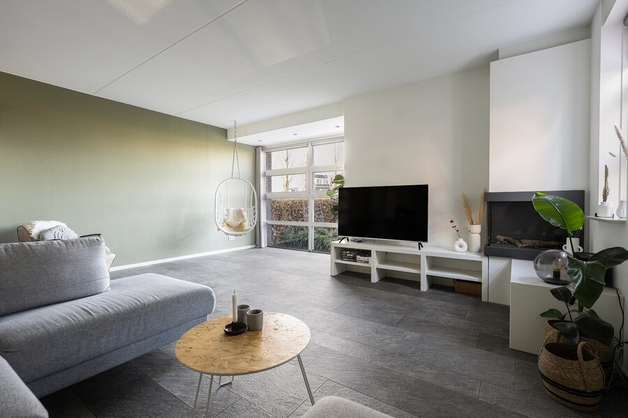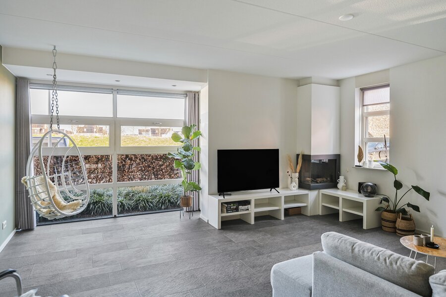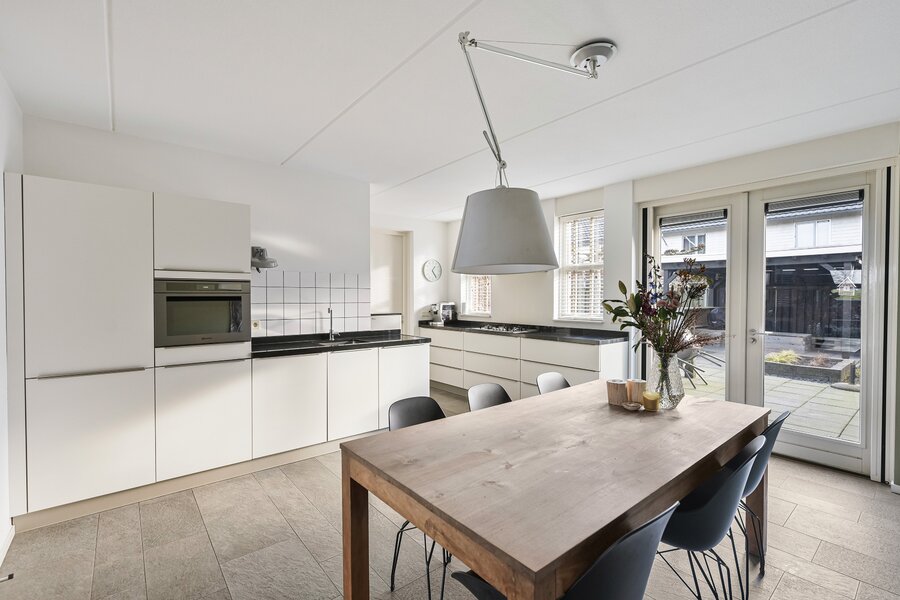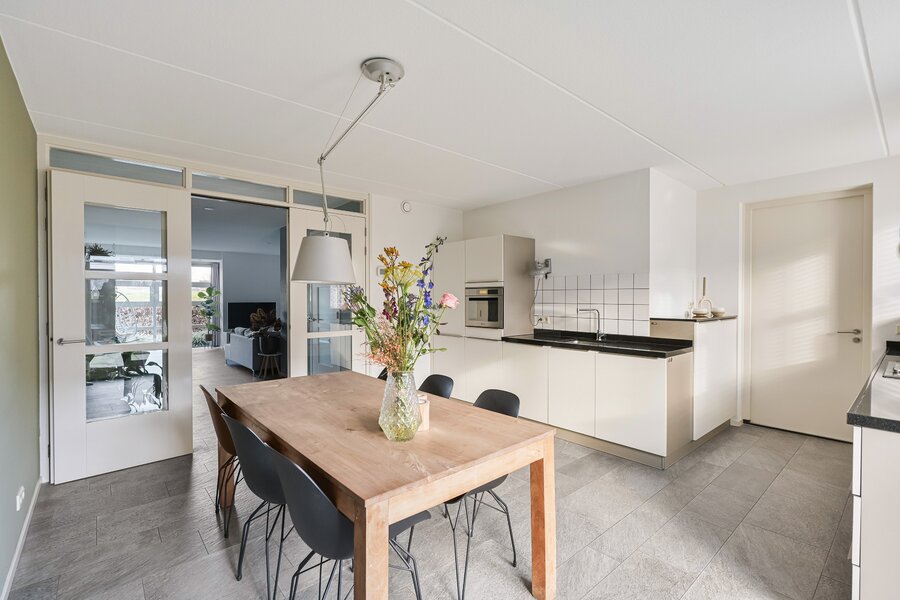 Entree, hal met modern toilet en binnendoor naar de berging (garage), de meterkast, de trapopgang en de trapkast. Je komt binnen in de verrassend ruime woonkamer, een fijne grote living voorzien van een grote erker, een haard en veel lichtinval. De suitedeuren zorgen voor een stijlvolle scheiding van de keuken en de woonkamer. De woonkeuken vind je aan de achterzijde, er is genoeg ruimte voor een grote eettafel met stoelen. Het is een fijne plek om heerlijk met elkaar te eten, bij te kletsen of nog wat werk te doen. De keuken is voorzien alle benodigde inbouwapparatuur. Er is een binnendoor naar de berging en er zijn openslaande deuren naar de achtertuin.