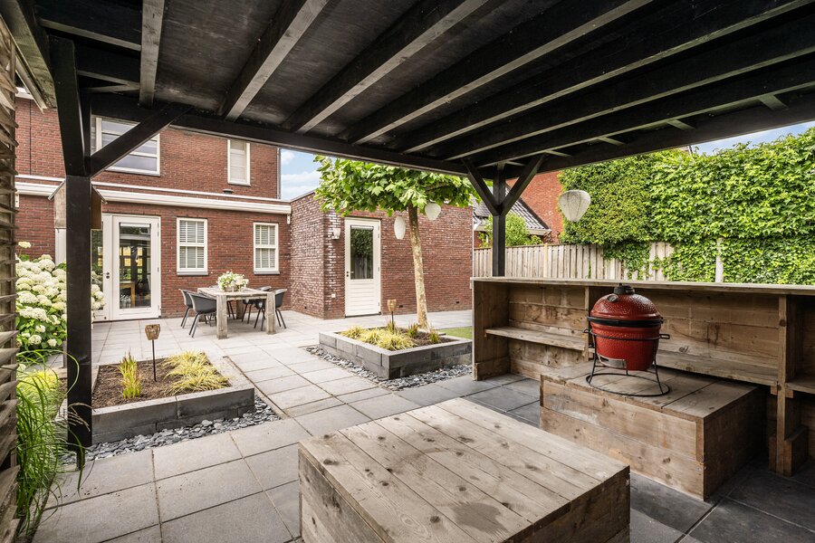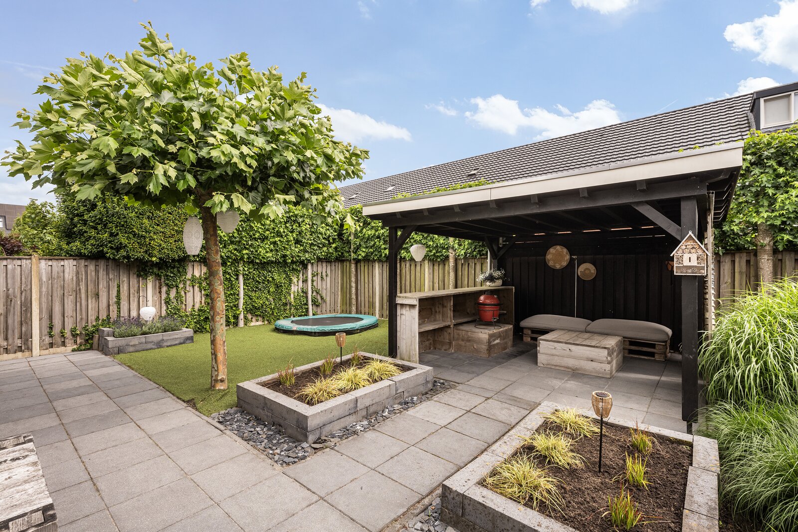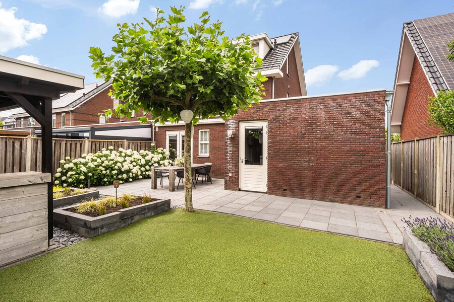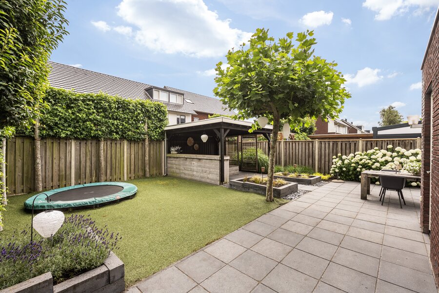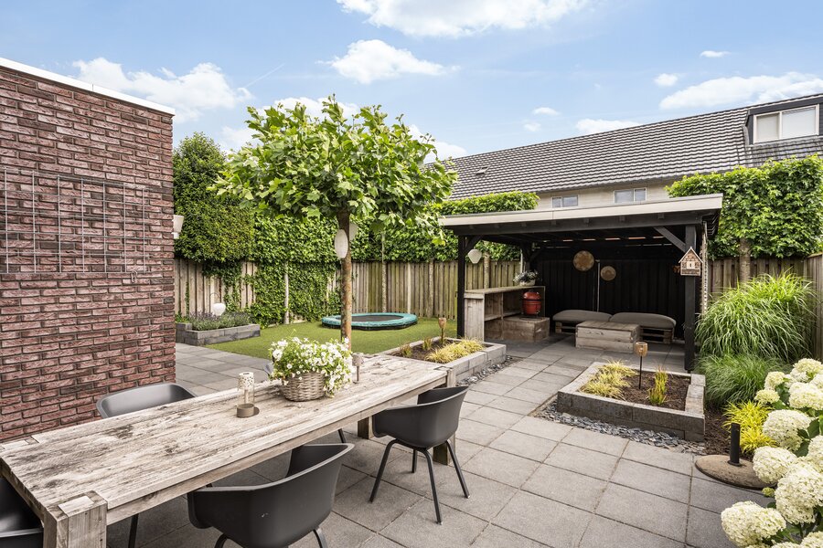 De tuin die bij deze woning hoort is eveneens een plaatje! De voortuin is netjes onderhouden en voorzien van veel groen. Er is een oprit voor het parkeren van de auto(‘s) op eigen terrein. De achtertuin is fraai aangelegd en voorzien van een zonneterras, een veranda en een speelgazon. Er is lekker veel groen in de tuin en daardoor ook genoeg privacy. De ligging op het zonnige zuiden is perfect! Hier kun je van vroeg in het voorjaar tot laat in het najaar heerlijk buiten zitten. De veranda is een fijne extra, een overkapping in de tuin die op warme zomerdagen zorgt voor schaduw en de rest van het jaar juist voor een fijne beschutte plek. Er zijn borders met groene planten en bloemen én er is een achterom.
