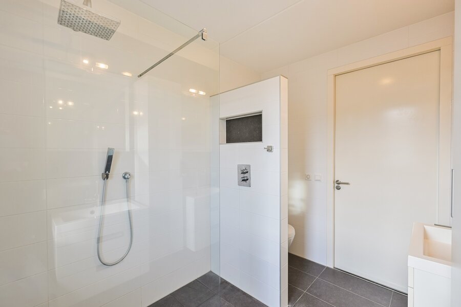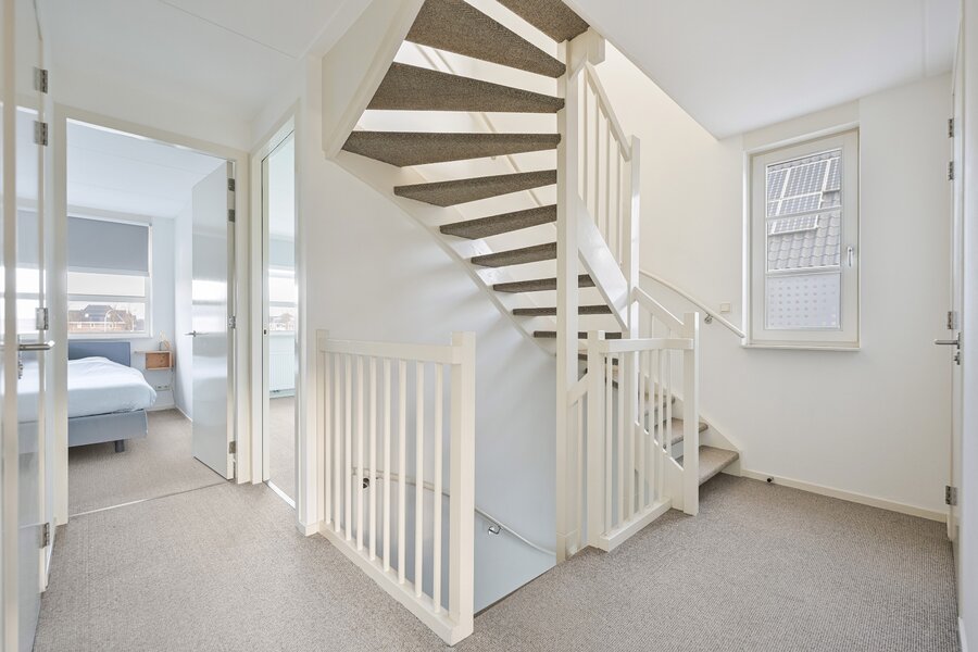 Vaste trap naar de overloop met toegang tot de drie mooie, grote en lichte slaapkamers. Er is een aparte walk-in-closet (berging) en de slaapkamer aan de achterzijde is voorzien van een grote vaste kast. De badkamer is voorzien van twee wastafelmeubels met spiegels en verlichting, een badkamerkast, een inloopdouche met rainshower, een tweede toilet en een raam dat zorgt voor frisse lucht en daglicht.