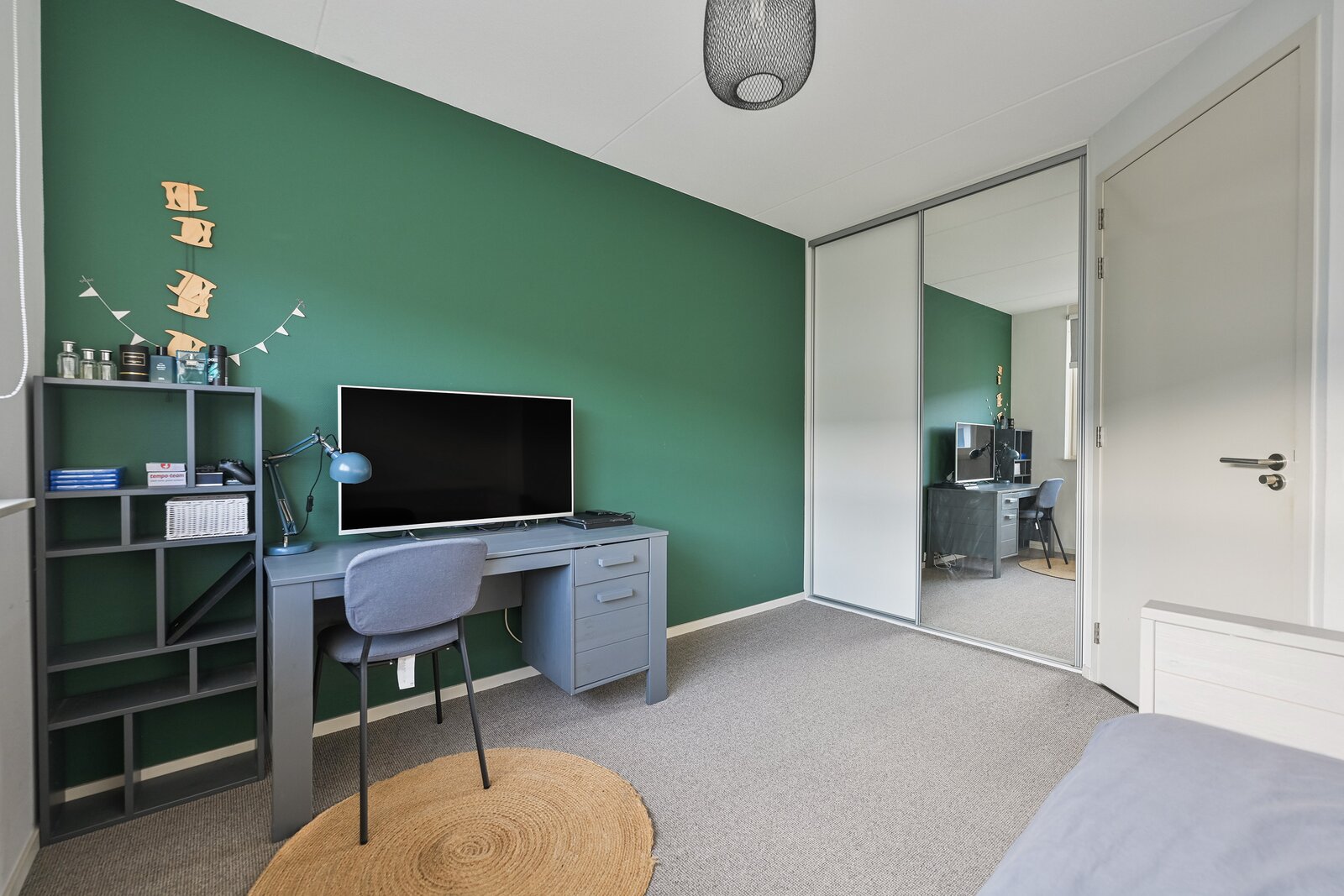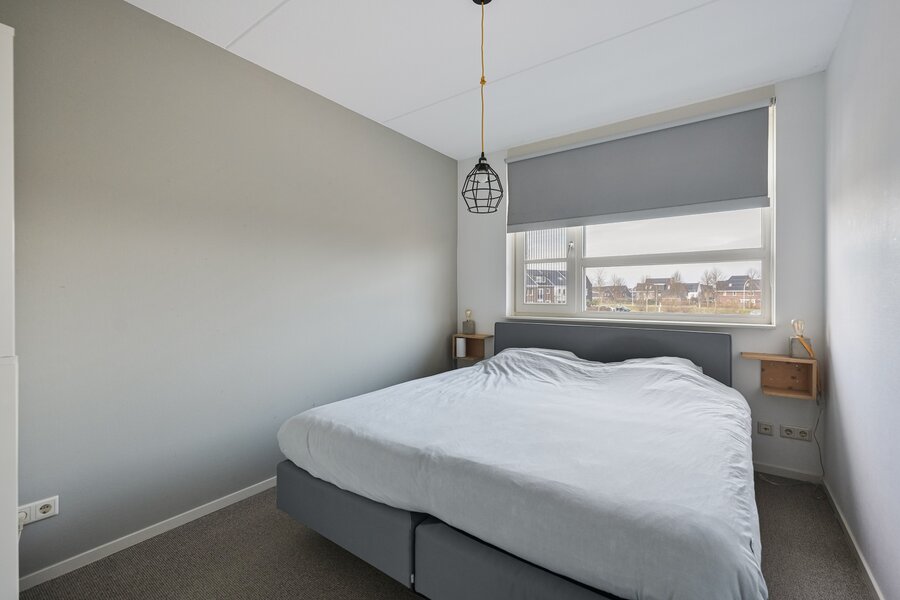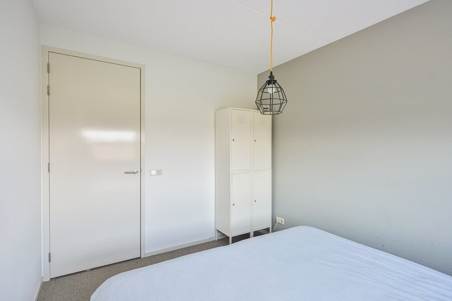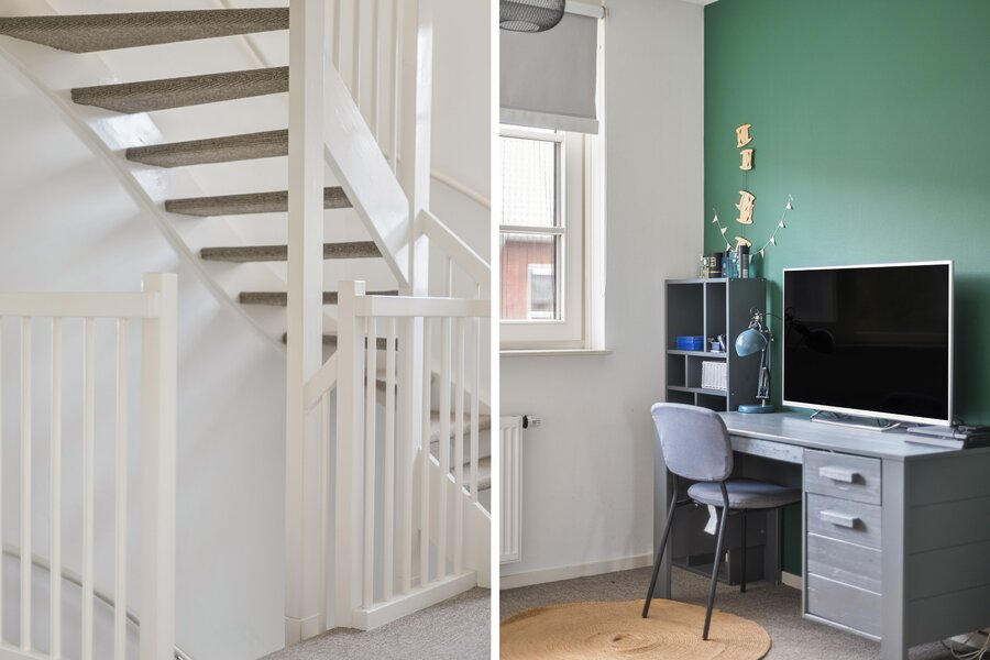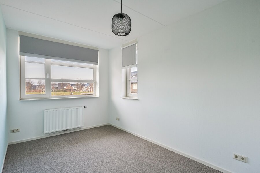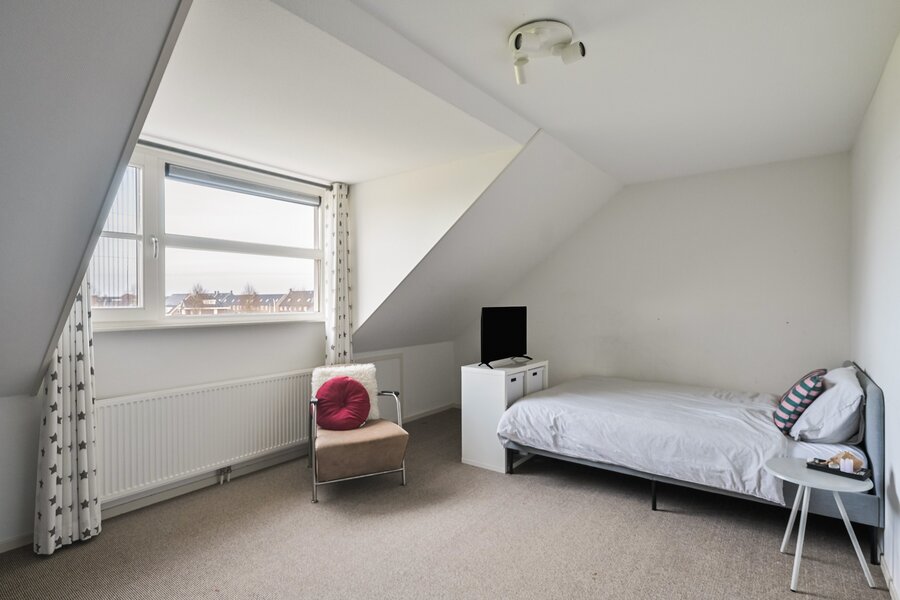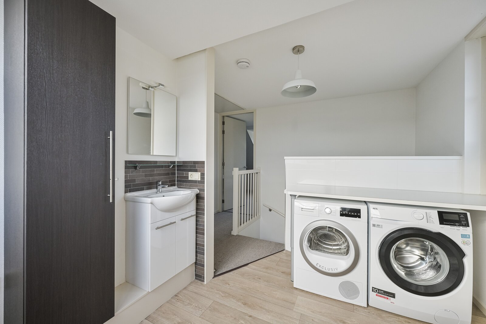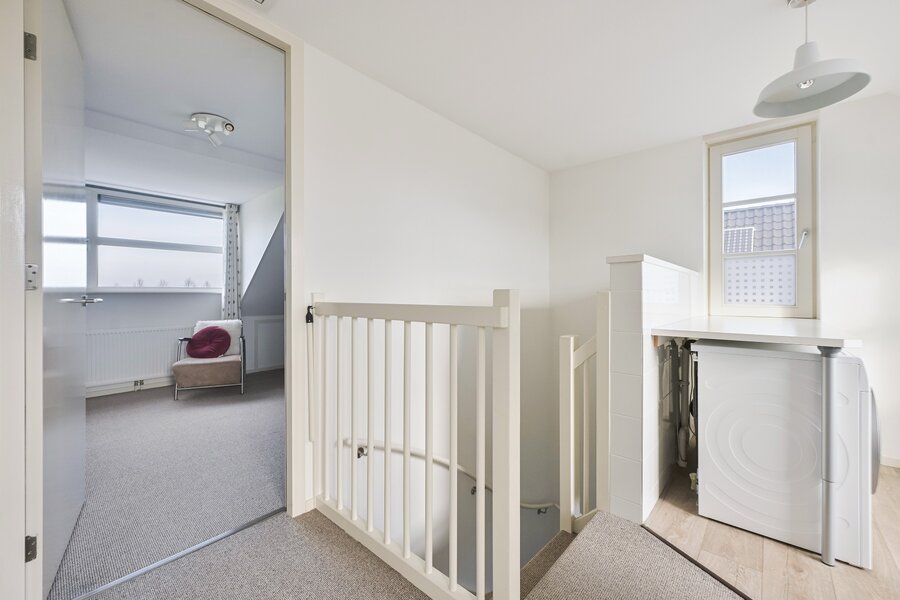Via de vaste trap kom je op de volwaardige tweede verdieping. De overloop is ruim en biedt toegang tot twee ruime slaapkamers, waarvan eentje met een grote vaste kast. Er is een separate wasruimte met de aansluitingen voor de wasmachine en de droger, de cv-opstelling en een extra wastafelmeubel met spiegel en verlichting.