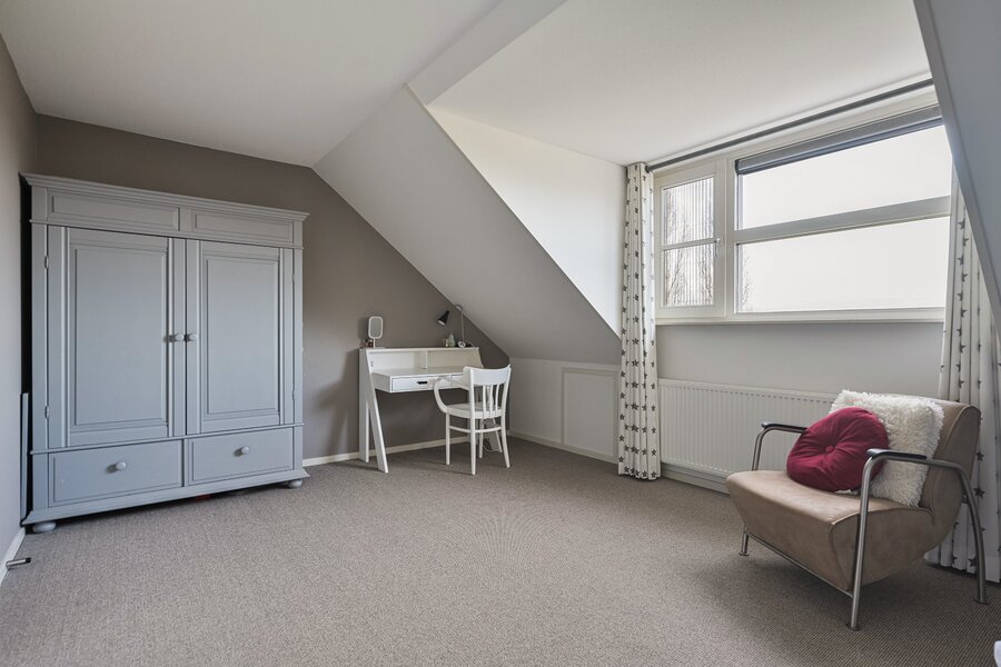Op de eerste verdieping zijn drie ruime slaapkamers, waarvan eentje met een grote vaste kast en er is een aparte walk-in-closet (of berging). De badkamer is netjes en voorzien van een inloopdouche, 2 wastafelmeubels en een tweede toilet. De vierde en vijfde slaapkamer vind je op de mooie, ruime tweede verdieping. De wasruimte is een separate plek om te wassen en te drogen en er is een extra wastafelmeubel. Boven de tweede verdieping is nog een verrassend ruime zolderberging.