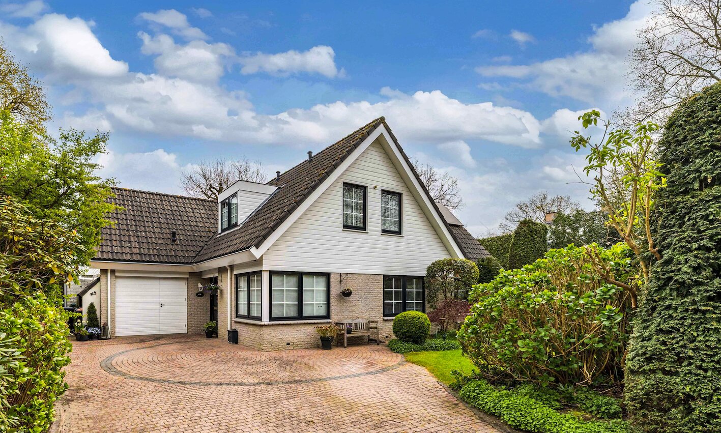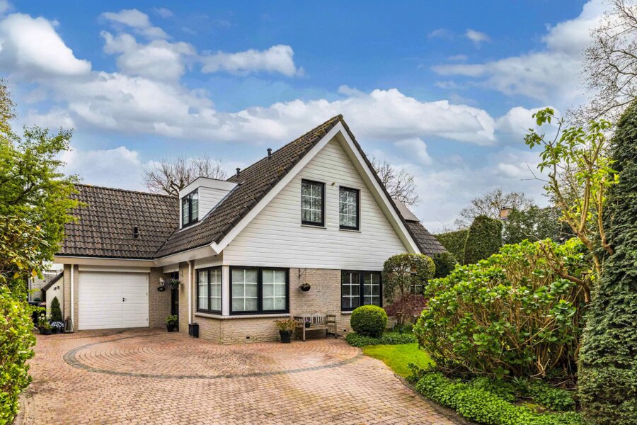 De ruime oprit en voortuin bieden parkeergelegenheid voor meerdere auto’s.