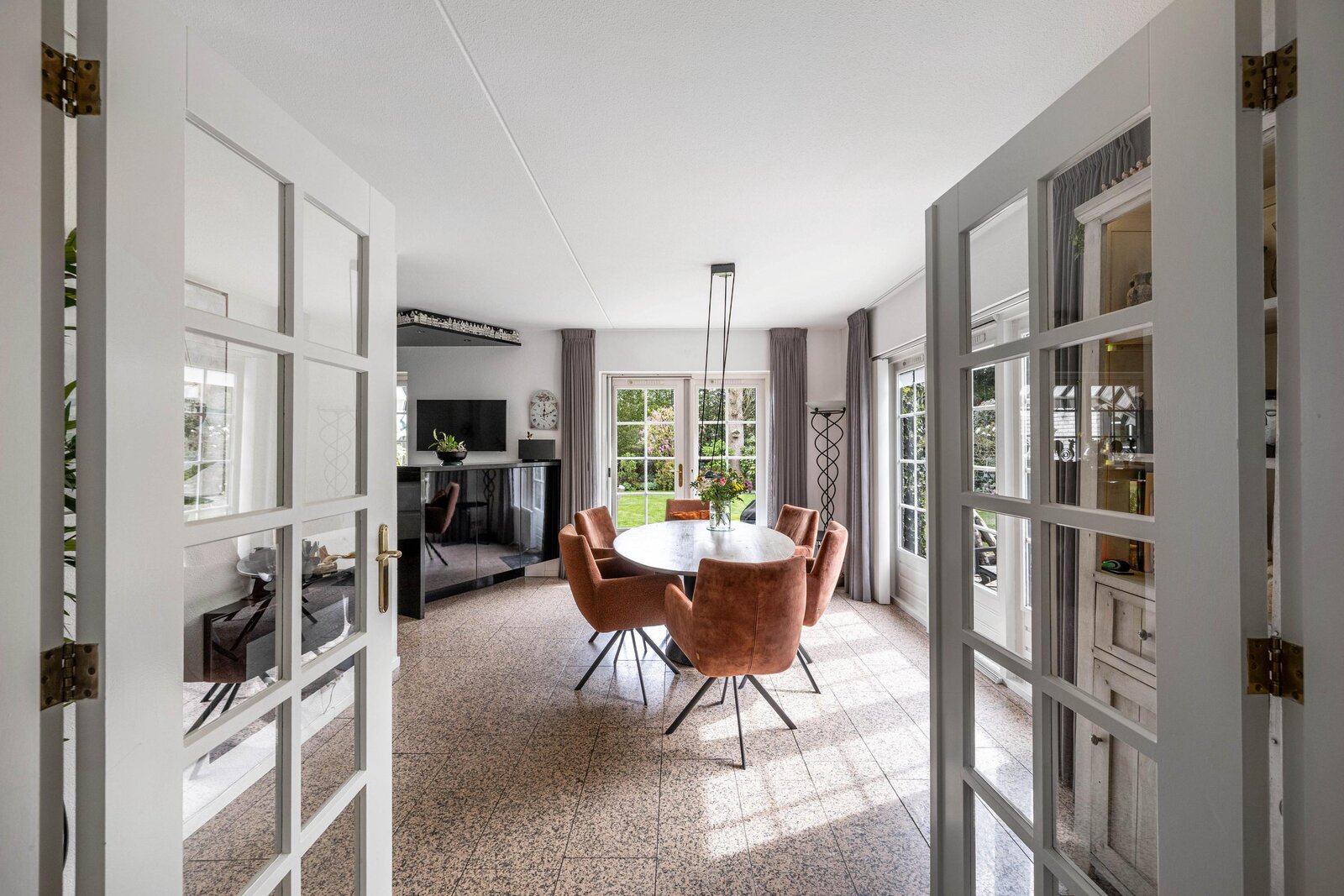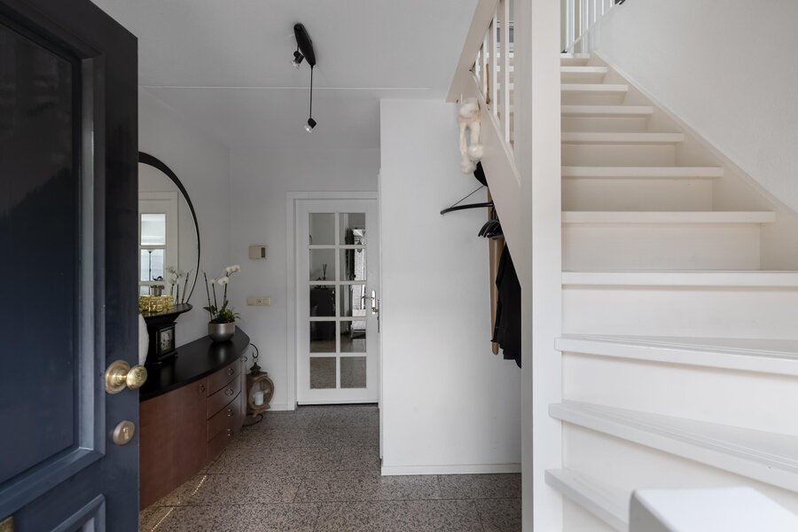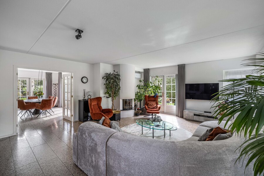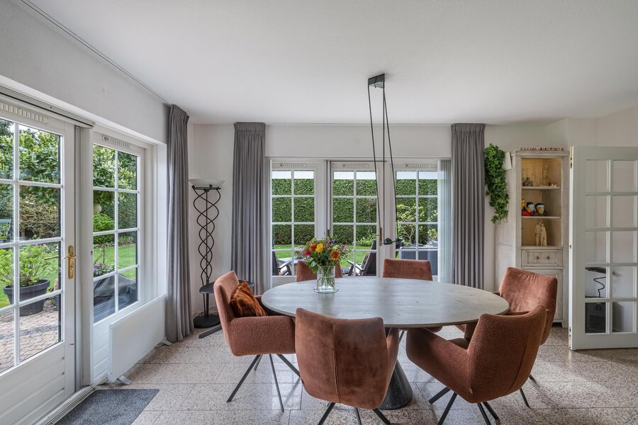 Via de ontvangsthal met garderobe en gastentoilet betreedt u de woning. De royale woonkamer met open haard vormt het warme hart van het huis en wordt aangevuld met een aparte multifunctionele werk/speelkamer. De lichte eetkamer, bereikbaar via de openslaande deuren, staat in directe verbinding met de tuin.