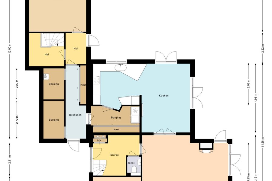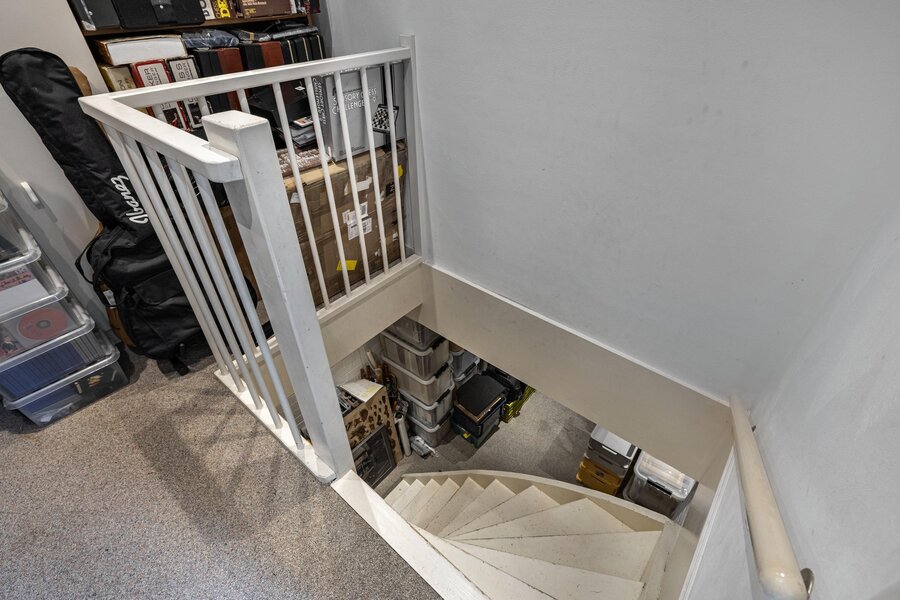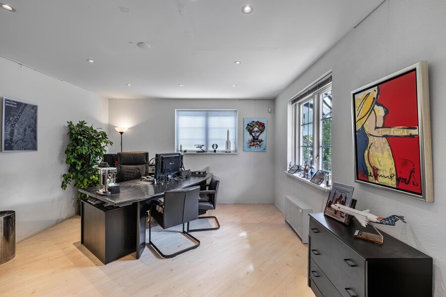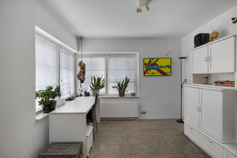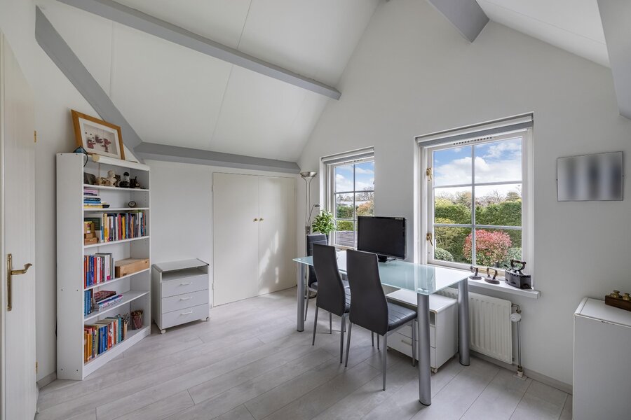 Vanuit de hal is de kantoorruimte bereikbaar, die beschikt over een eigen entree en uitzicht op de tuin. Tevens is er een separate berging met toegang tot een multifunctionele kelder.