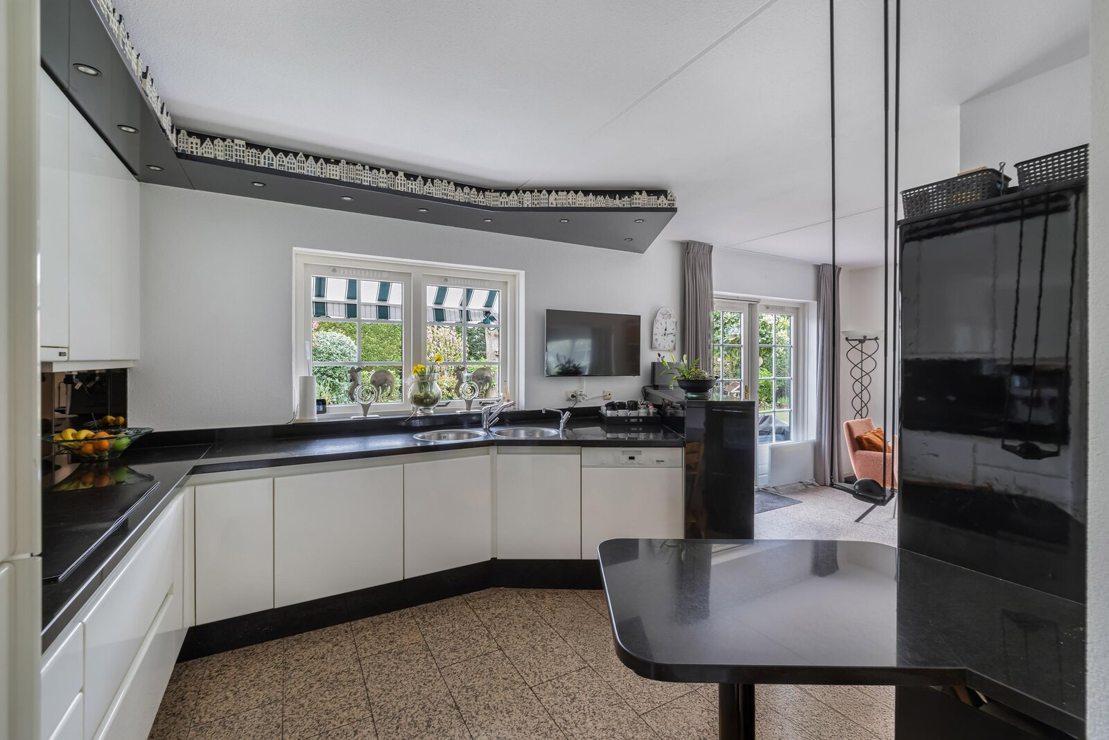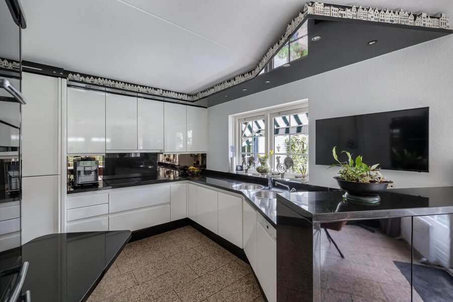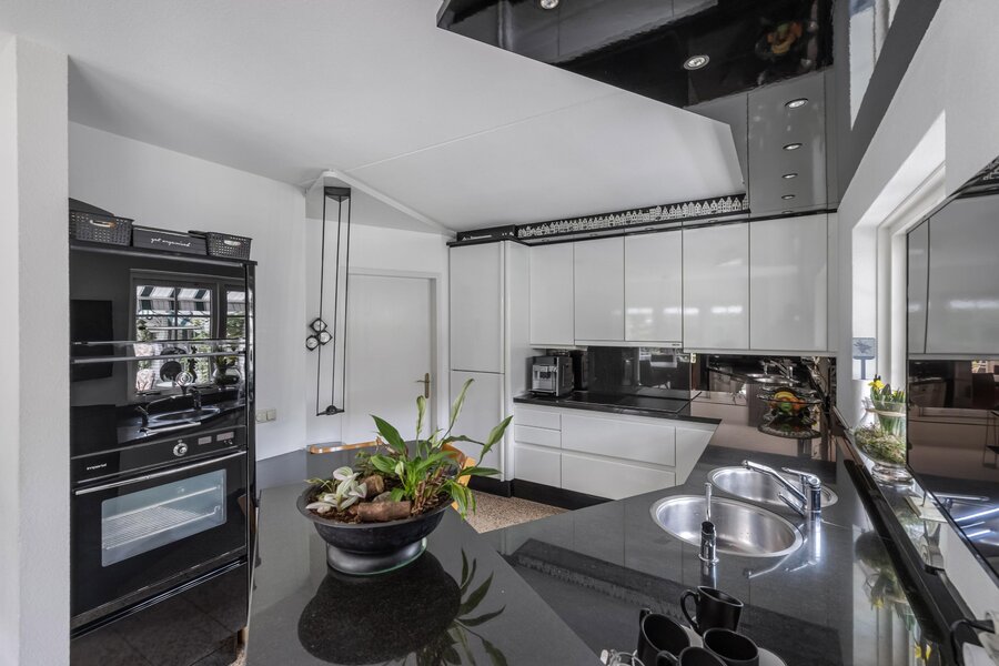 De open Siematic keuken is voorzien van een granieten werkblad, hoogwaardige inbouwapparatuur en een geïntegreerde eet-/leesplek. Aansluitend bevindt zich de praktische bijkeuken met uitgebreide kastruimte en aansluitingen voor wasapparatuur en extra koel-/vriesvoorzieningen.