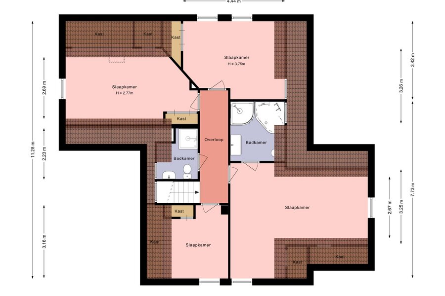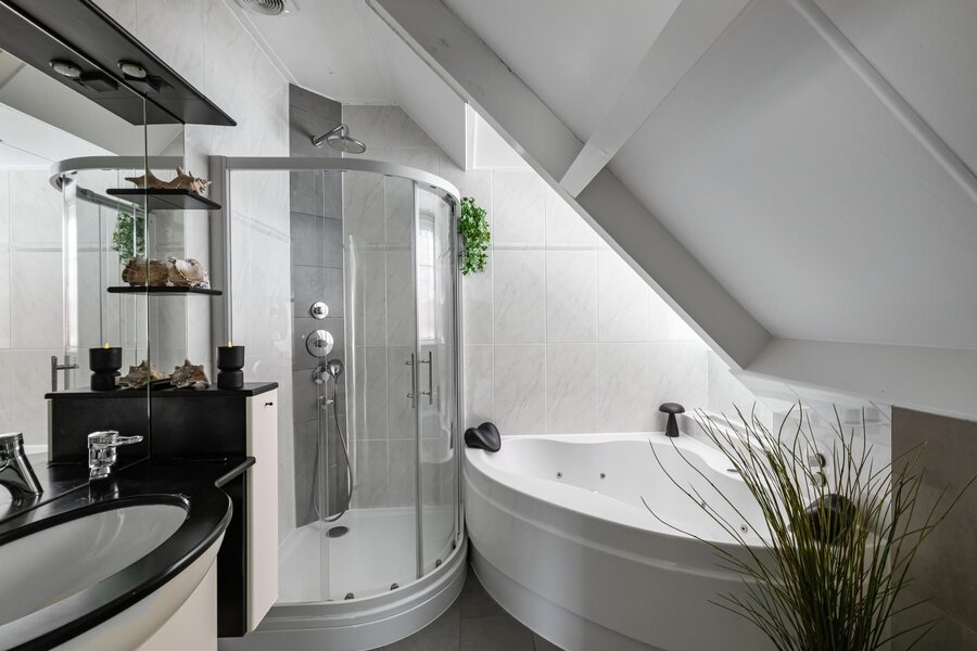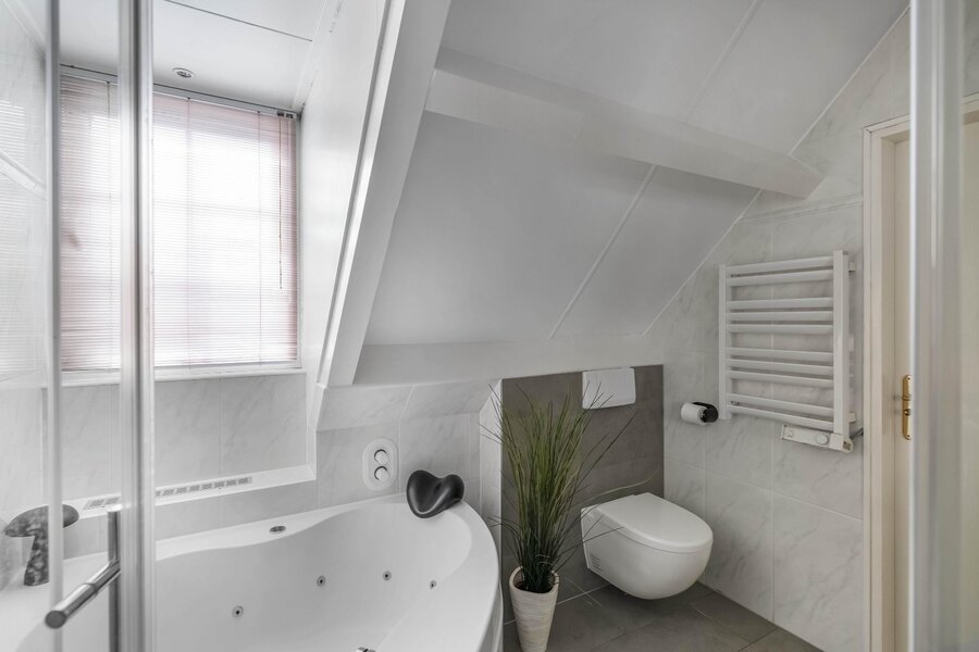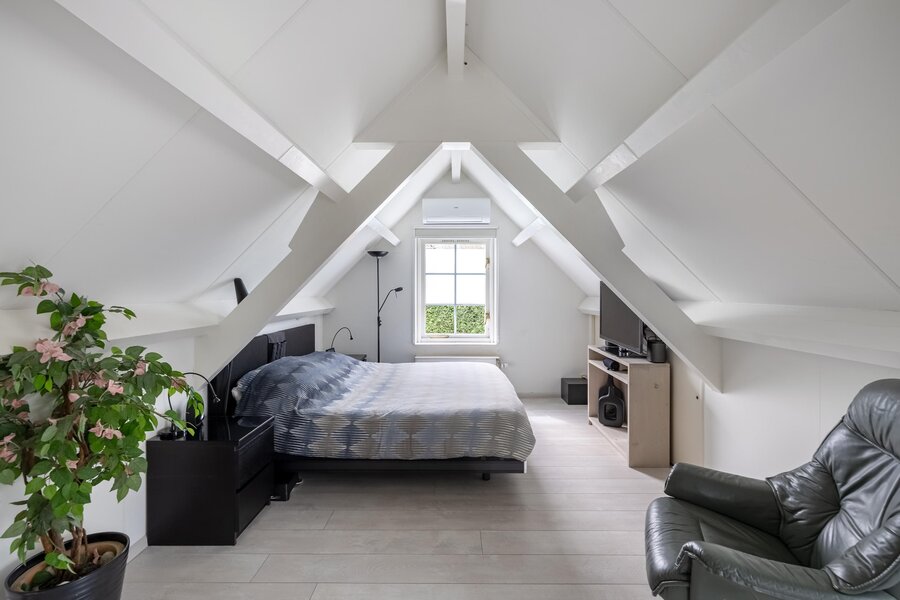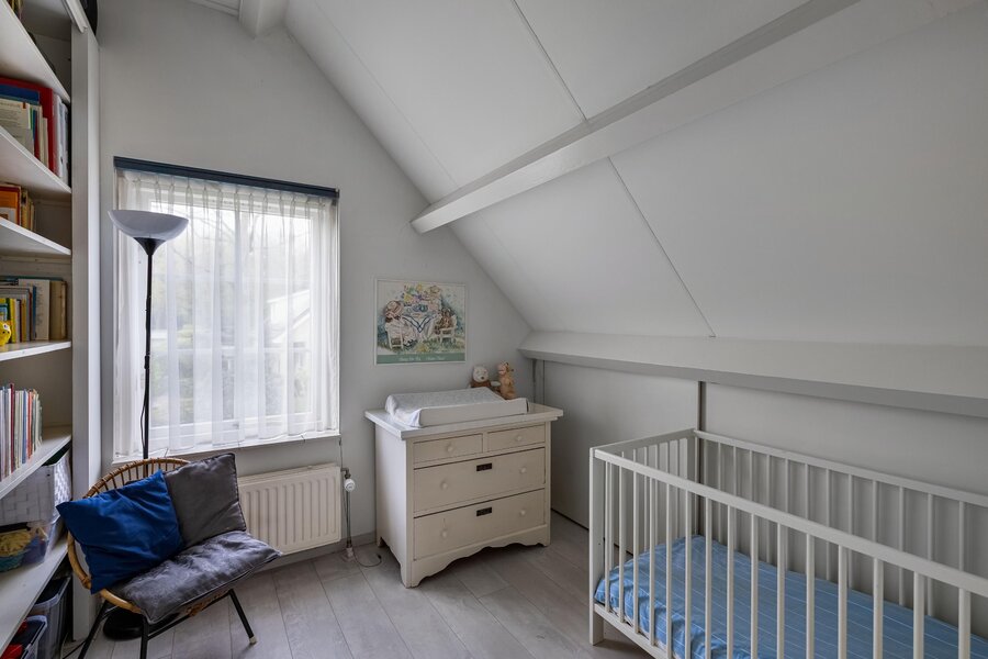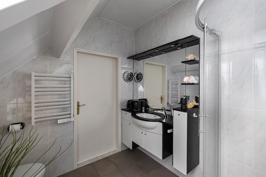 Op de bovenverdieping bevinden zich vier ruime slaapkamers, speels ingedeeld en voorzien van praktische bergruimte. De woning beschikt over twee badkamers, waarvan één is uitgerust met een bubbelbad.