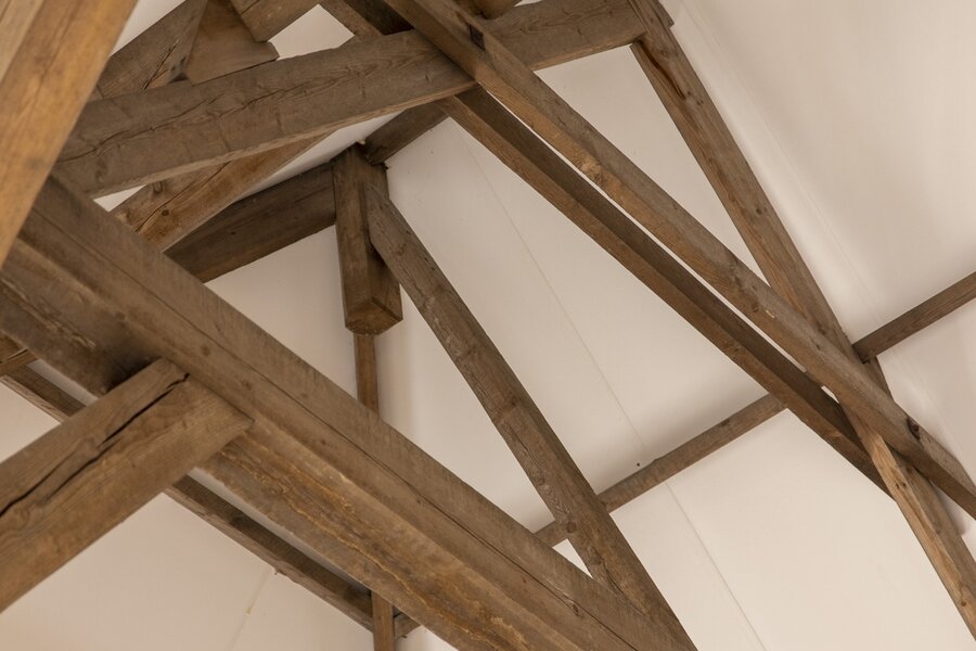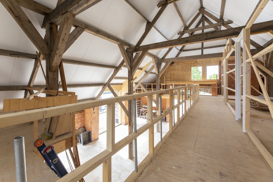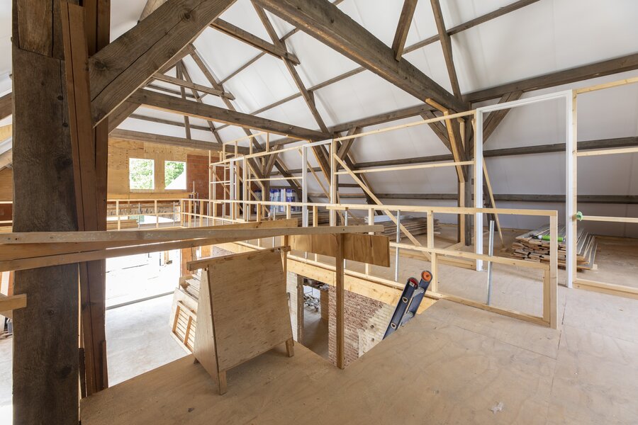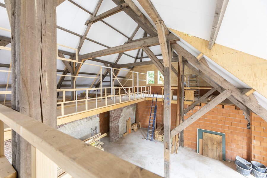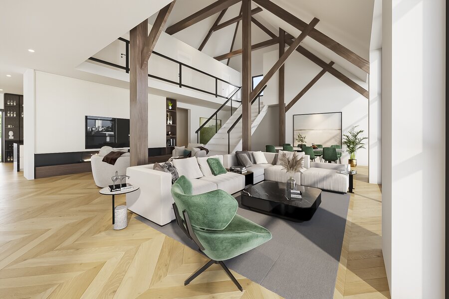 Aansluitend aan de woonkeuken ligt de imposante woonkamer. Het karakter van deze ruimte wordt bepaald door de hoge, in het zicht gelaten binten en de vide, waardoor je van de begane grond tot in de nok wegkijkt. De grote raampartijen aan de voorzijde zorgen voor overvloedig daglicht; de uitbouw met verhoogd dak voegt extra ruimtelijkheid toe. Direct grenzend aan deze leefruimte ligt de hoofdslaapkamer, met een riante inloopkast, directe toegang tot de badkamer en weids uitzicht over de landerijen.