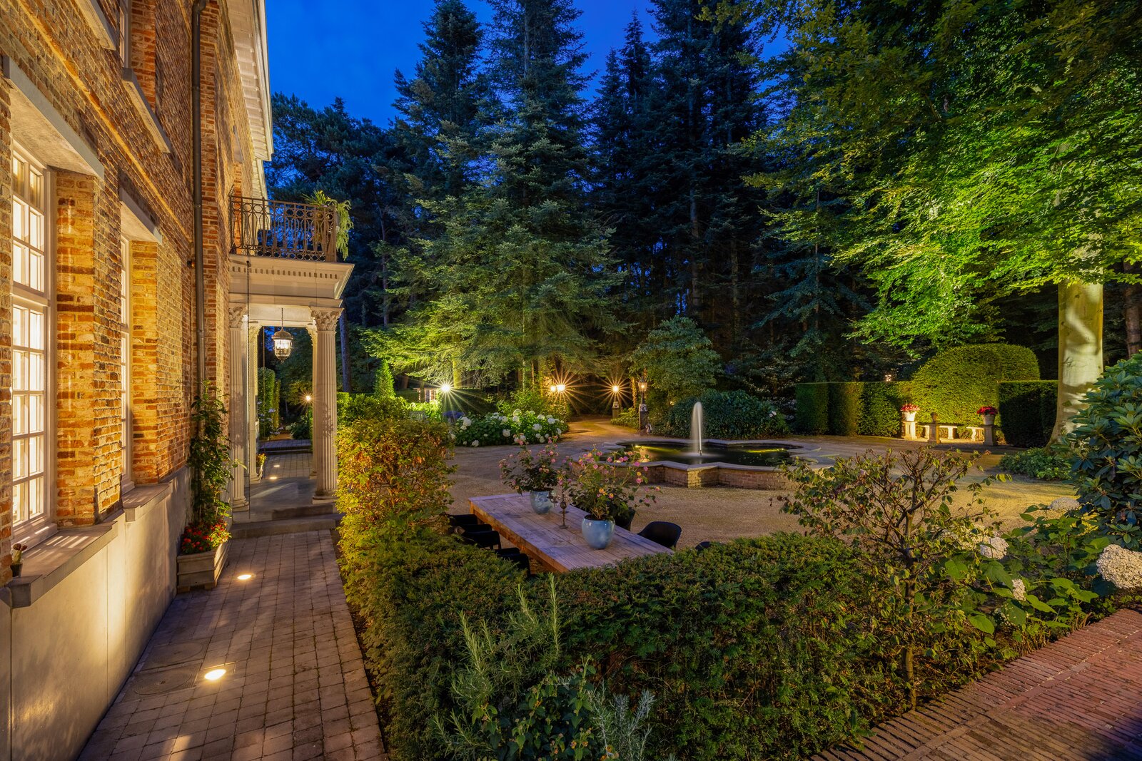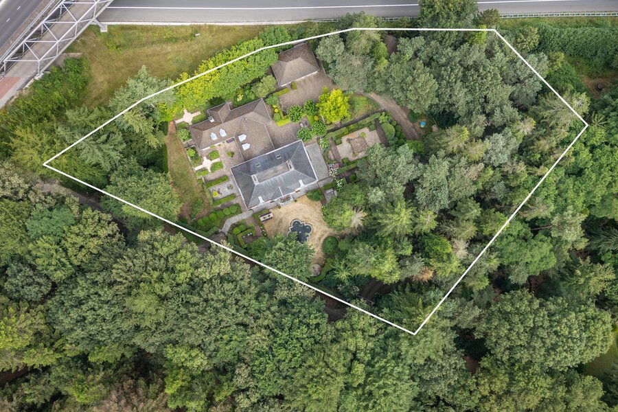 Achter een discrete entree ligt een groen domein waar de huidige eigenaren al meer dan dertig jaar in alle rust wonen. Wat begon met de oorspronkelijke woning aan de achterzijde, groeide in 2002 uit tot een imposante architectonische villa in chateaustijl aan de voorzijde — ontworpen door Vlassak-Verhulst, specialisten in hoogwaardige landhuizen en manoirs.