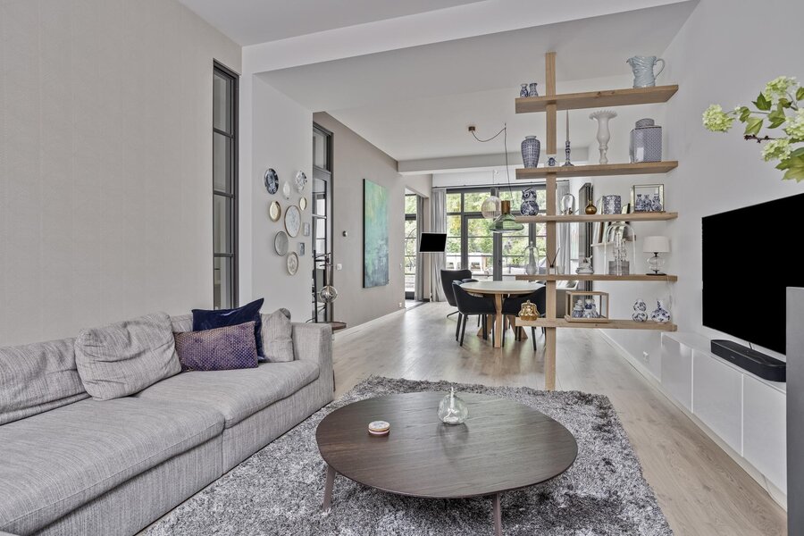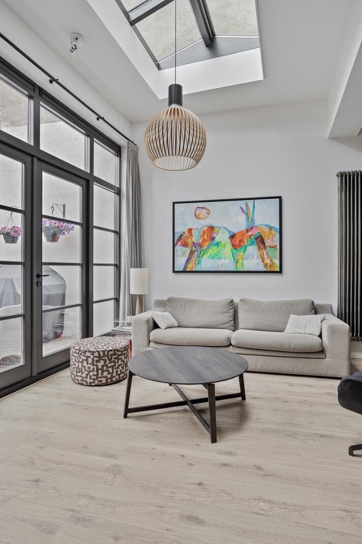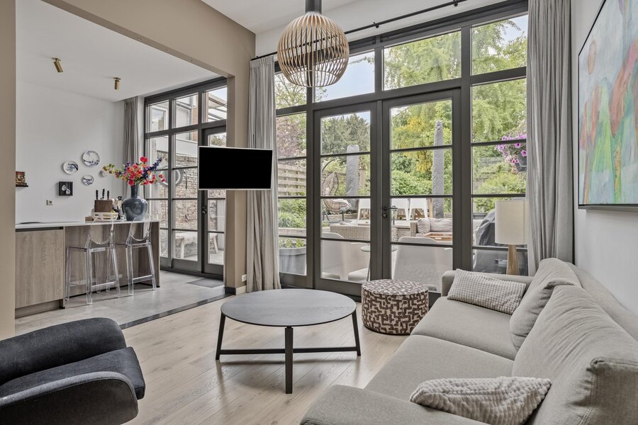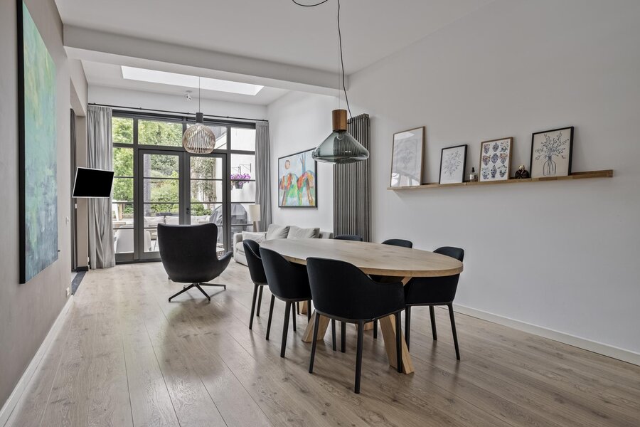 Vanuit deze stijlvolle entree ontvouwt zich het hart van het huis: een verrassend ruime en sfeervolle living. De kamer is opgedeeld in drie zones die naadloos in elkaar overvloeien, een zitgedeelte aan de voorzijde met open haard, een gezellige eetruimte in het midden en een tweede living aan de achterzijde. Dankzij de grote raampartijen en de lichtkoepel baadt de hele ruimte in natuurlijk licht, wat de houten vloer extra warmte en diepte geeft. Openslaande deuren verbinden de leefruimte met de tuin, waardoor binnen en buiten subtiel in elkaar overlopen.