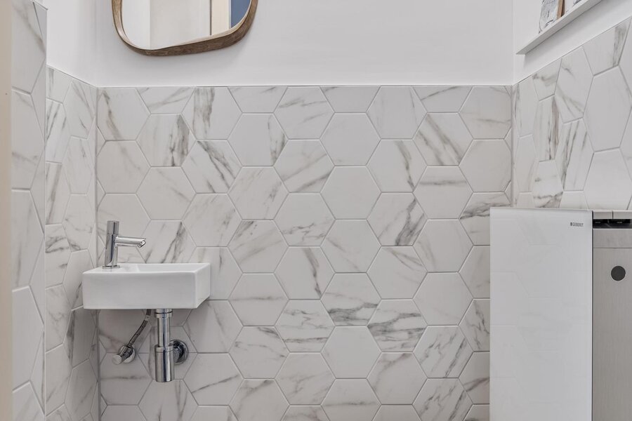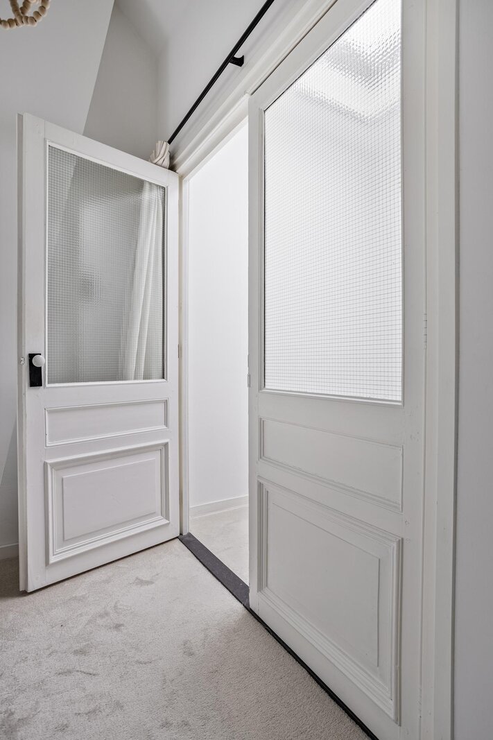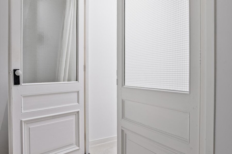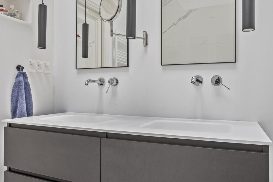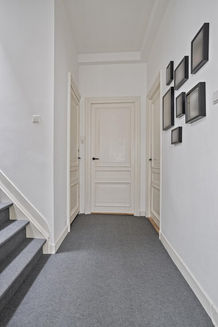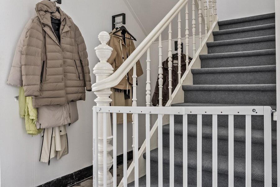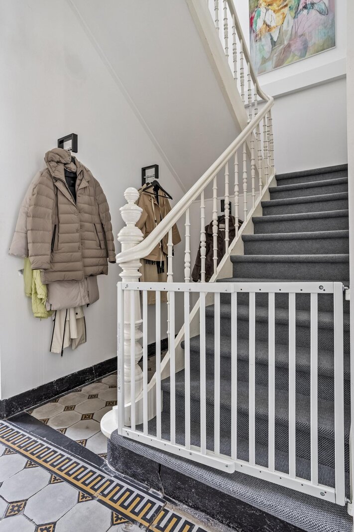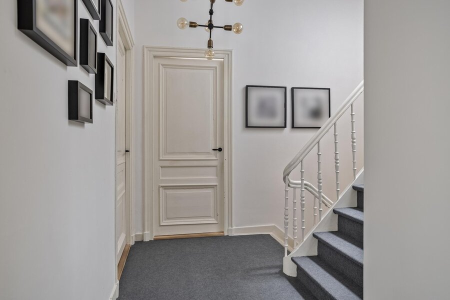 Zodra je de hal betreedt, voel je de harmonie tussen oud en nieuw. De afwerking is modern, maar de oorspronkelijke sfeer is behouden gebleven zoals onder meer te zien is aan de authentieke tegelvloer.