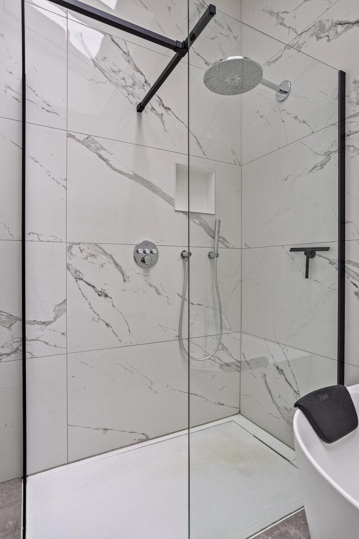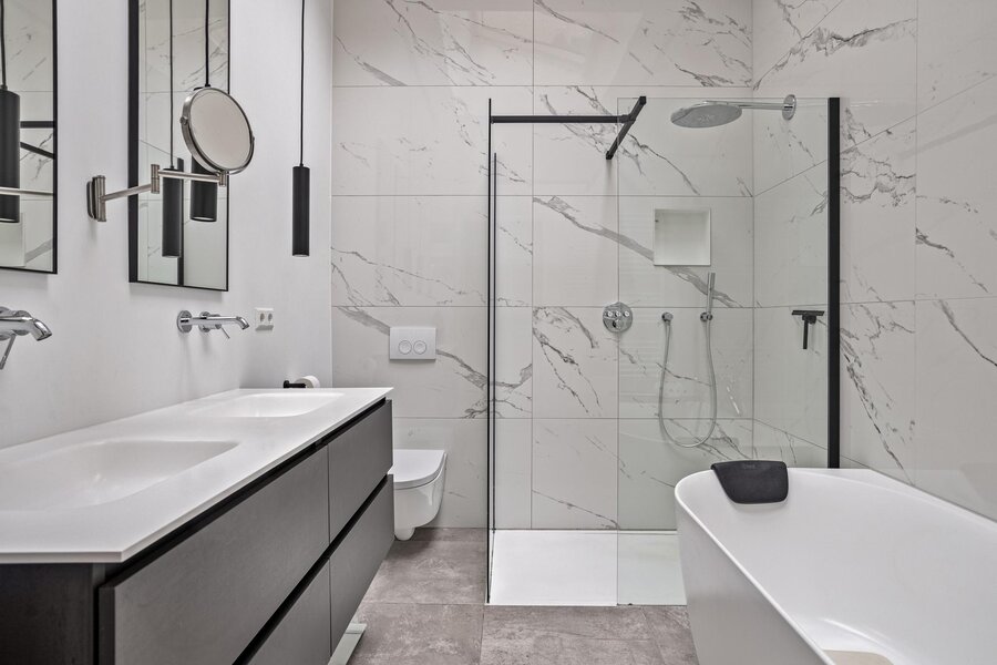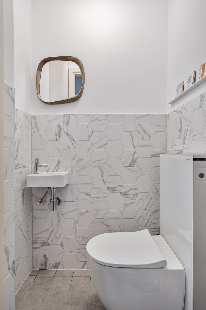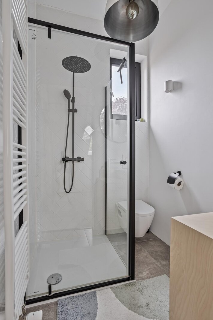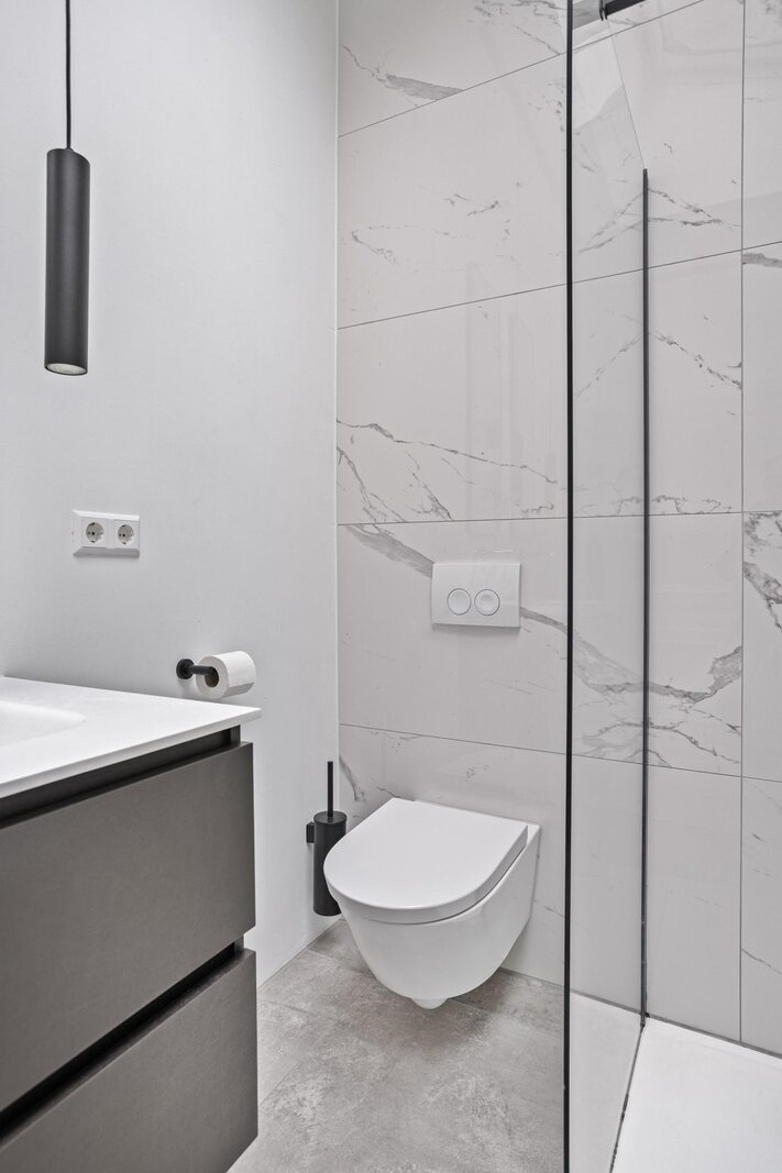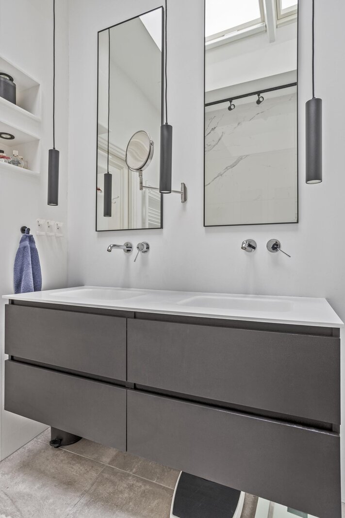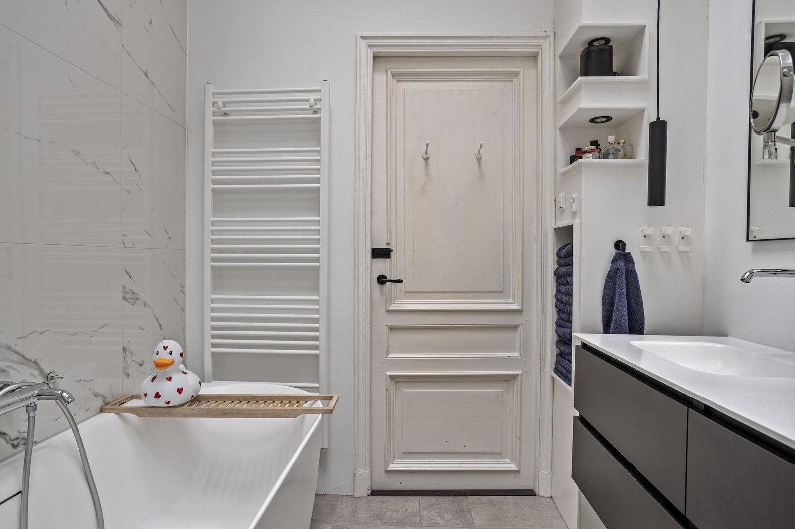 Zodra je de hal betreedt, voel je de harmonie tussen oud en nieuw. De afwerking is modern, maar de oorspronkelijke sfeer is behouden gebleven zoals onder meer te zien is aan de authentieke tegelvloer.