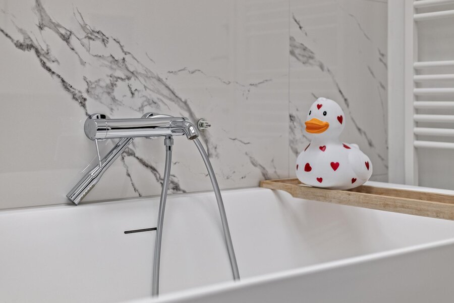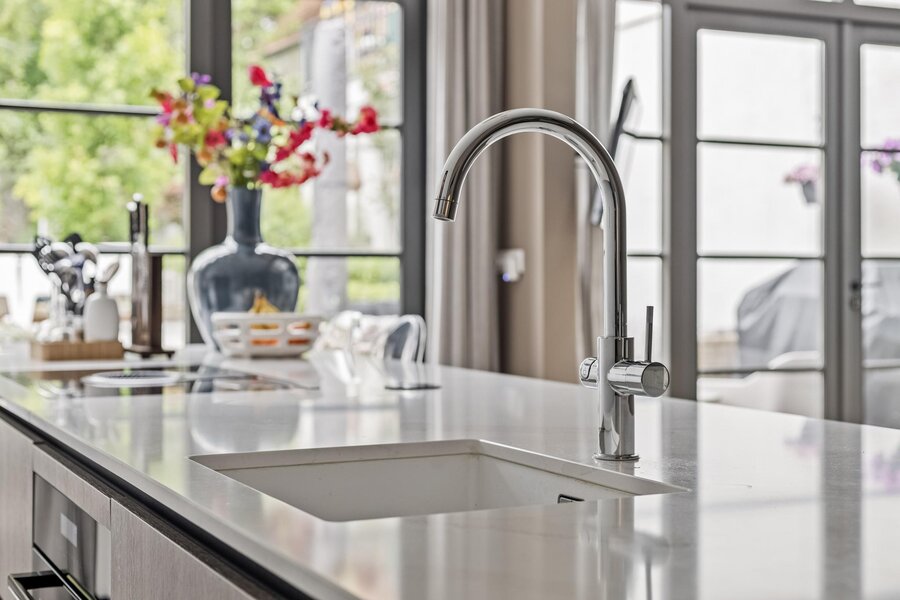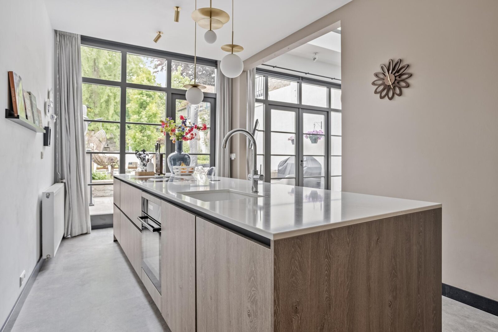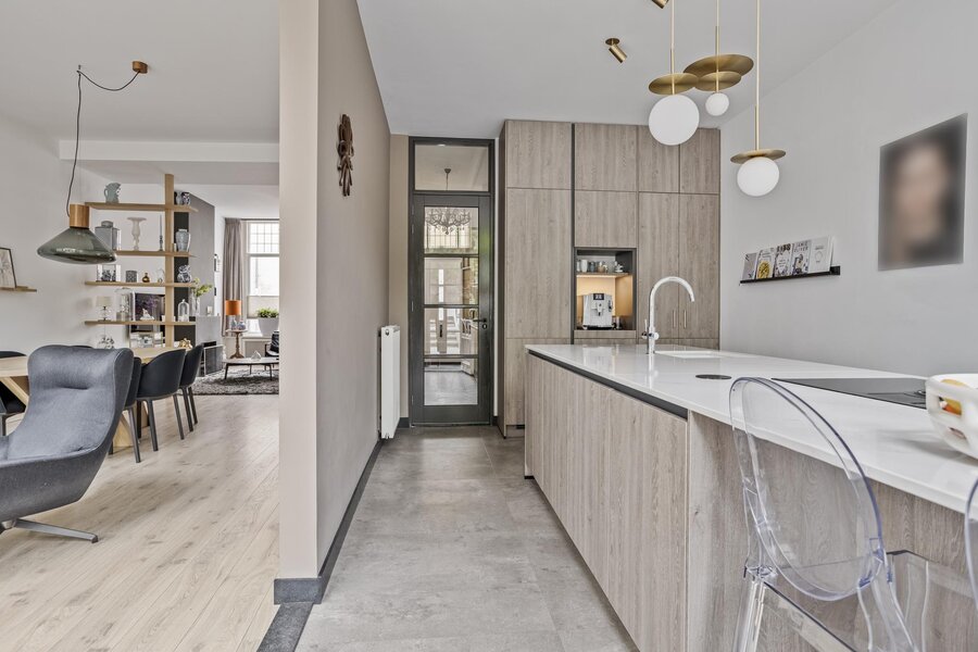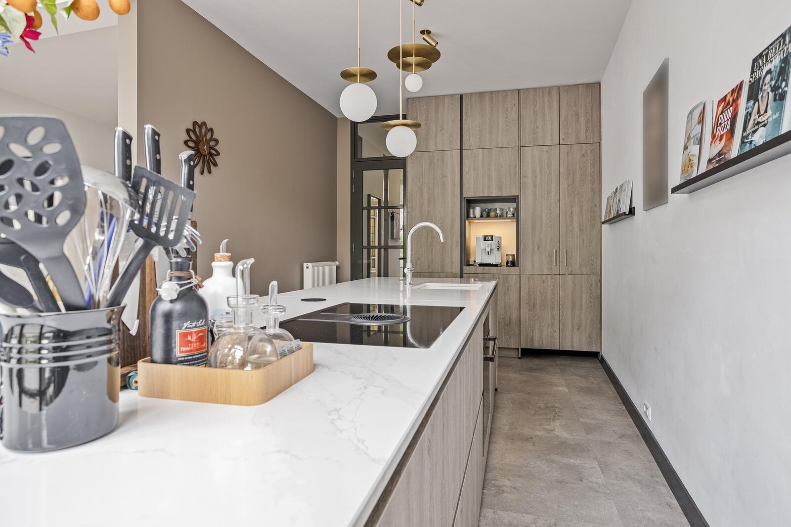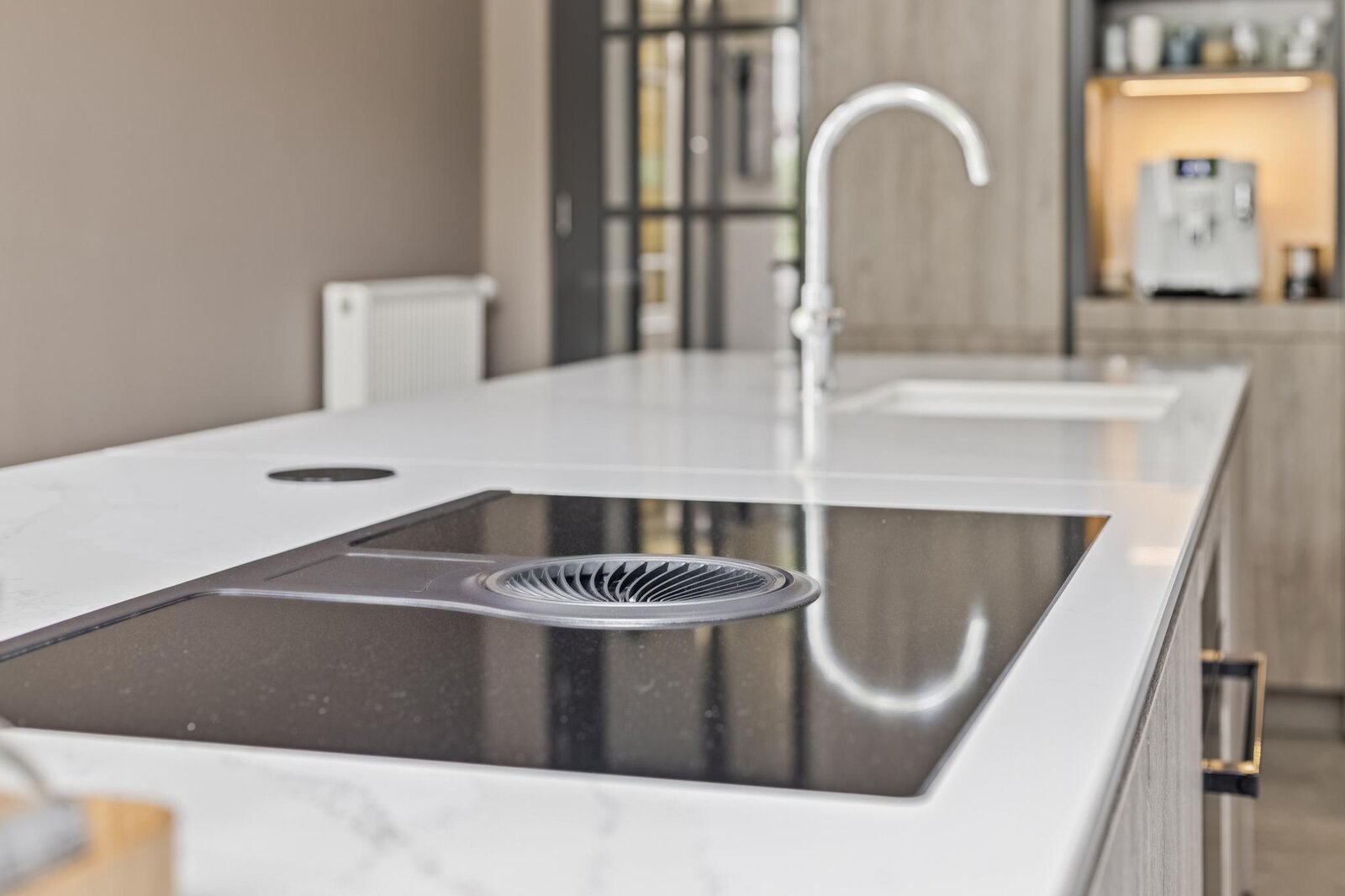 De keuken, vernieuwd in 2023, is een droom voor wie houdt van luxe en stijl. Een riant kook- en spoeleiland in warme houttinten, afgewerkt met een marmeren blad, vormt het imposante middelpunt. Voorzien van de nieuwste apparatuur, waaronder een geïntegreerde inductiekookplaat met afzuiging, een Quooker, combi-oven en een stille vaatwasser, biedt deze keuken niet alleen schoonheid maar ook pure functionaliteit.