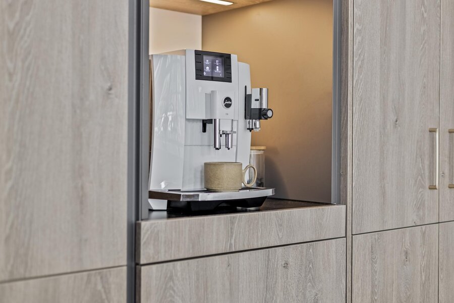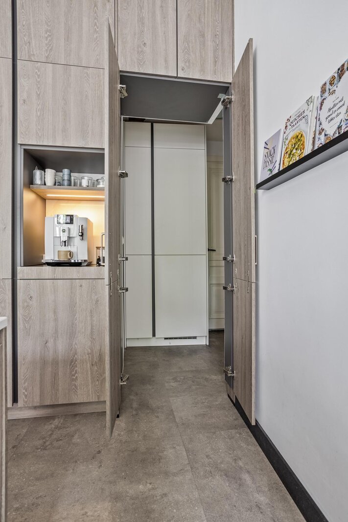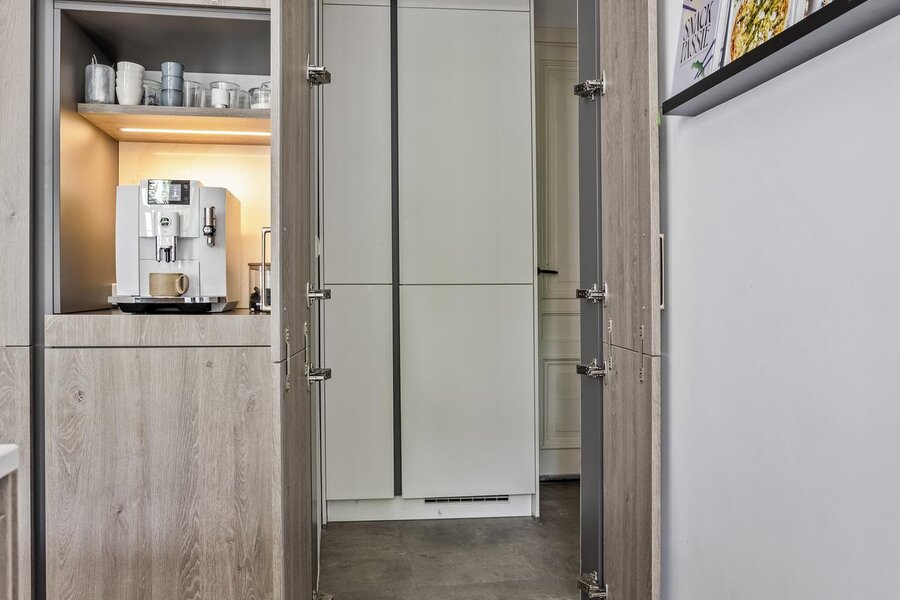 Rondom het eiland nodigen barkrukken uit tot lange avonden met een goed glas wijn. Aan de zijkant van de keuken bevinden zich hoge kasten tot aan het plafond. De ingebouwde koffiecorner zorgt voor sfeer en maakt het geheel compleet.