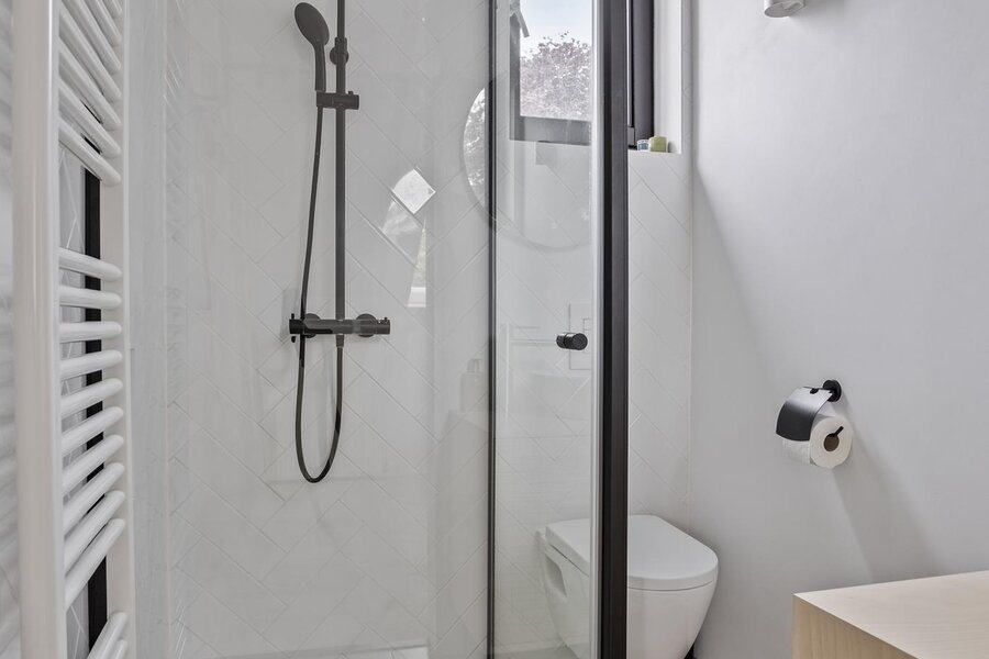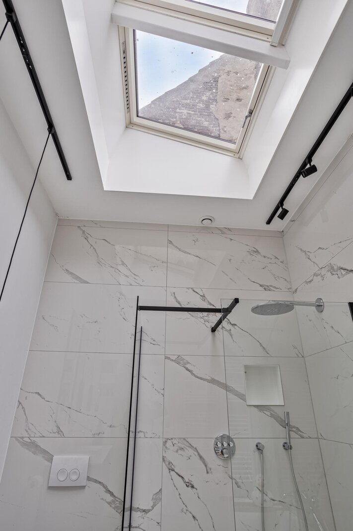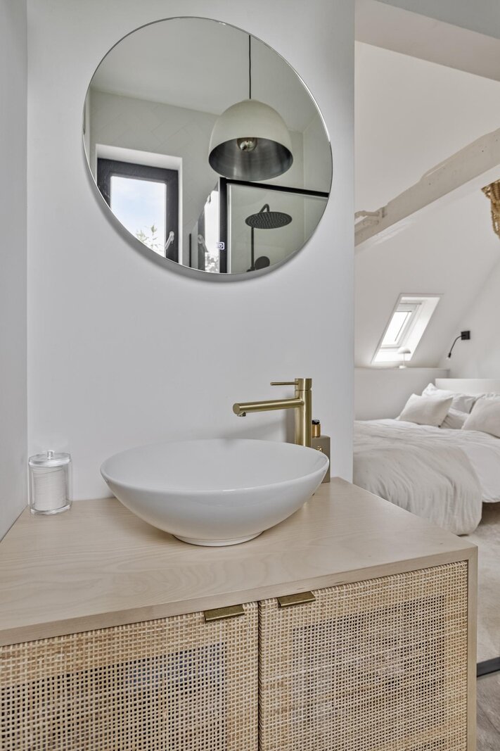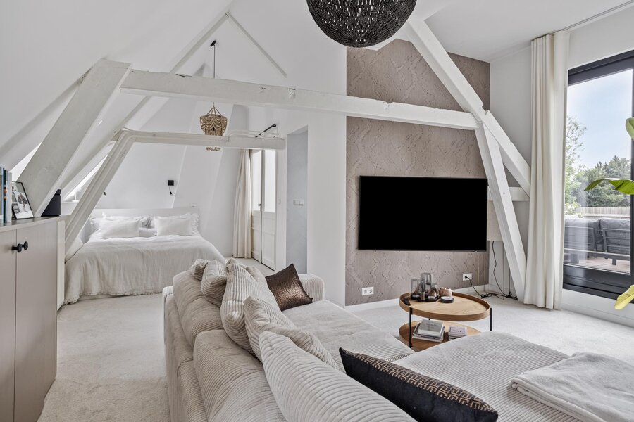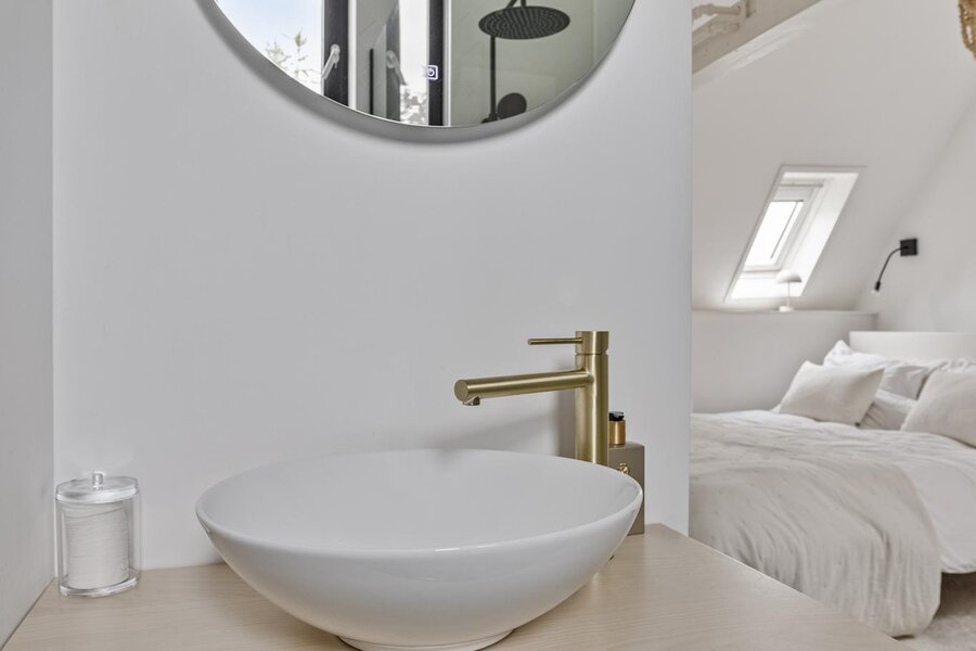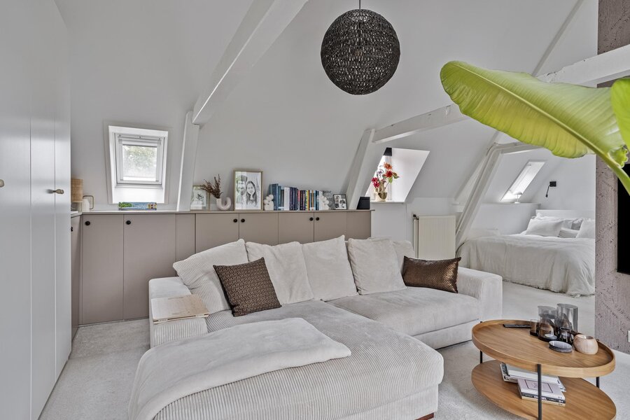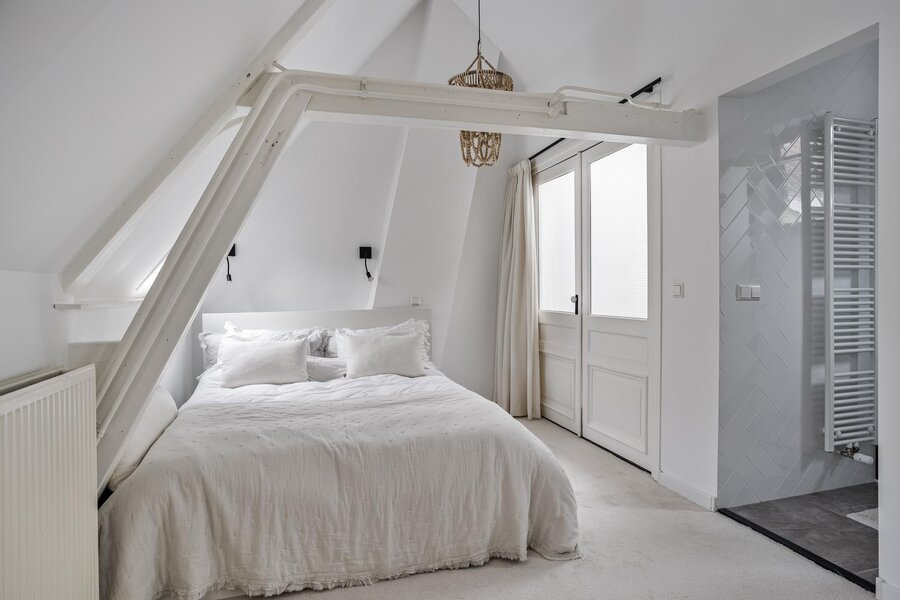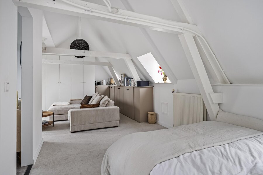 Een serene oase die aanvoelt als een luxe hotel suite. De lichte kleuren, de houten balken en de slimme indeling creëren een gevoel van rust en geborgenheid. Hier vind je niet alleen een riante slaapkamer, maar ook nog een aparte zithoek, een badkamer en toegang tot een royaal dakterras. Een privéplek waarvan je bijna kunt spreken van een apart appartement an sich, waar je in alle rust de zon ziet ondergaan boven de stad.