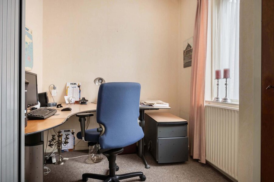 Begane grond: entree, hal met vide, meterkast en toiletruimte. Vanuit de hal heeft men toegang tot de woonkeuken met diverse inbouwapparatuur. Ruime L-vormige woonkamer met gashaard plavuizenvloer en schuifpui naar de tuin en het terras. Doorloop naar werkkamer.