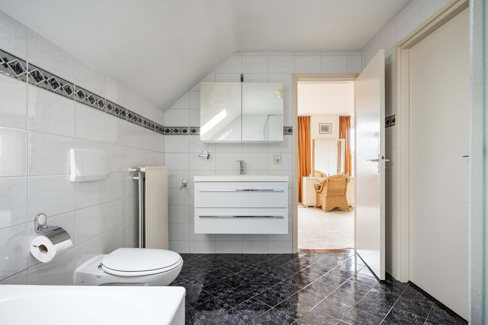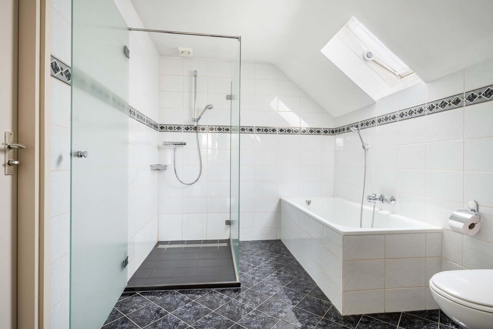 1e Verdieping: overloop, 3 ruime slaapkamers en een badkamer met ligbad separate douche, wandcloset en wastafelmeubel.