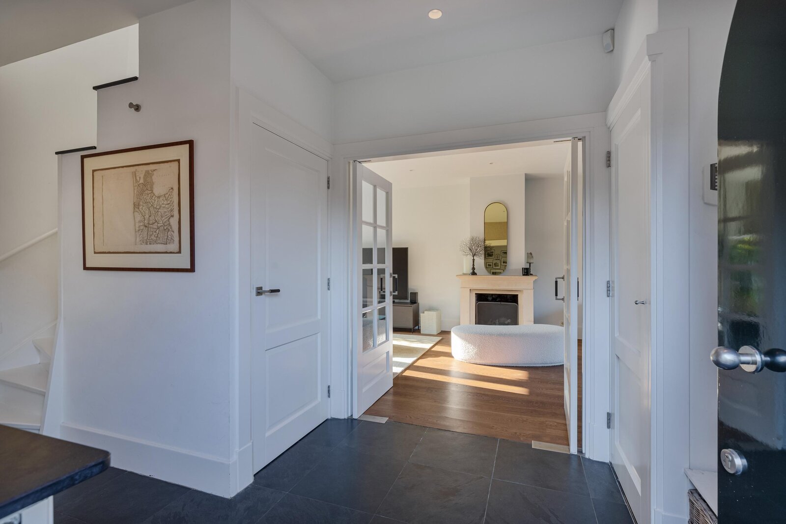 Woonkamer beschikt over een open haard, twee zithoeken, een half open werkkamer met uitzicht op de ruime voortuin en openslaande deuren naar de achtertuin.