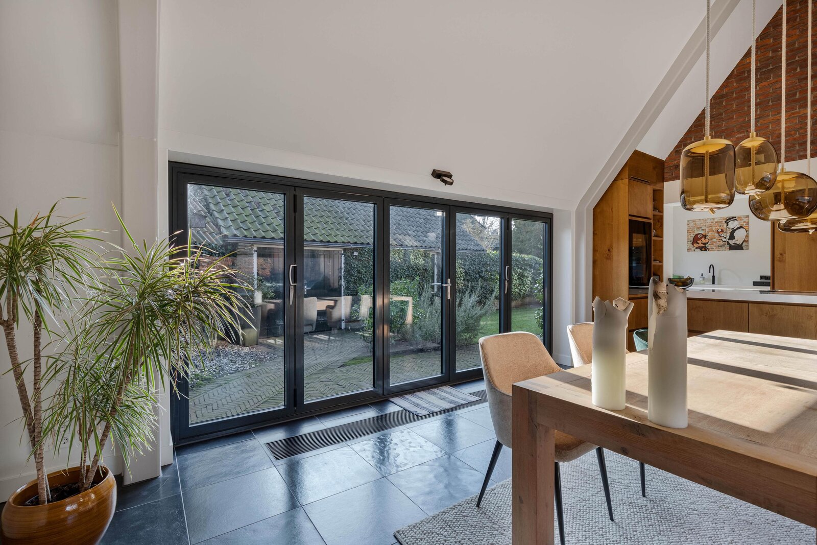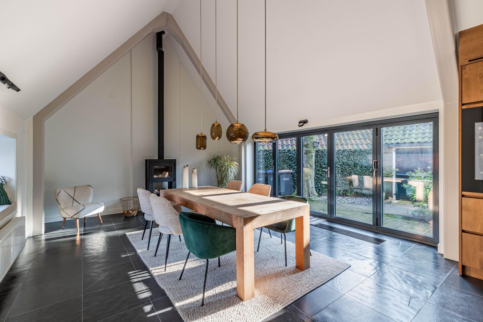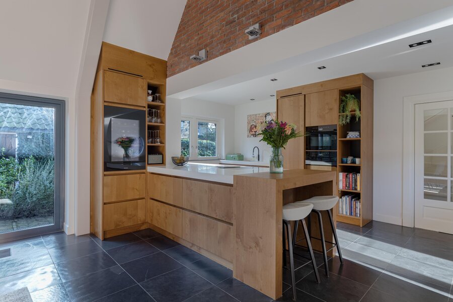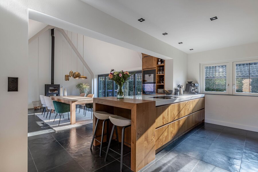 Vanuit de hal is de in 2019 aangebouwde ruime keuken te betreden. Deze keuken heeft een prachtige uitstraling, hoog plafond, warme houtkachel en een schuifpui over de gehele lengte aan de tuinzijde. Door gebruik van moderne techniek beschikt het raam naar de voortuin over elektrisch geblindeerd glas.