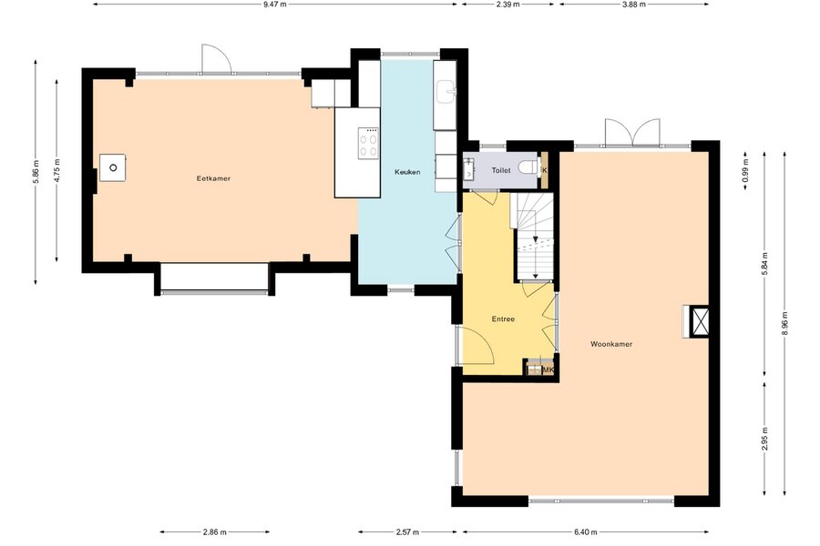 Entree, Hal, trap naar de kelder, modern toilet met fontein, openslaande deuren naar de woonkamer.