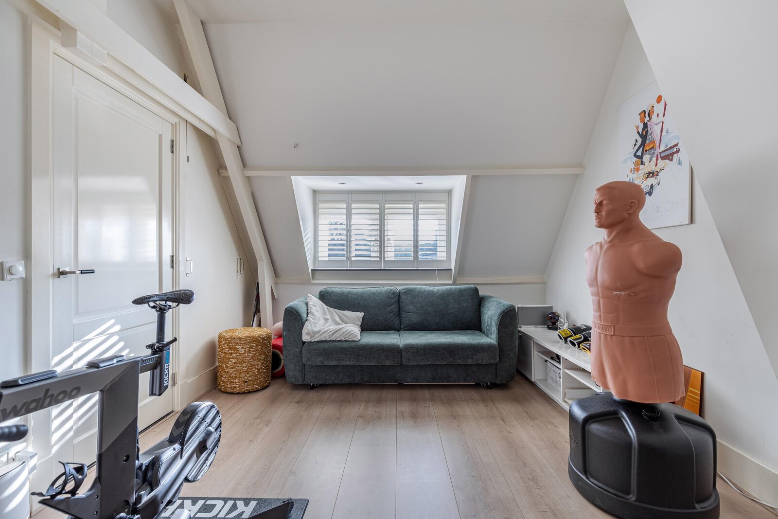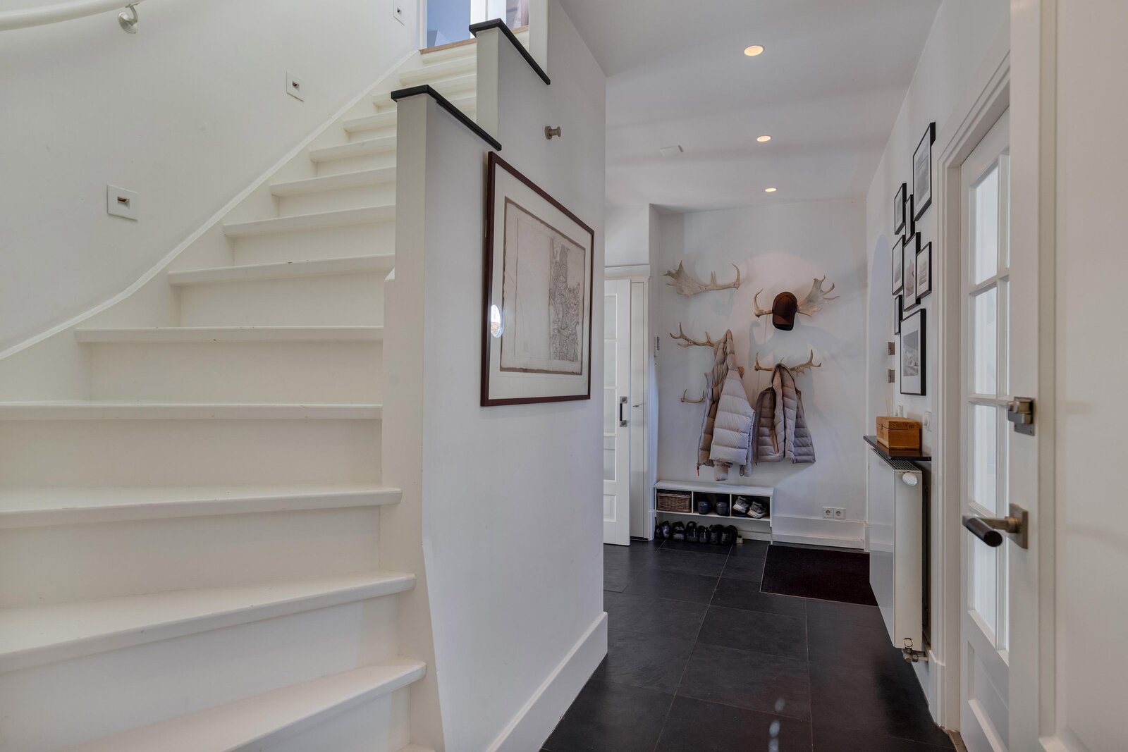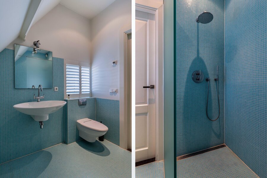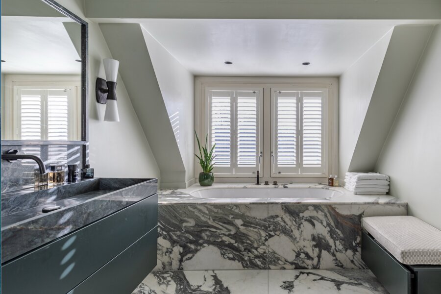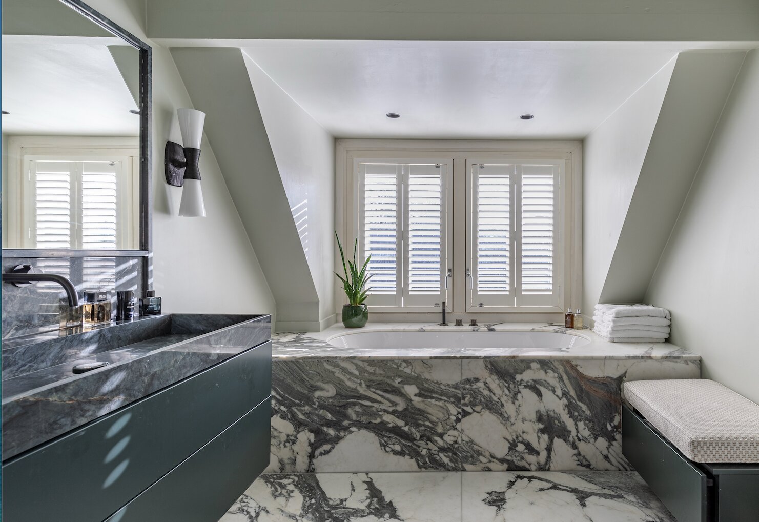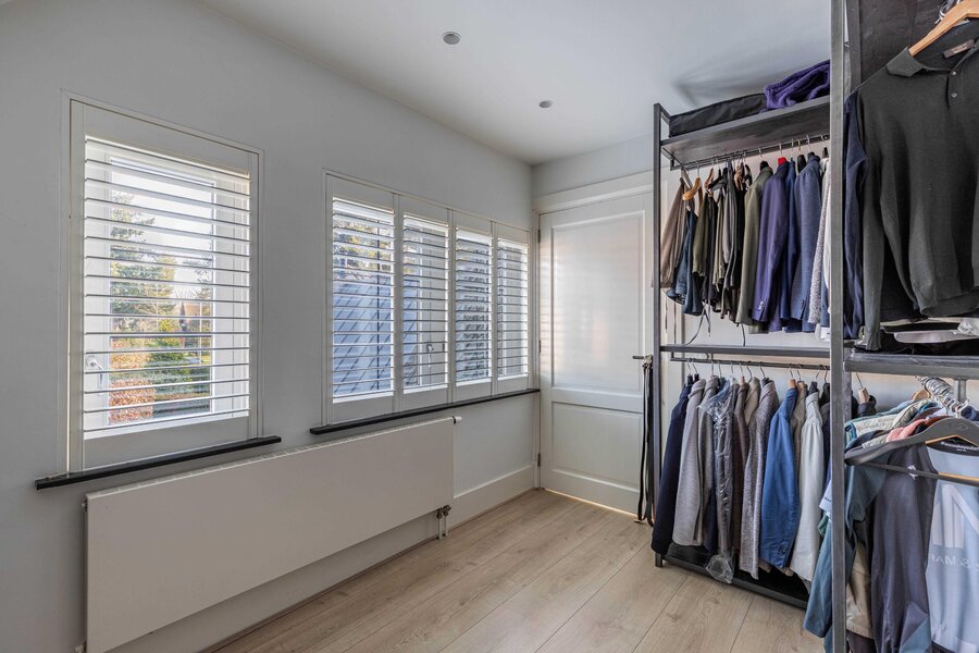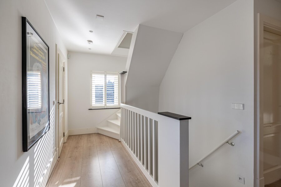 Overloop, ruime slaapkamer aan de achterzijde met airco en inbouwkast, ruime slaapkamer met doorloop naar een inloopkast, voorheen een slaapkamer. Gemoderniseerde badkamer uit 2022 met vloerverwarming, een heerlijk ligbad, wastafelmeubel, inloopdouche, toilet en handdoekradiator. De vloer en wanden zijn in Arabescato Verde marmer en quartz uitgevoerd.