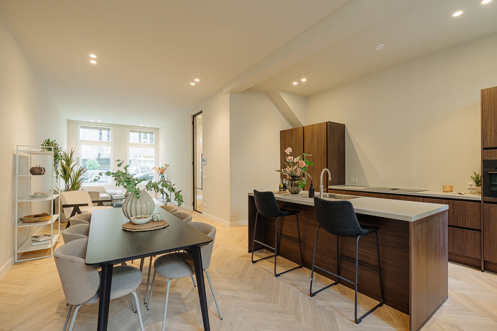 Eigen entree op de begane grond. De hal leidt naar de ruime woonkamer met open keuken, die zich aan de voorzijde van het appartement bevindt. De moderne keuken is voorzien van alle benodigde inbouwapparatuur en heeft een spoeleiland.