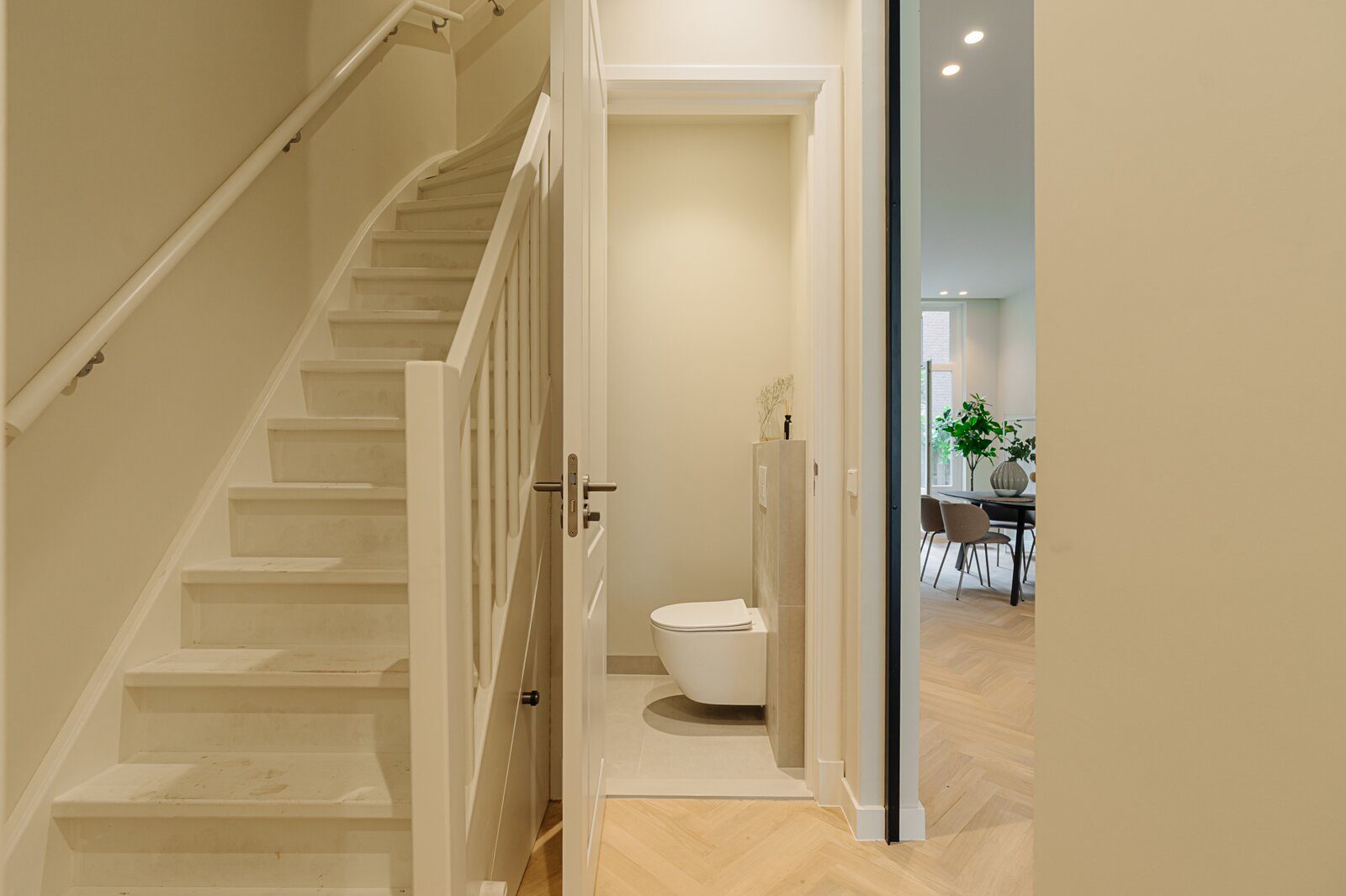 Tevens bevindt zich in de hal een separate wc en een trapkast.